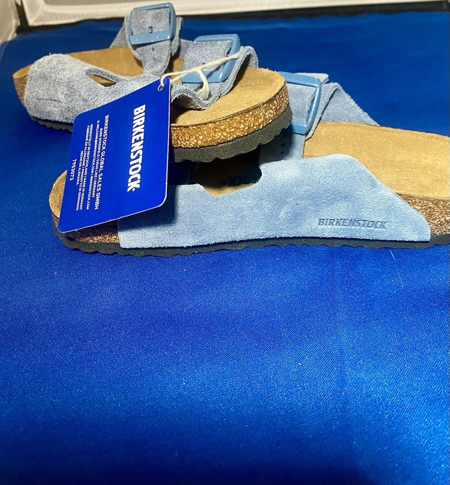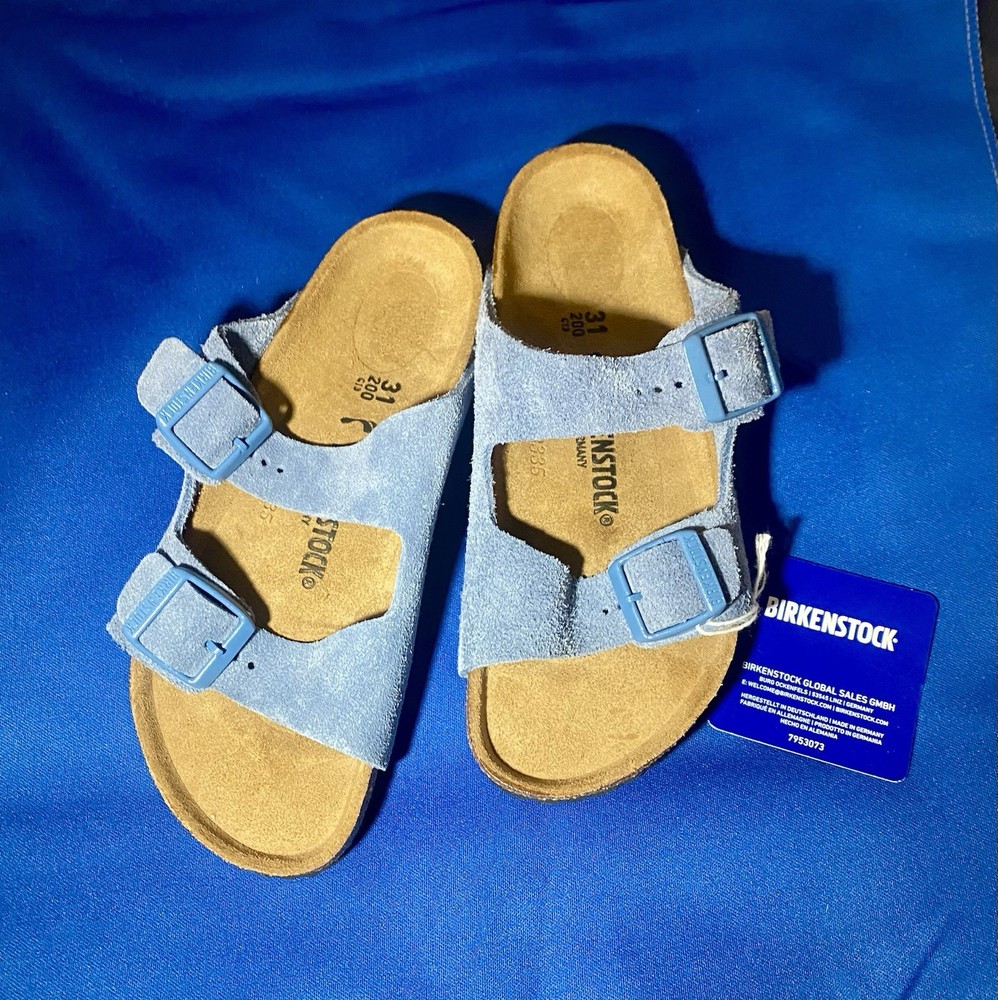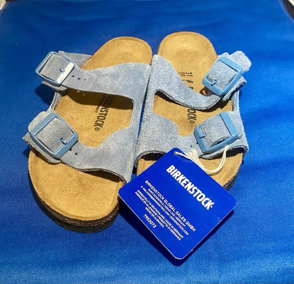 The Birkenstock Arizona Kids sandals in size US C 13 and EU 31 in blue color feature a solid pattern with an open toe design. These slip-on sandals have a buckle closure and a suede lining for comfort. The adjustable strap and narrow shoe width make them ideal for casual occasions, walking, beach activities, and school. Made in Germany with Birkibuc suede upper material, these Birkenstock Arizona sandals offer durability and style for all seasons. Perfect for both boys and girls, these sandals are a reliable choice for growing feet.