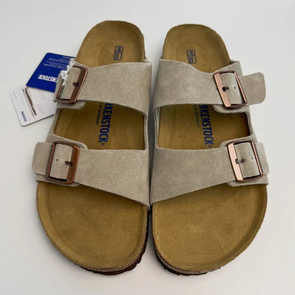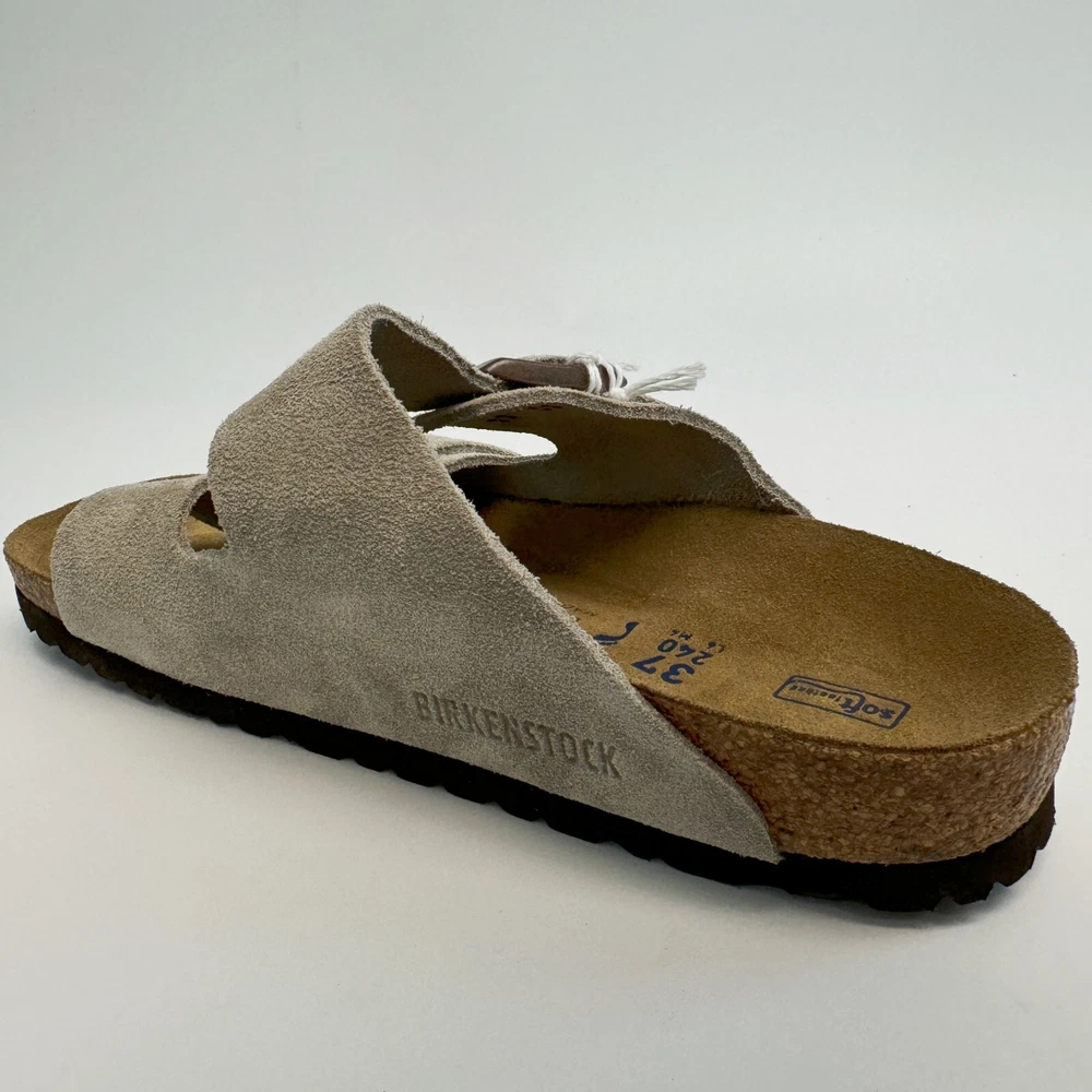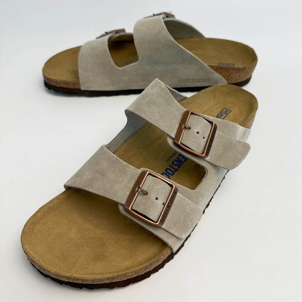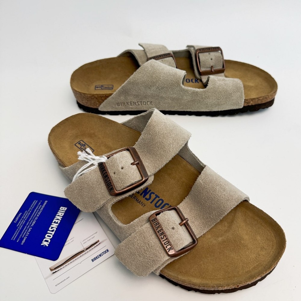 Birkenstock Womens Arizona Taupe Suede sandal Narrow/Wide Cork Sole EU37-45 Size EU37 US Women 6-6.5--US Men 4-4.5 EU38 US Women 7-7.5--US Men 5-5.5 EU39 US Women 8-8.5--US Men 6-6.5 EU40 US Women 9-9.5--US Men 7-7.5 EU41 US Women 10-10.5--US Men 8-8.5 EU42 US Women 11-11.5--US Men 9-9.5 EU43 US Women 12-12.5--US Men 10-10.5 EU44 US Women 13-13.5--US Men 11-11.5 EU45 US Women 14-14.5--US Men 12-12.5 Product Introduction Arizona sandal Featuring an additional foam layer for cushioning, the soft footbed offers extra comfort plus go-all-day support. The adjustable two-strap look comes in classic, velvety suede to make it a match for any season and every style. Condition: New with box Manufacturer: Birkenstock Size Origin: EU Cushioned BIRKENSTOCK soft footbed creates custom support with wear Suede footbed lining helps keep you comfortable EVA sole is flexible and lightweight Two adjustable straps with metal pin buckles Features Special feature: The soft footbed has an integrated latex foam cushion. So it offers excellent comfort Upper material: Suede Suede is a split leather with a napped finish. It has a velvety surface and is very soft to the touch. It also boasts a high moisture absorption capacity. Insole: Natural leather Footbed material: Cork Outsole: EVA EVA (ethylene vinyl acetate) is a high-quality, very light, elastic material with extremely good cushioning. Shipping We ship items within 1 business day of purchase. (The post office doesn't work on weekends)We offer free shipping to the lower 48 states. We are not responsible for taxes or duties for international shipments. Returns We accept returns 30 days after purchase, the item must be in the same condition as sent and in its original packaging. Any returns received used are subject to restocking fee unless the item is not as described.