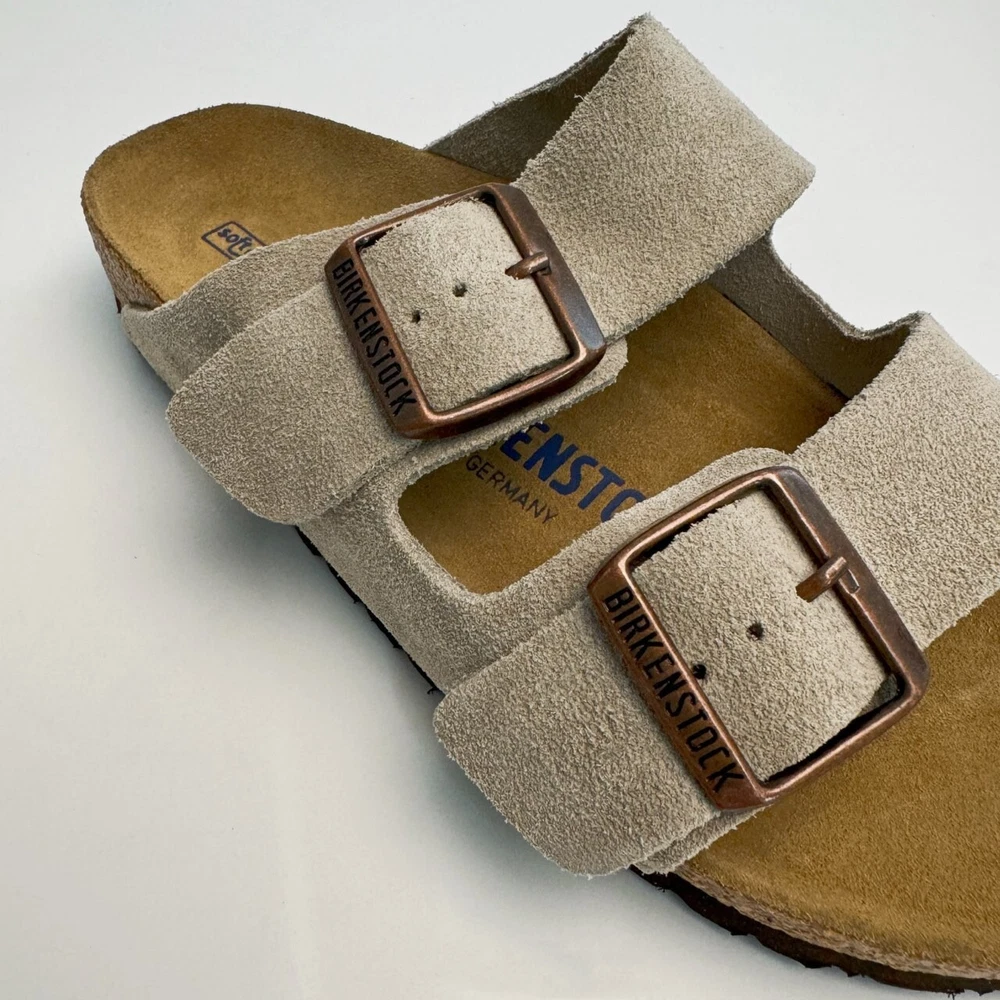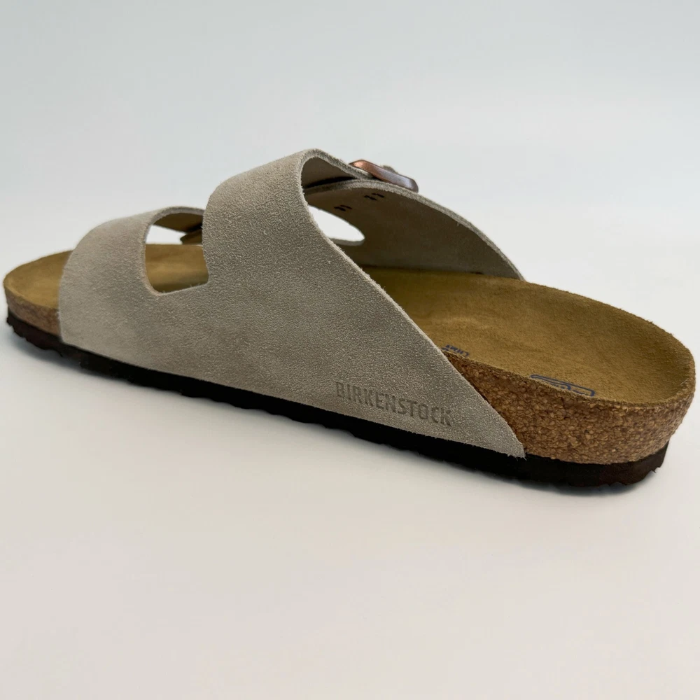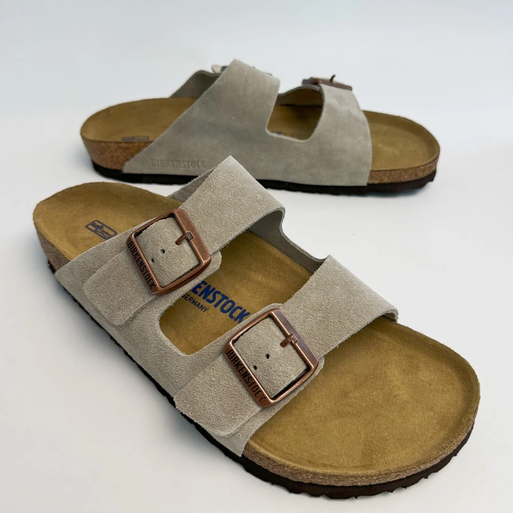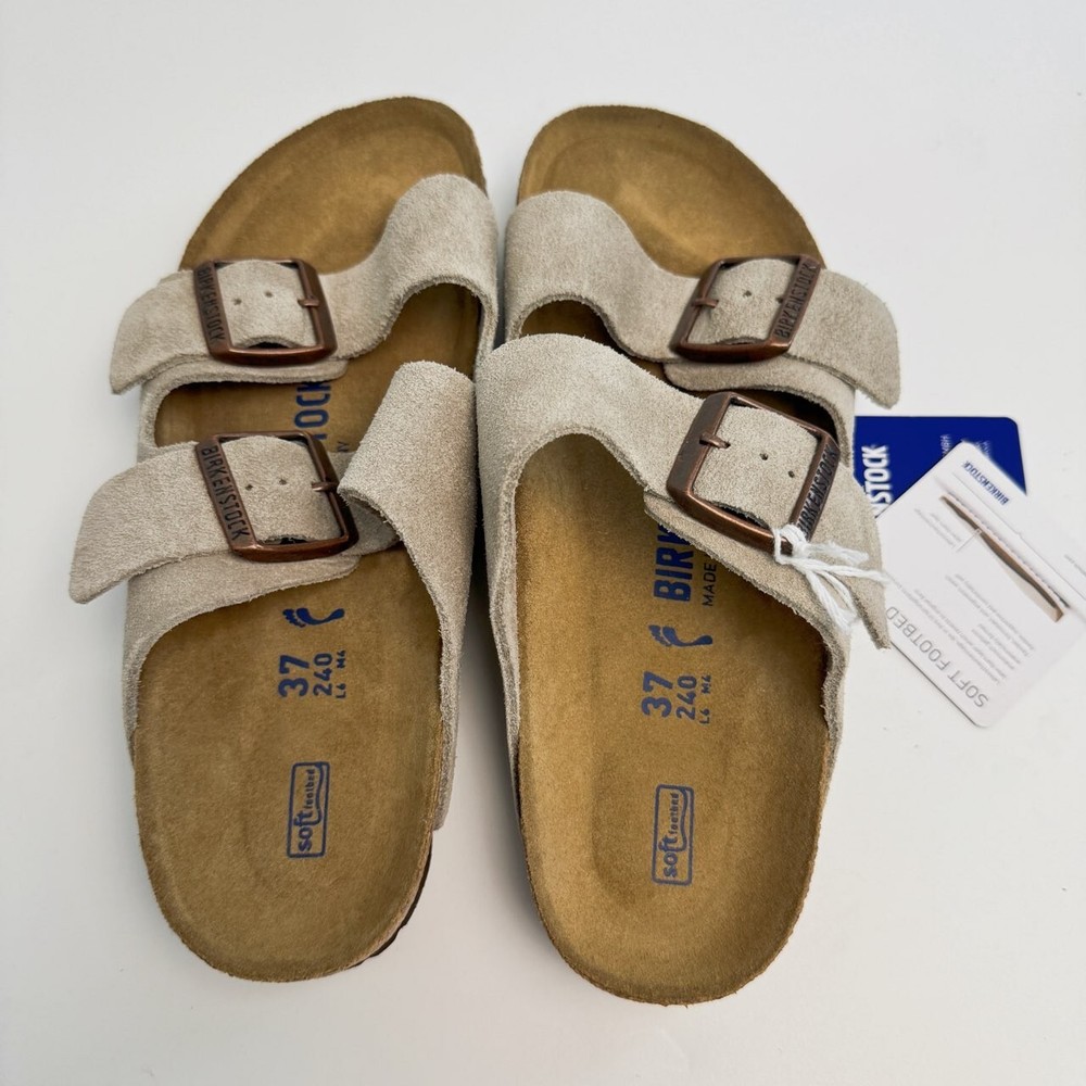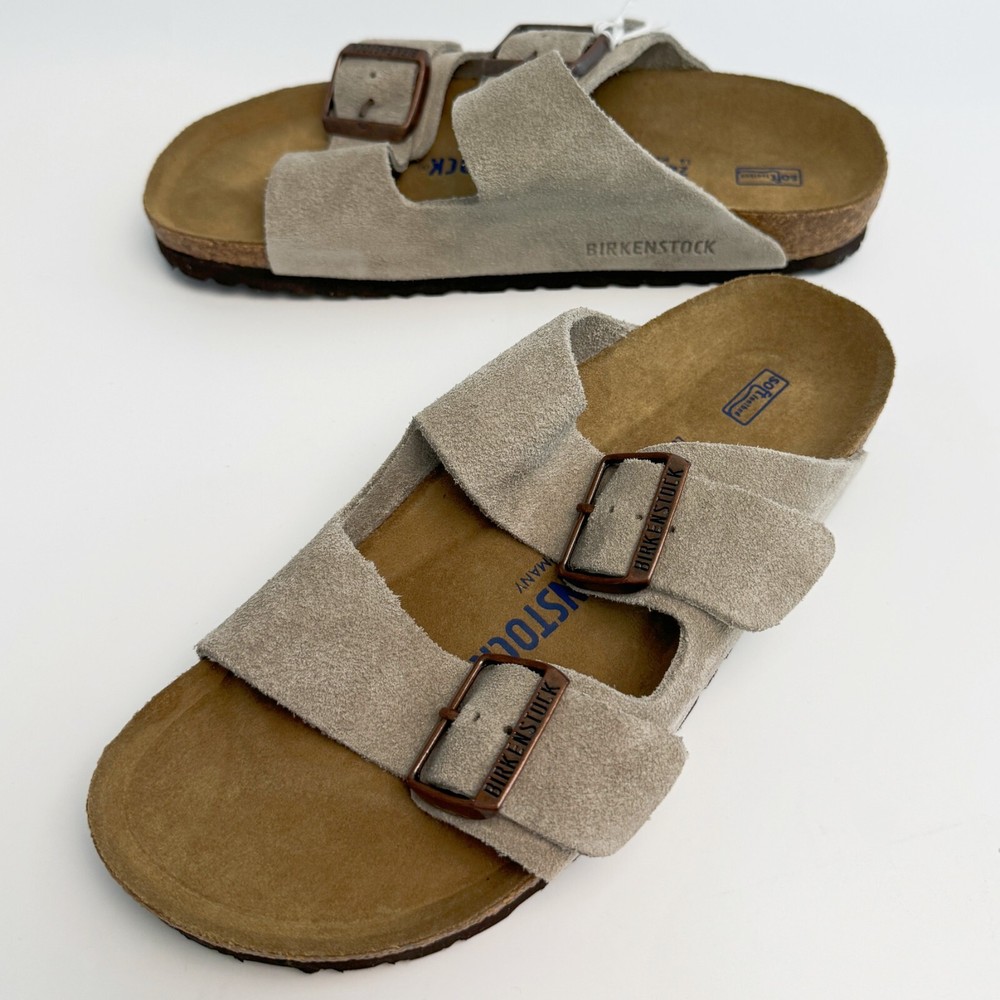 Birkenstock Womens Arizona Taupe Suede sandal Narrow/Wide Cork Sole EU37-45 Size EU37 US Women 6-6.5--US Men 4-4.5 EU38 US Women 7-7.5--US Men 5-5.5 EU39 US Women 8-8.5--US Men 6-6.5 EU40 US Women 9-9.5--US Men 7-7.5 EU41 US Women 10-10.5--US Men 8-8.5 EU42 US Women 11-11.5--US Men 9-9.5 EU43 US Women 12-12.5--US Men 10-10.5 EU44 US Women 13-13.5--US Men 11-11.5 EU45 US Women 14-14.5--US Men 12-12.5 Product Introduction Arizona sandal Featuring an additional foam layer for cushioning, the soft footbed offers extra comfort plus go-all-day support. The adjustable two-strap look comes in classic, velvety suede to make it a match for any season and every style. Condition: New with box Manufacturer: Birkenstock Size Origin: EU Cushioned BIRKENSTOCK soft footbed creates custom support with wear Suede footbed lining helps keep you comfortable EVA sole is flexible and lightweight Two adjustable straps with metal pin buckles Features Special feature: The soft footbed has an integrated latex foam cushion. So it offers excellent comfort Upper material: Suede Suede is a split leather with a napped finish. It has a velvety surface and is very soft to the touch. It also boasts a high moisture absorption capacity. Insole: Natural leather Footbed material: Cork Outsole: EVA EVA (ethylene vinyl acetate) is a high-quality, very light, elastic material with extremely good cushioning. Shipping We ship items within 1 business day of purchase. (The post office doesn't work on weekends)We offer free shipping to the lower 48 states. We are not responsible for taxes or duties for international shipments. Returns We accept returns 30 days after purchase, the item must be in the same condition as sent and in its original packaging. Any returns received used are subject to restocking fee unless the item is not as described.