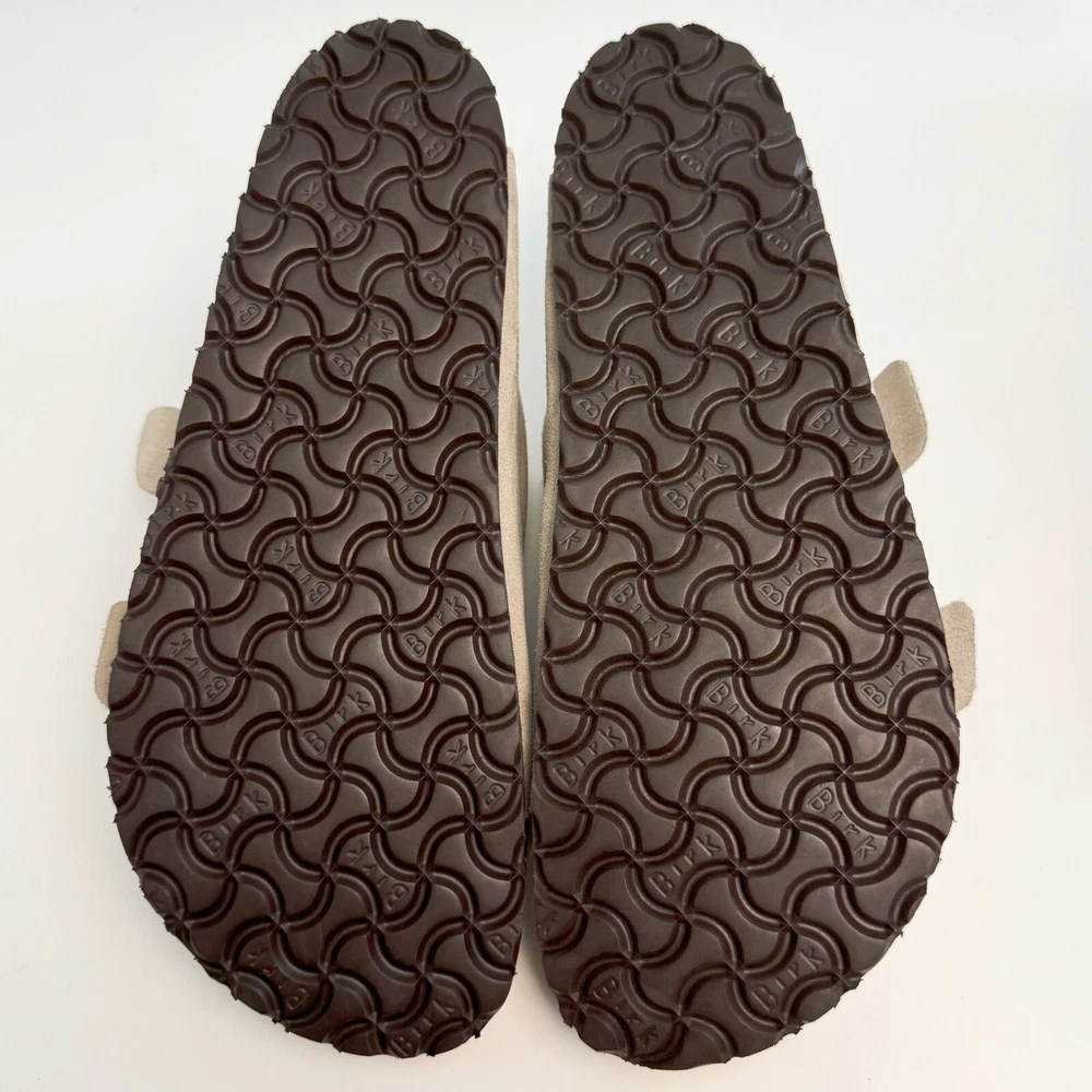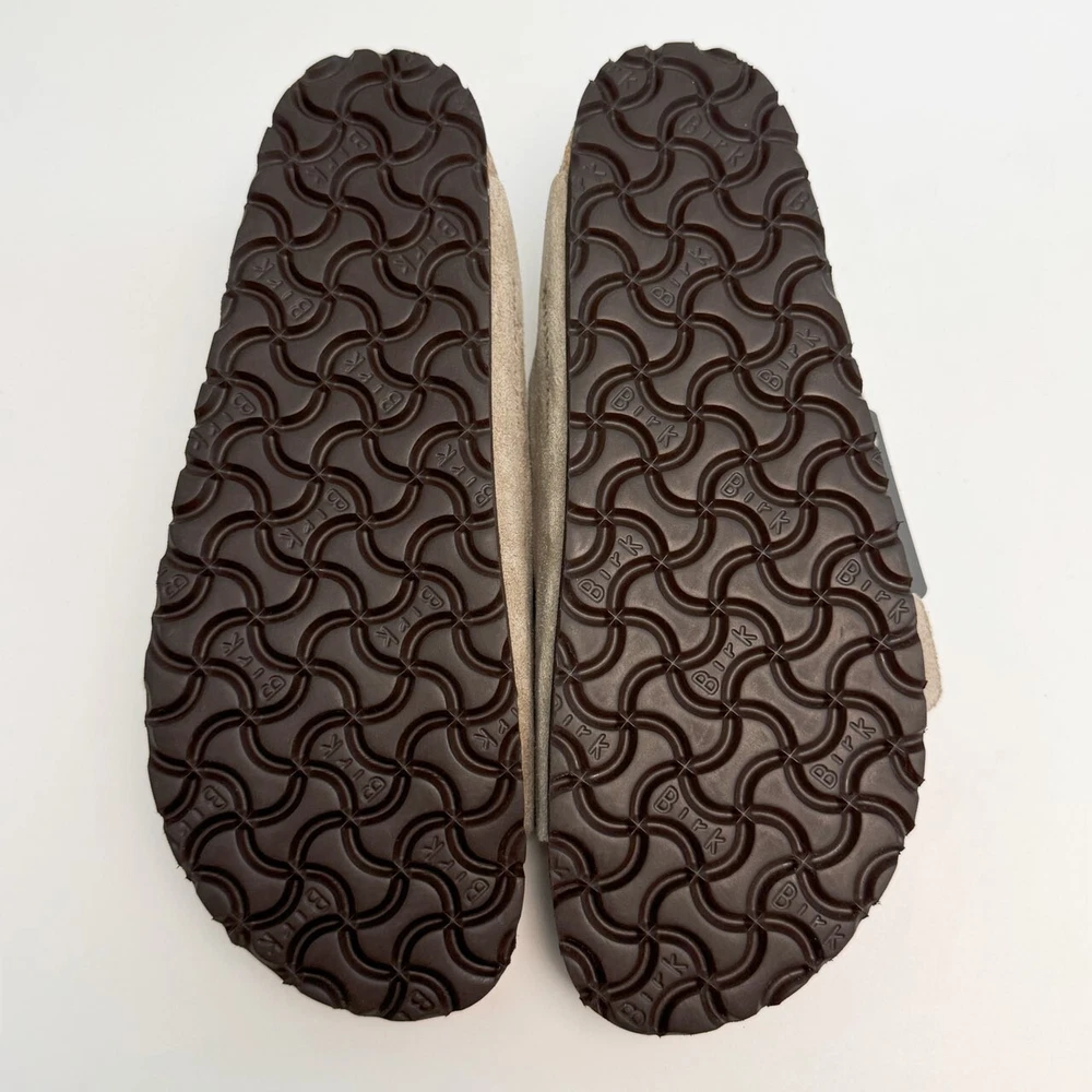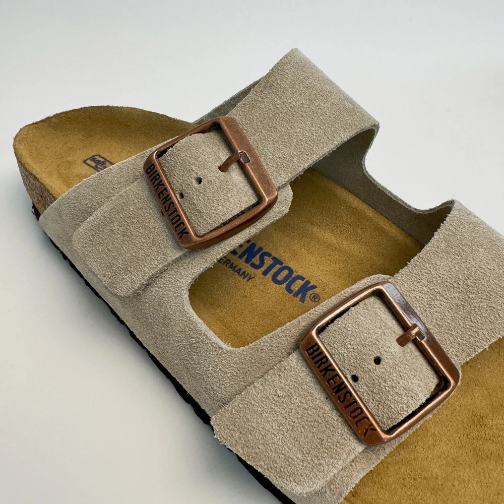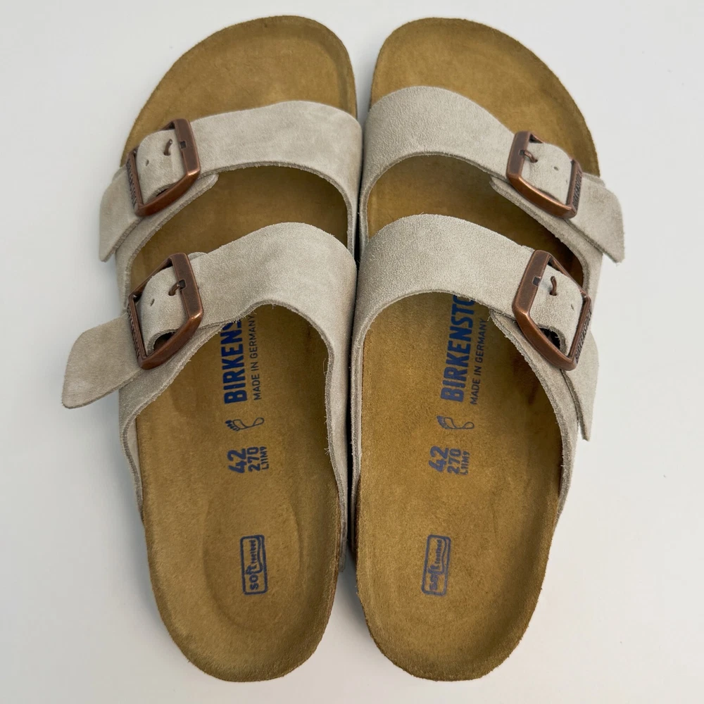 Birkenstock Womens Arizona Taupe Suede sandal Narrow/Wide Cork Sole EU37-45 Size EU37 US Women 6-6.5--US Men 4-4.5 EU38 US Women 7-7.5--US Men 5-5.5 EU39 US Women 8-8.5--US Men 6-6.5 EU40 US Women 9-9.5--US Men 7-7.5 EU41 US Women 10-10.5--US Men 8-8.5 EU42 US Women 11-11.5--US Men 9-9.5 EU43 US Women 12-12.5--US Men 10-10.5 EU44 US Women 13-13.5--US Men 11-11.5 EU45 US Women 14-14.5--US Men 12-12.5 Product Introduction Arizona sandal Featuring an additional foam layer for cushioning, the soft footbed offers extra comfort plus go-all-day support. The adjustable two-strap look comes in classic, velvety suede to make it a match for any season and every style. Condition: New with box Manufacturer: Birkenstock Size Origin: EU Cushioned BIRKENSTOCK soft footbed creates custom support with wear Suede footbed lining helps keep you comfortable EVA sole is flexible and lightweight Two adjustable straps with metal pin buckles Features Special feature: The soft footbed has an integrated latex foam cushion. So it offers excellent comfort Upper material: Suede Suede is a split leather with a napped finish. It has a velvety surface and is very soft to the touch. It also boasts a high moisture absorption capacity. Insole: Natural leather Footbed material: Cork Outsole: EVA EVA (ethylene vinyl acetate) is a high-quality, very light, elastic material with extremely good cushioning. Shipping We ship items within 1 business day of purchase. (The post office doesn't work on weekends)We offer free shipping to the lower 48 states. We are not responsible for taxes or duties for international shipments. Returns We accept returns 30 days after purchase, the item must be in the same condition as sent and in its original packaging. Any returns received used are subject to restocking fee unless the item is not as described.