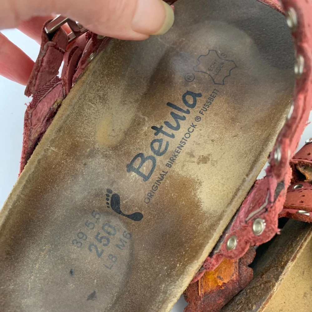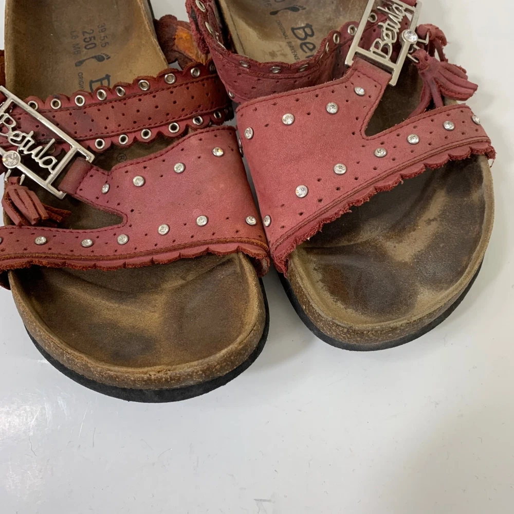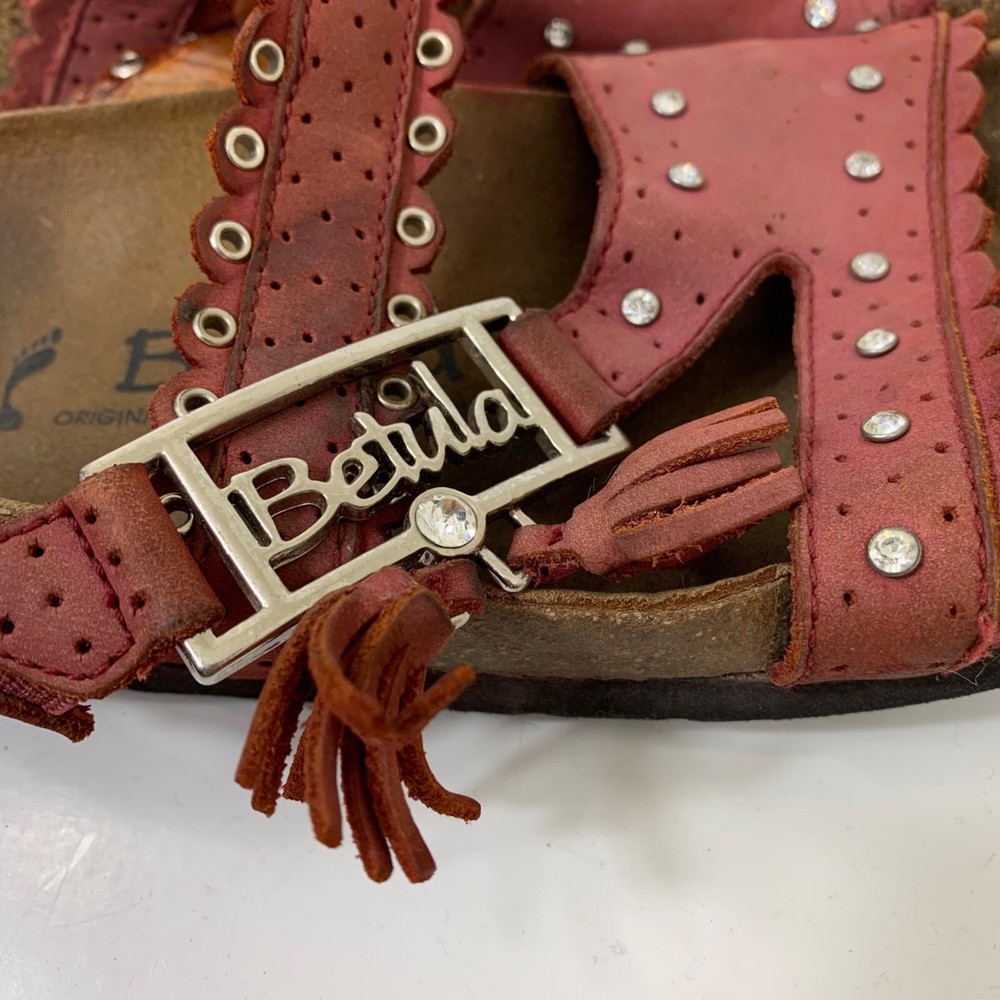 Birkinstock Betula Studded Sandals in Marroon - Size W8, M6 The straps are coming away from the sides a little bit. Besides that, they’re in great preowned condition! Women’s 8, Men’s 6 Betula metal piece with faux crystal and tassels Rhinestone studded Open toe 1P30 7-3588 1 lb 5 oz Tags: casual, summer, bling