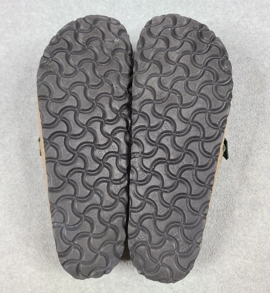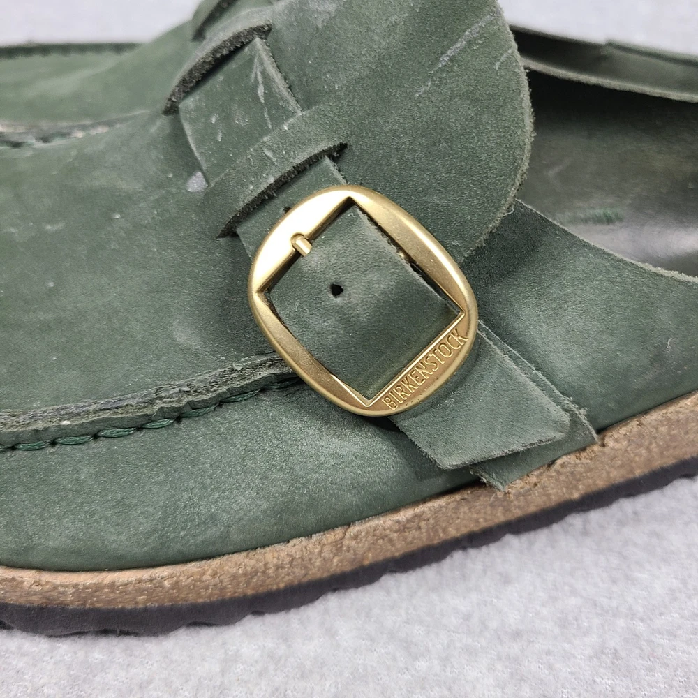 These do have some scuffs so please see ALL pictures before purchasing. Elevate your shoe game with these stylish and comfortable Birkenstock Buckley clogs in a beautiful green suede leather. These are the perfect shoes for women who love to walk and explore the outdoors, with a closed toe and slip-on style that makes them easy to wear. The adjustable strap and buckle features provide a secure fit, while the low top shoe shaft style and flat heel make them comfortable for all-day wear. These clogs are made in Germany and have a shearling fabric type, with a leather lining and insole material that adds to their luxurious feel. The buckle and logo accents provide a touch of elegance, and the solid pattern and tea, outdoor, and classic themes make them a versatile addition to any wardrobe. Whether you're traveling, activewear, or just want to look stylish for a casual event, these Birkenstock Buckley clogs in size 39 and a US shoe size of 8.5 are the perfect choice.
