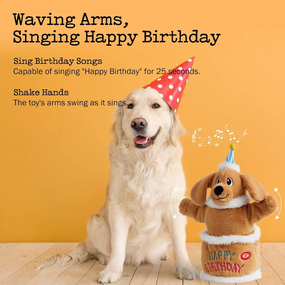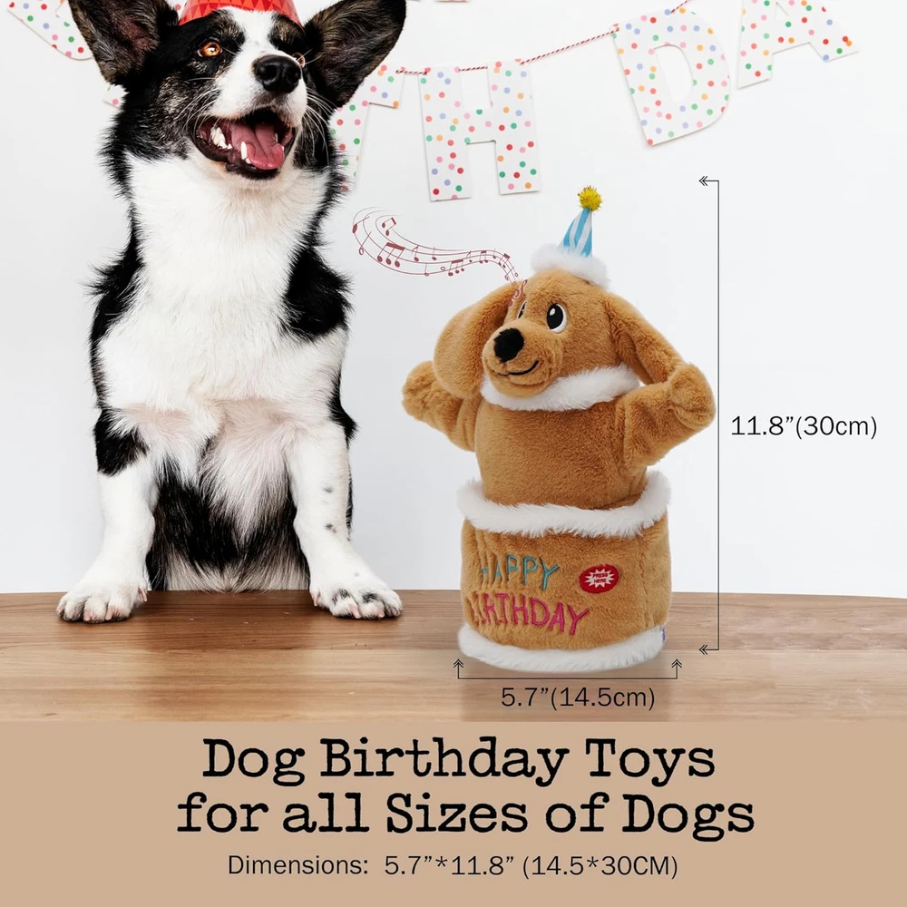 Birthday Party: Play with your furry friend and have an unforgettable and enjoyable birthday together. It is a surprise prop for the dog's first birthday and a celebration dog birthday gift for every birthday. Dancing&Singing Birthday Songs Together: This cake toy with a dog image in a birthday hat can make dogs wag their tails happily! It's like your dog's little friend is celebrating your dog's birthday with you, singing&dancing birthday songs together, and sending happy wishes to your dog. It's suitable for puppies, small to large dogs. Happy Interactive Cake: This toy speaks back exactly what you say to it, creating a fun and engaging experience for both pets and their owners. Safe and Friendly: The toy is made of super soft plush material and is odorless, very safe for your dog. This cake toy is a great toy to interact with your dog. 100% Customer Satisfaction Guaranteed: For best results, we recommend supervised play. If the product is damaged during transportation or if you encounter any issues, please contact us for a replacement. All products come with a one-year warranty. Product Description 1 Accessories 2 Battery Installation 3 How to use? 4 Notice Choose the right dog toy for your puppy 1 2 3 4