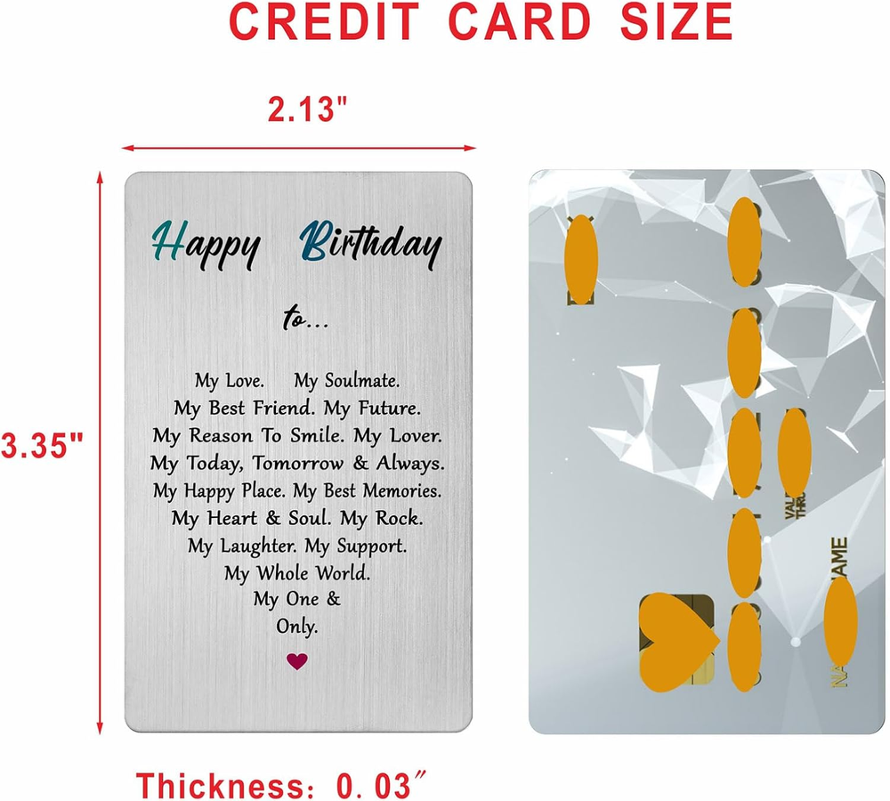 Store New Arrivals Add to Favorite View Feedback Contact Fast deliveries to the customer's home Quality customer service John Make the customers happy! Birthday Card for Men Husband Wife Women- Romantic Birthday Gift for Boyfriend Girlfriend Him Her- Bday to My Love Description Birthday Card to My Love: A stainless steel wallet card that serves as a lasting reminder of your love and commitment. husband birthday card from wife, naughty birthday cards for him. Perfect Size: Compact dimensions of 3.35 x 2.13 inches make it easy to carry in wallets or purses. mens gifts for birthday unique boyfriend, birthday cards for men boyfriend. Happy Birthday Card for Him Her: Perfect for any birthday, making it an ideal gift for couples celebrating their love. birthday gifts for husband who has everything, men's birthday gifts for husband, men gifts for birthday boyfriend, happy birthday boyfriend romantic, men birthday gifts for him, birthday gifts for him, happy birthday cards for men. Durable Material: Made from high-quality stainless steel, ensuring it lasts for years as a cherished keepsake. birthday card for wife girlfriend her women. Birthday Card for Husband Wife: A thoughtful birthday gift for couples to commemorate their special day together. romantic wife birthday card from husband. Item model number GEX7200UK Color All Year Manufacturer Part Number GEX7200UK Item Weight 1.06 ounces Package Dimensions 3.35 x 2.13 x 0.03 inches Size 3.35*2.13Inch ABOUT US We offer the best prices around on high quality products. Our E-store includes media such as books, movies, music and games while offering electronics, toys, sporting apparel, clothing, tools, general home, garden items and more. SHIPPING We are always working hard to ensure your package arrives as soon as possible. Please understand that some factors like weather, high postal traffic, and the performance of shipping companies are outside of our control. We offer free shipping to the lower 48 states and ship within 2 business days of payment, usually sooner. We do not accept P.O. Boxes. Please provide a physical address. For shipping outside of the continental USA, we only use eBay's Global Shipping Program. The item is shipped to KY and then sent to the rest of the world. International customers are responsible for all duties and taxes. Continue to 'check out' to calculate costs for shipping the item to your country. Messages regarding eBay's Global Shipping Program MUST be directed at eBay EXCLUSIVELY. RETURNS We offer a 30-Day Return Policy on items in which you are not completely satisfied with. You have the option of a full-refund or an exchange of the item. No returns are available on items shipped outside of the USA PAYMENT We accept PayPal. CONTACT US This page content is yet to come Please ad us to your favorite seller and visit again later Thank You CUSTOMER SATISFACTION We try our very best to make sure every customer is completely satisfied. If there's a problem, message us! We're happy to help. WE ACCEPT