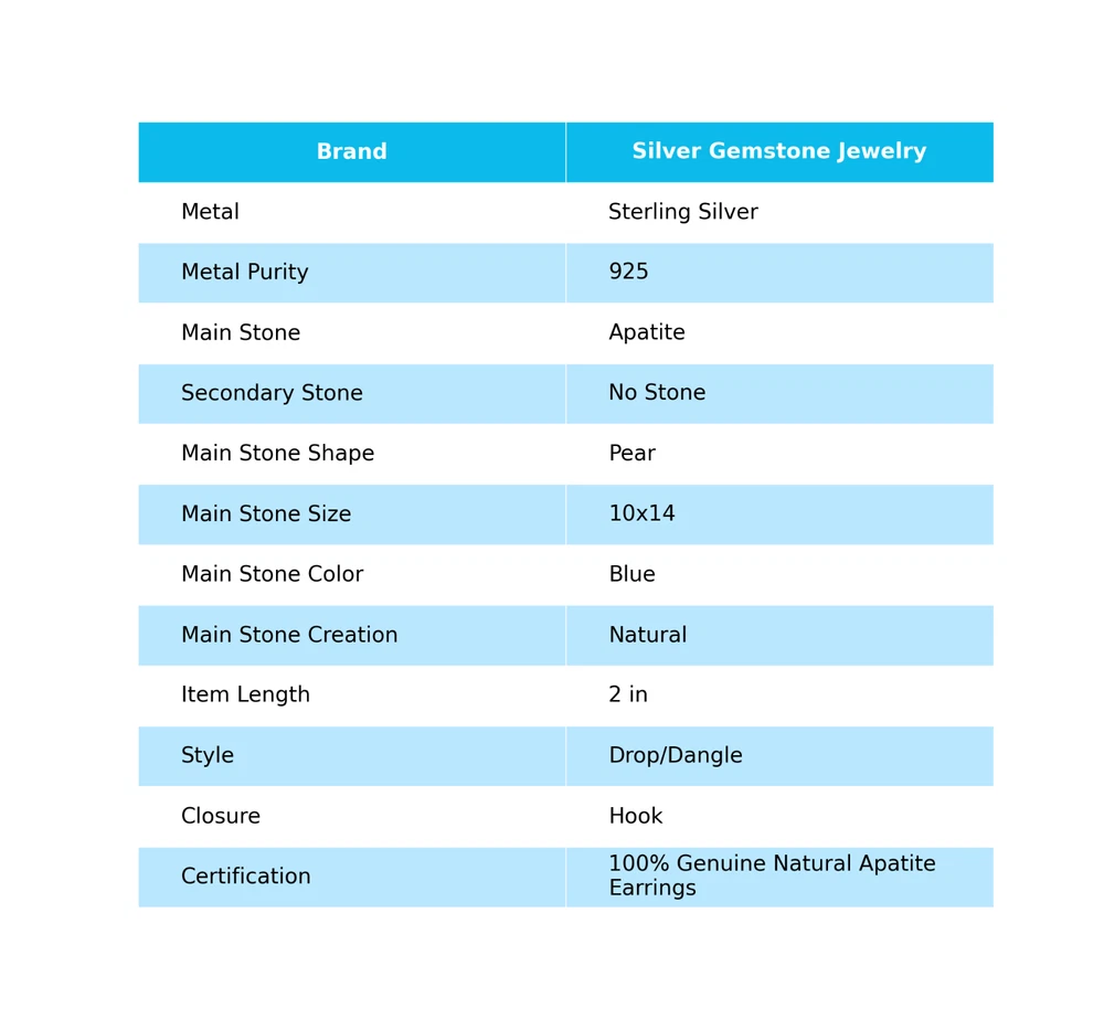 Welcome to Jaipur Silver Gallery Birthday Gift For Her Natural Apatite Gemstone Drop/Dangle Earrings 925 Silver Handmade Earrings, Sterling Silver Earrings, APATITE Earrings, Handcrafted Earrings SKU : - JSEE-36-12 Gemstone : - APATITE Stone Shape : - Pear Metal : - Sterling Silver Metal Purity : - 925 Earring Length : 2 Inches Earring Width : Inches _______________________________________________________________________________________ Amazing Properties of Silver ****************************** Tough and Long-lasting: Silver is incredibly strong, built to withstand daily wear and tear as well as tough environmental conditions. Easy to Shape and Design: Silver is like clay for skilled craftsmen, allowing them to create beautiful and intricate designs effortlessly. Great at Conducting Energy: When it comes to heat and electricity, silver is the go-to. It can quickly and efficiently transfer energy, making it ideal for various applications. Keeps Things Clean and Safe: Silver has a natural ability to keep harmful bacteria at bay, making it a reliable choice for promoting cleanliness and well-being. 3 Underrated Benefits Of Silver ****************************** Gorgeous Charm: Silver jewelry shines brightly, enhancing any outfit and fitting everyone's style with ease. Gentle on Skin: Silver is kind to your skin, reducing the chance of allergies and making it a favorite choice for accessories. Healing Vibes: Some believe silver jewelry has a soothing touch, possibly aiding in easing issues like arthritis, anxiety, and the blues. _______________________________________________________________________________________ For Mother's Day Gift For Father's Day Gift For Promise For Valentine' Day For Halloween Party For Christmas Day Gift For New Year Party For Mom For Her _______________________________________________________________________________________ If you need more help or want design tips, just give us a shout! We're lightning-fast in getting back to you. Every single thing we create is made by hand in our special workshop, and we put a whole lot of love and care into every piece. Thank you for stopping by! We're confident you'll have an amazing time shopping with us. We're here to make sure every moment you spend with us is filled with delight and satisfaction. Happy shopping!