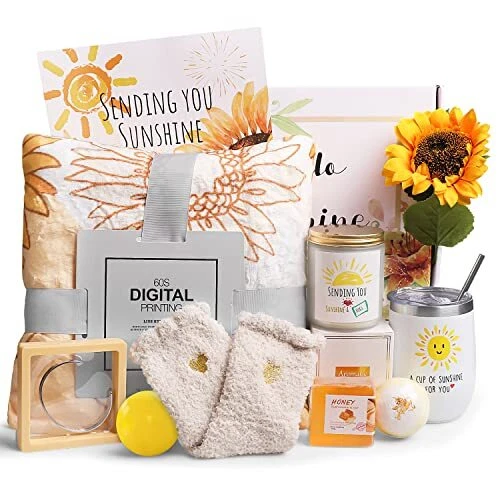 Return Policy Fast Delivery Trusted seller Birthday Gifts for Women, Get Well Gifts for Women, Care Package Gift Baskets with Inspirational Blanket Candle Self Care Gifts for Women Best Friends Friendship Bestie Sister Mom Her Product Description 【Perfect Birthday Gifts for Women】Sunshine, hugs & love are collected in our gift basket for women, which is a positive care package! Paired this delightful assortment of goodies, unique and fun! Your best friend, sister, mom, or any women you care about deserves a heartfelt gift. Surprise her with thoughtful gifts that say "Get well soon," "Thinking of you," "Happy birthday," Or any occasion you want her to know she's loved and cared for 【Ideal Gifts for Women】This gift baskets for women is an exclusive! You won't find it anyw else. 39 x59 inches sunflower blanket | 7oz 50-hour scented candle | 12oz thermal wine tumbler | "Be the sunshine" Bracelet | 9 x6.3 inches large greeting card. Each pattern is carefully designed by our designers to represent our support and blessings 【Stress Relief Get Well Gifts】Plus we've included some thoughtful goodies, including: Socks stitched with hearts | a lovely artificial sunflower | 2.48" stress ball | 3.5 oz honey bar soap | 3.5 oz lemon bath ball. On lazy afternoons, Sip a cup of coffee, light a jar of scented candles, use our shower bombs for a wonderful bath, relax and adjust to a happy mood 【Thoughtful Gifts for Any Occations】Our personalized gift baskets for women are ready for any occasion and convey your encouragement and blessings. It can be used as a positive and inspirational gift such as feel better, get well, surgery recovery, after surgery, thinking of you, self care, sympathy, thank you, spa relaxing, sick care etc. It can also be used as various holiday gifts, such as Birthday, Mother's Day, Thanksgiving, Valentine's Day, Christmas, New Year and so on 【Sending Sunshine Basket】Brighten Someone's Day! We expect the recipients of our sunflower gift boxes to absolutely love them. Not just any gift will do when your lady is celebrating a milestone birthday—it has to be meaningful and appropriately jubilant for the occasion! Our sunshine gifts are your best choice, a series of encouraging items will wish her to be braver and love herself more every day Shipping Returns Payment Shipping Shipping is FREE to all addresses other than APO/PO boxes in the lower 48 states. All our stock ships from US-based warehouses. Shipped via USPS or UPS (depending on location and package weight) Unless stated otherwise, all orders will ship within 24-72 hours of your payment being processed. Check our feedback to see the great reviews of FAST shipping we offer. Returns Seller does not accept returns Payment We currently accept payment via eBay managed payments only. Once payment is cleared, we will dispatch your shipment within 1-3 business days. Please refer to the "Shipping" tab for more information regarding shipping speed to your destination.