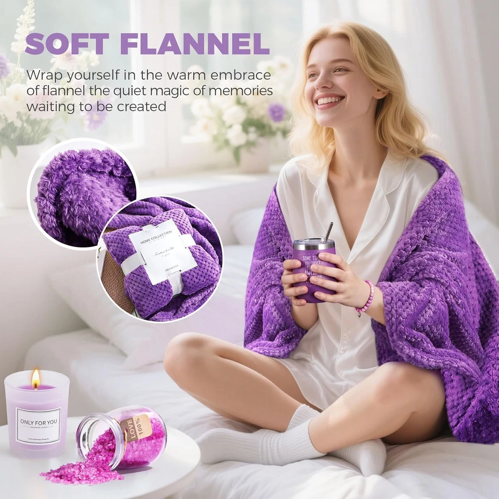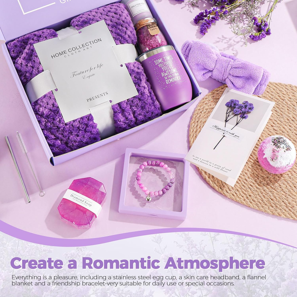 Ultimate Luxury Teacher's Day & Women's Gift Set: This premium 10-piece spa gift set is the perfect Teacher's Day gift, birthday gift for her, anniversary gift, or best friend gift. Elegantly presented in purple, it's designed for women seeking luxury. Indulgent Lavender Spa Experience at Home: Enjoy ultimate relaxation with therapeutic lavender bath salts, exfoliating Himalayan salt scrub, and moisturizing gold foil soap. Transform your bath into a calming aromatherapy retreat for body and soul. Practical Pampering & Daily Delights Included: Beyond bath essentials, find versatile treasures: a chic skincare headband, cozy flannel blanket, stylish friendship bracelet, and unique stainless steel egg cup. Perfect for everyday use or special moments. Soothing Lavender Ambiance & Romantic Touch: Set a serene or romantic mood with delicately scented lavender candles and beautiful dried flower cards. Ideal for creating a relaxing atmosphere for Teacher's Day, birthdays, or anniversaries. Exquisite Purple Gift Box Ready for Presentation: Arrives in a stunning luxury purple gift box, complete with a heartfelt holiday card. Offers a memorable unboxing experience, making it the ultimate ready-to-give present for any occasion. Product description