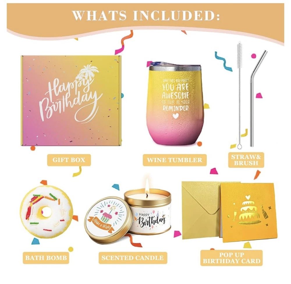 Practical 6pcs Happy Birthday Gifts for Her: Our personalized birthday gift set includes everything she needs to enjoy her day: 1* 12oz tumbler with lid, 1* handmade scented candle, 1* bath Bomb, 1* Pop Up birthday card with envelope,1*straw and straw brush,1*curated gift box .