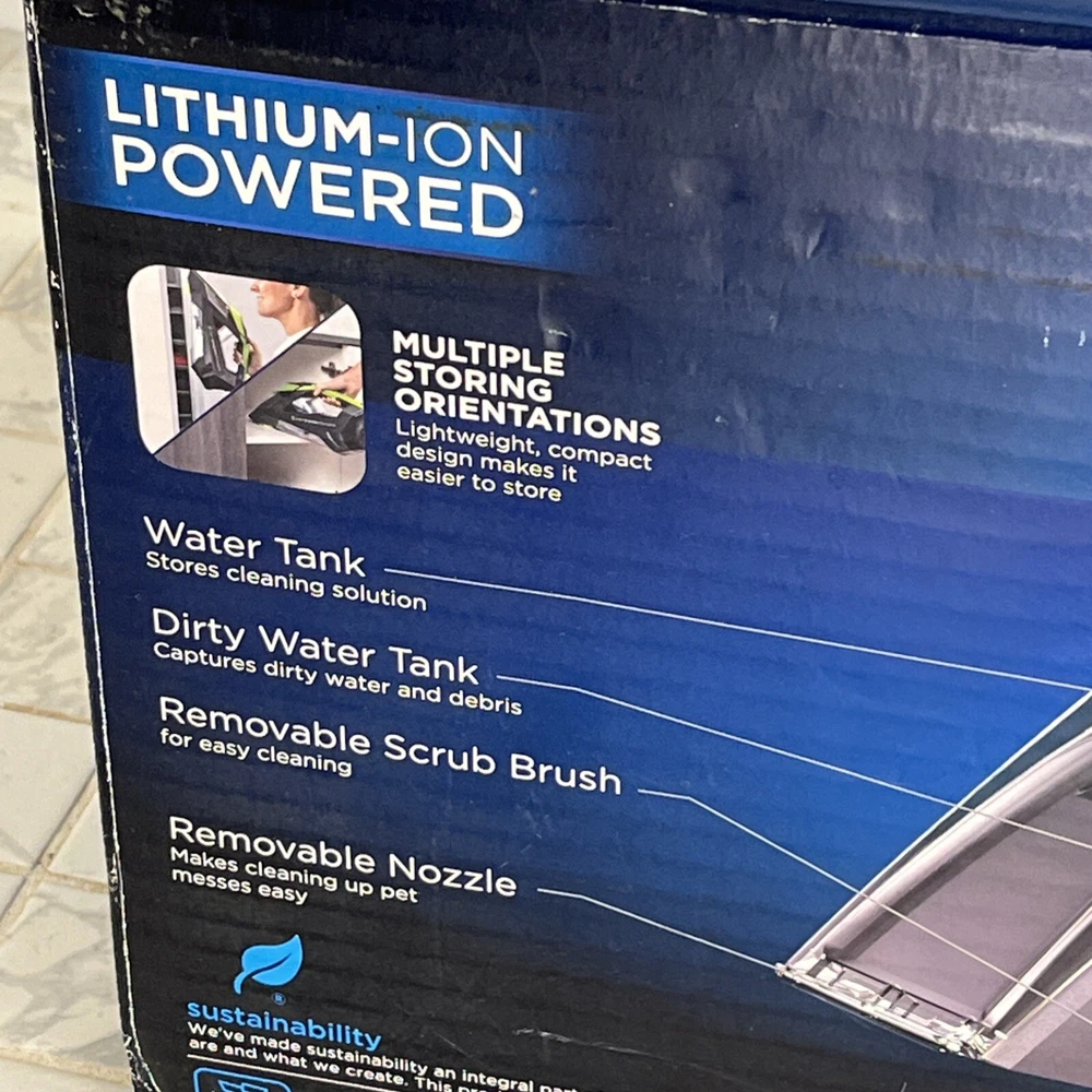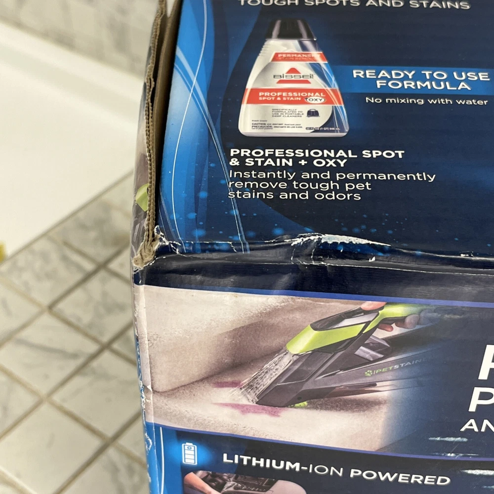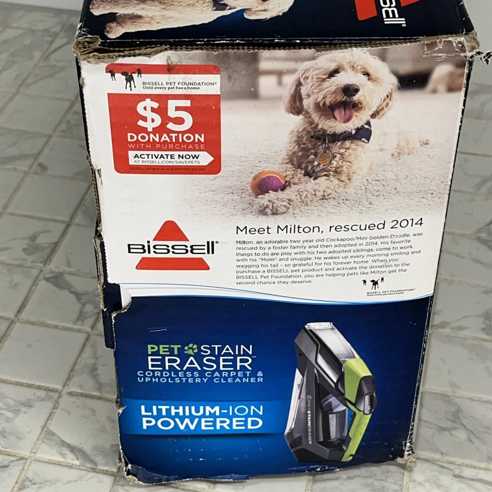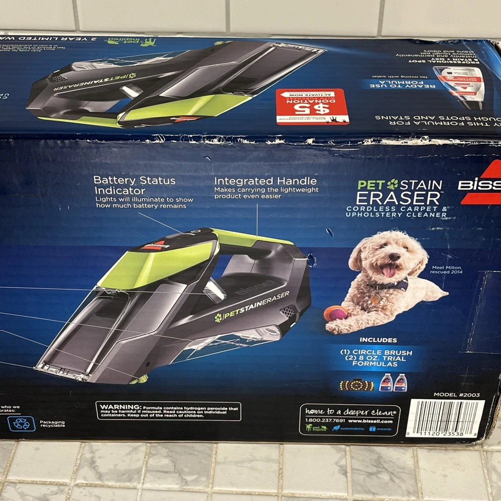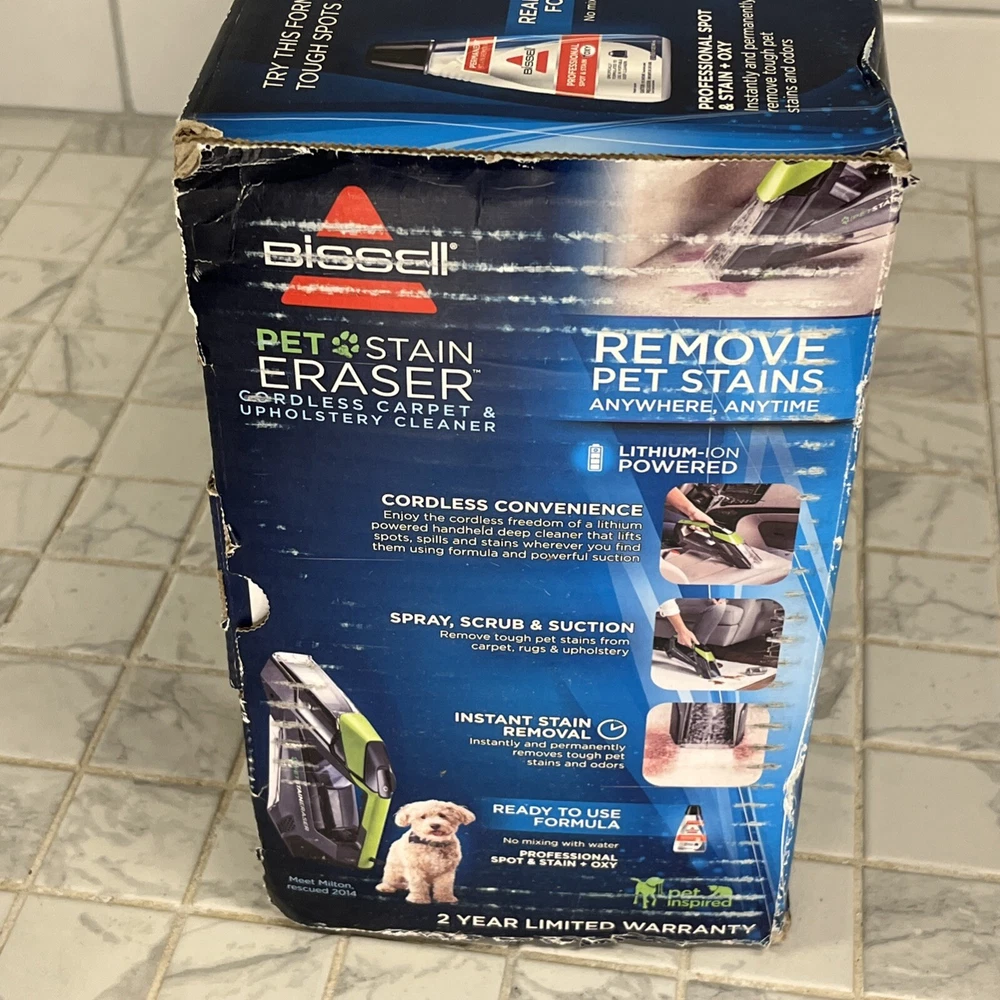 Bissell Pet Stain Eraser Cordless Portable Spot Carpet Cleaner Model 2003 Brand New!! It’s Cordless!!!! Also comes with 1-Circle Brush 2– 8 oz Trial Formulas Box has a bit of wear in the corners but in great condition overall!! See photos to judge condition Loc: 2 Top