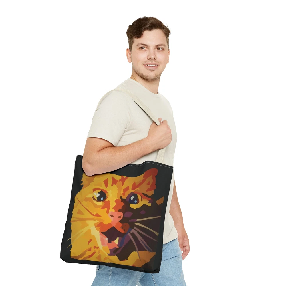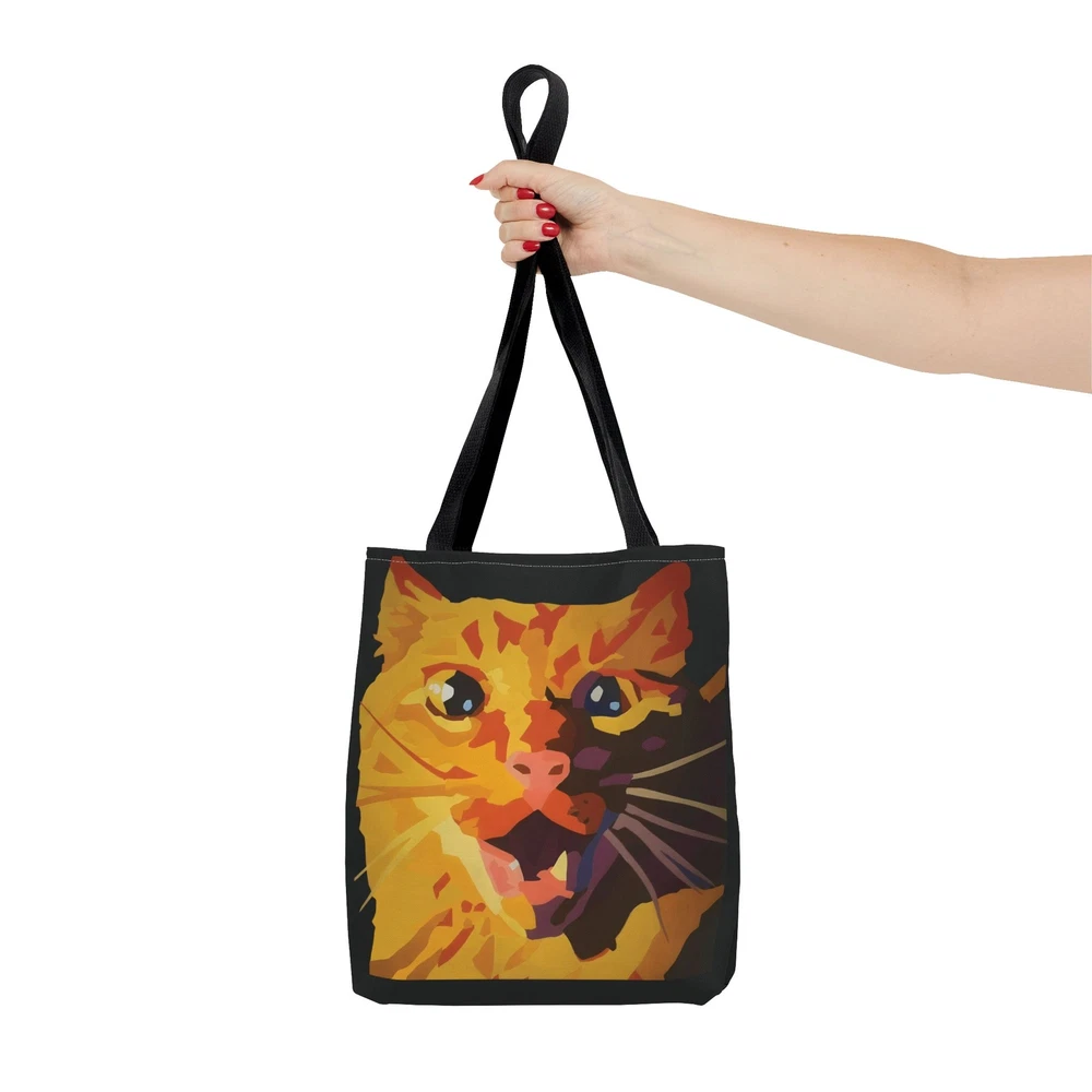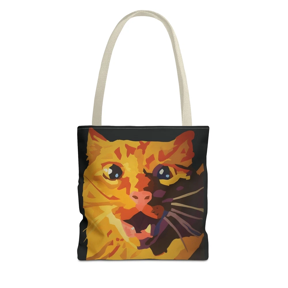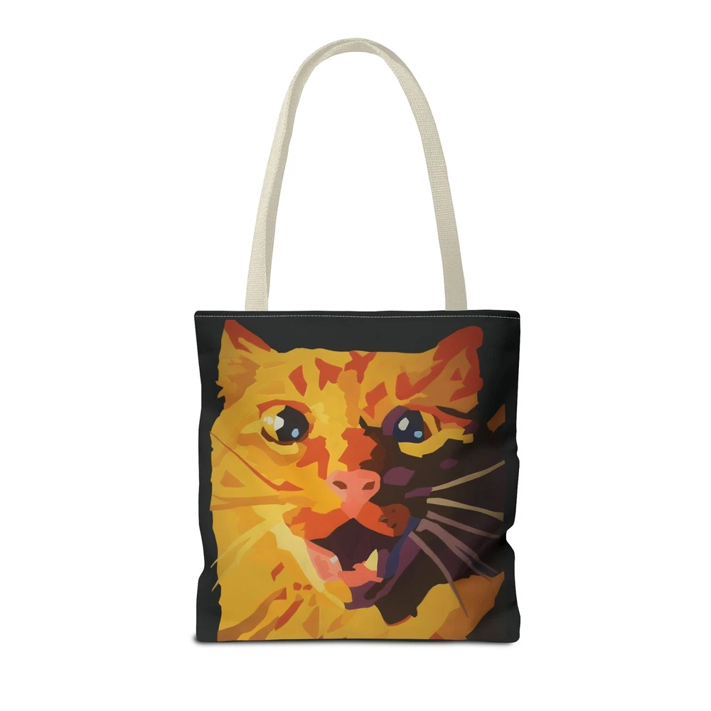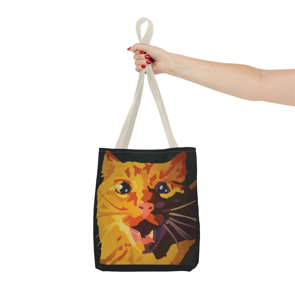 Carry a touch of sass and feline charm wherever you go with this tote bag, featuring a bold and cheeky bitey cat face design. Whether you're a cat lover or just appreciate a quirky accessory, this bag adds personality to your daily essentials. Eye-Catching Design : Show off your love for cats with this expressive bitey cat face, printed using fade-resistant dye sublimation technology for vibrant, all-over visuals. Durable Construction : Made from 100% spun polyester (6.49 oz/yd² or 200 g/m²), this medium-weight fabric is built to last, making it ideal for everyday use. Sturdy & Stylish : Double-stitched seams and a non-woven laminate lining ensure durability, while soft cotton webbing straps add comfort for carrying. Customizable Options : Choose from two handle colors to complement the design. Size Variety : Available in three sizes, each featuring a spacious single compartment to suit your storage needs. Size Tolerance : Minimal variance of ±0.75" (1.9 cm) for consistent quality. Whether you're shopping, commuting, or making a statement, this tote bag combines practicality with a touch of feline mischief. Perfect for cat enthusiasts or anyone who loves a unique and functional accessory! Care instructions: Remove all items from the bag before cleaning. Suggested to pretreat visible stains with stain remover. Mix warm water with laundry detergent and clean the bag with terry washcloth or a soft bristle brush. Let the bag air dry.