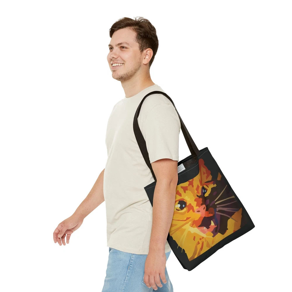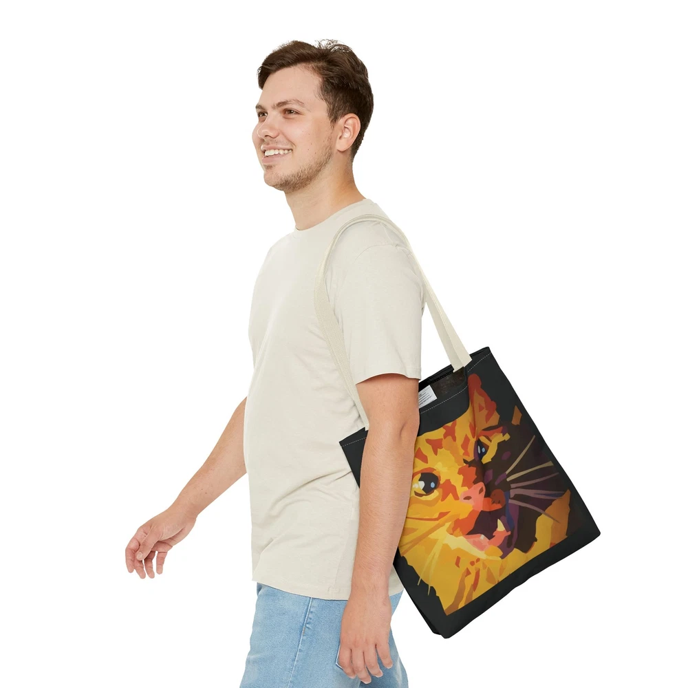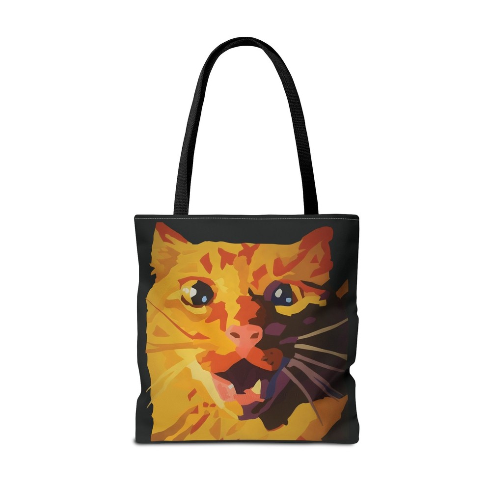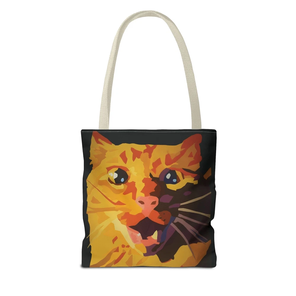 Carry a touch of sass and feline charm wherever you go with this tote bag, featuring a bold and cheeky bitey cat face design. Whether you're a cat lover or just appreciate a quirky accessory, this bag adds personality to your daily essentials. Eye-Catching Design : Show off your love for cats with this expressive bitey cat face, printed using fade-resistant dye sublimation technology for vibrant, all-over visuals. Durable Construction : Made from 100% spun polyester (6.49 oz/yd² or 200 g/m²), this medium-weight fabric is built to last, making it ideal for everyday use. Sturdy & Stylish : Double-stitched seams and a non-woven laminate lining ensure durability, while soft cotton webbing straps add comfort for carrying. Customizable Options : Choose from two handle colors to complement the design. Size Variety : Available in three sizes, each featuring a spacious single compartment to suit your storage needs. Size Tolerance : Minimal variance of ±0.75" (1.9 cm) for consistent quality. Whether you're shopping, commuting, or making a statement, this tote bag combines practicality with a touch of feline mischief. Perfect for cat enthusiasts or anyone who loves a unique and functional accessory! Care instructions: Remove all items from the bag before cleaning. Suggested to pretreat visible stains with stain remover. Mix warm water with laundry detergent and clean the bag with terry washcloth or a soft bristle brush. Let the bag air dry.