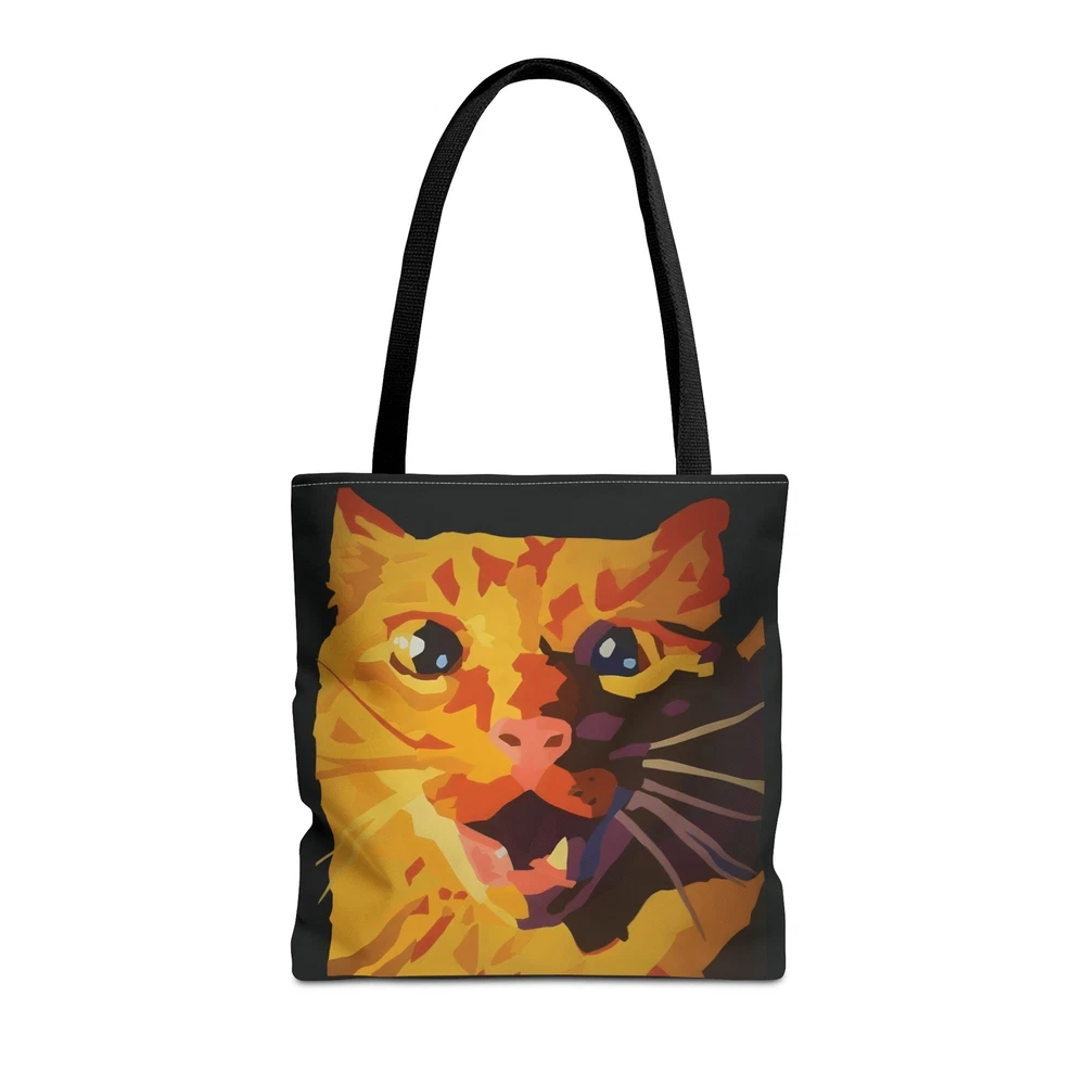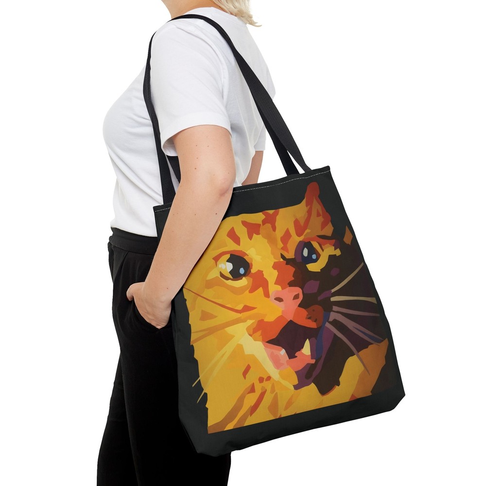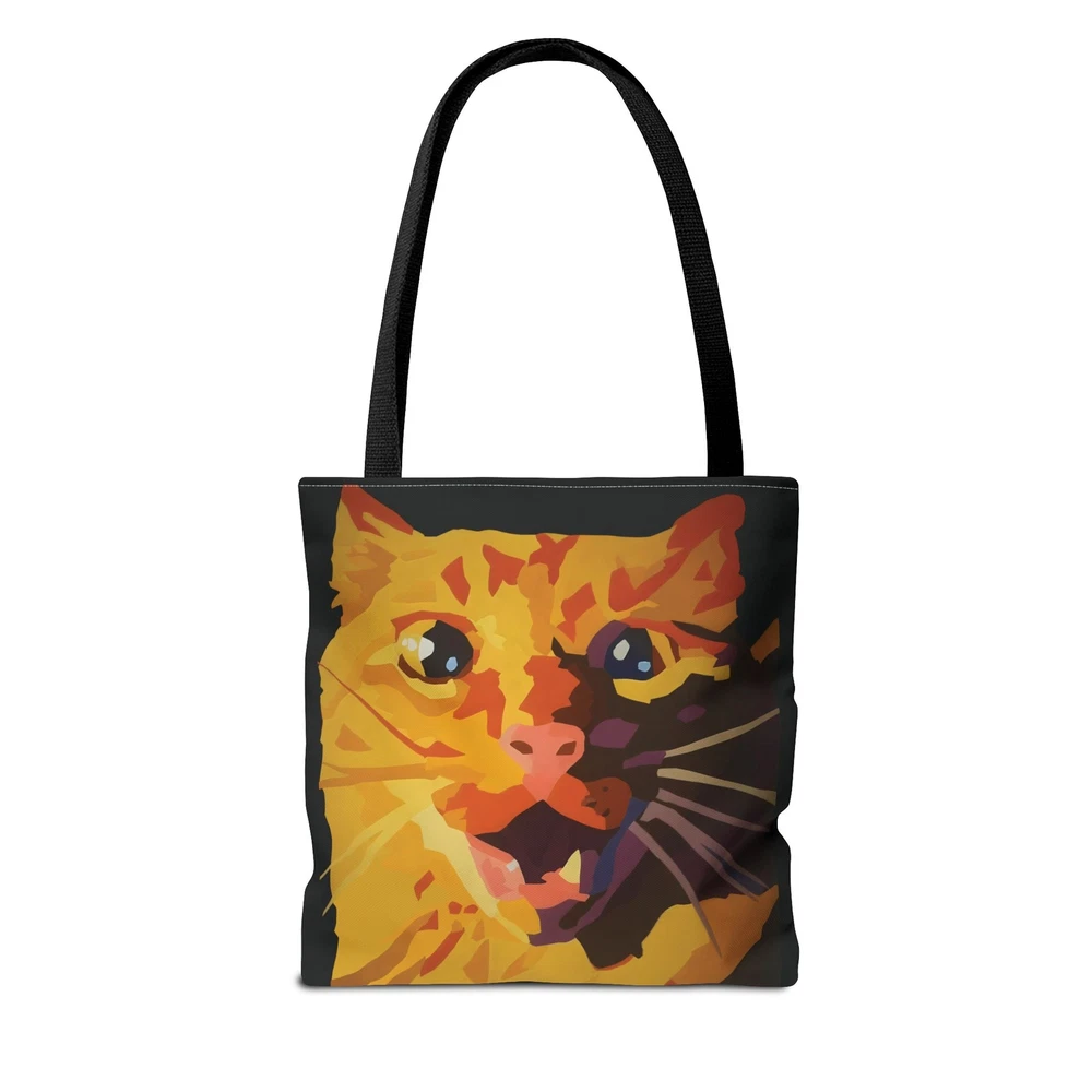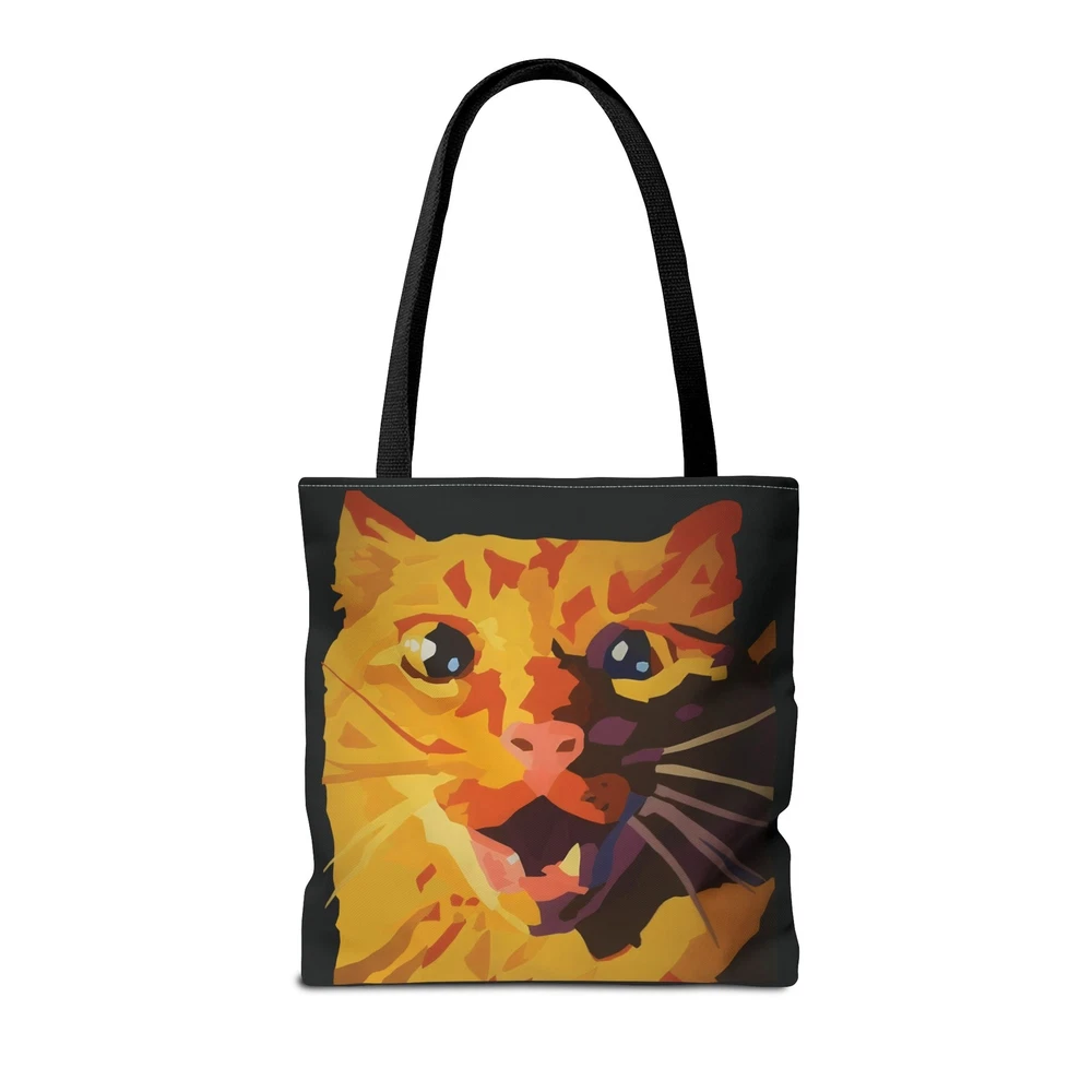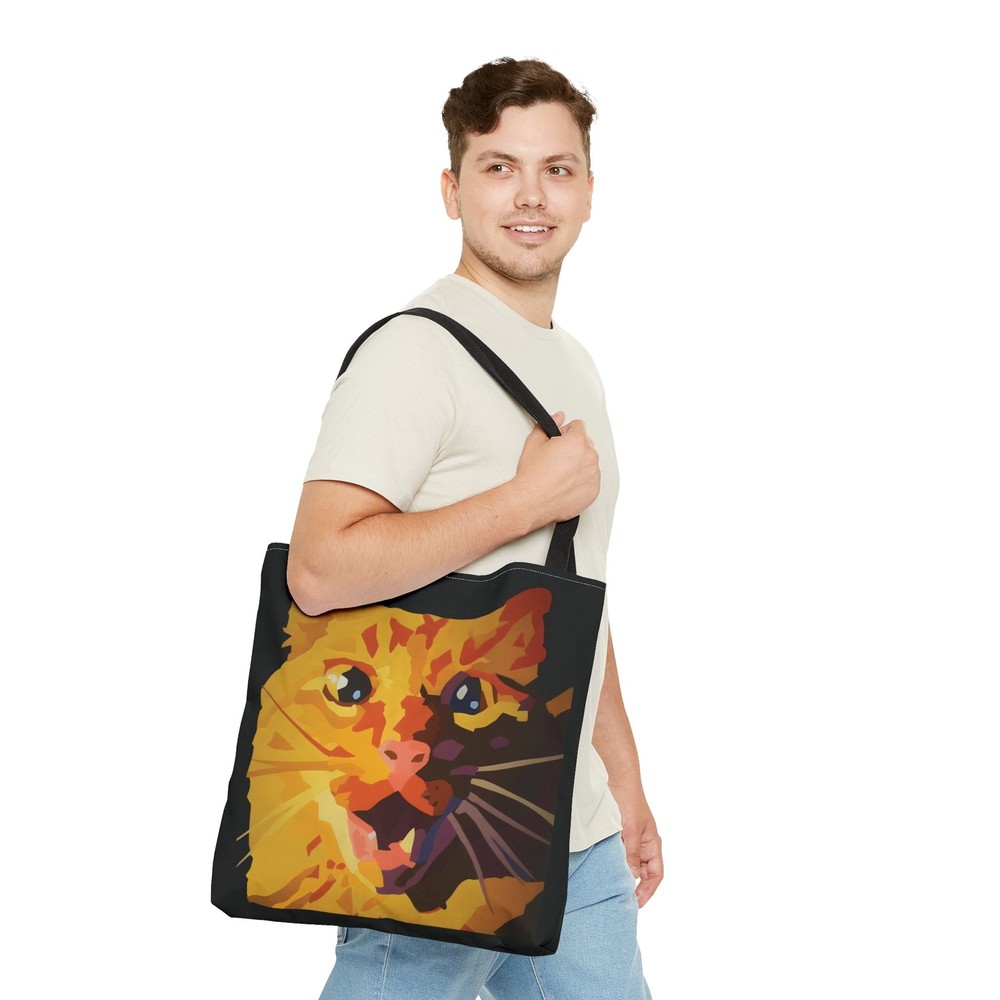 Carry a touch of sass and feline charm wherever you go with this tote bag, featuring a bold and cheeky bitey cat face design. Whether you're a cat lover or just appreciate a quirky accessory, this bag adds personality to your daily essentials. Eye-Catching Design : Show off your love for cats with this expressive bitey cat face, printed using fade-resistant dye sublimation technology for vibrant, all-over visuals. Durable Construction : Made from 100% spun polyester (6.49 oz/yd² or 200 g/m²), this medium-weight fabric is built to last, making it ideal for everyday use. Sturdy & Stylish : Double-stitched seams and a non-woven laminate lining ensure durability, while soft cotton webbing straps add comfort for carrying. Customizable Options : Choose from two handle colors to complement the design. Size Variety : Available in three sizes, each featuring a spacious single compartment to suit your storage needs. Size Tolerance : Minimal variance of ±0.75" (1.9 cm) for consistent quality. Whether you're shopping, commuting, or making a statement, this tote bag combines practicality with a touch of feline mischief. Perfect for cat enthusiasts or anyone who loves a unique and functional accessory! Care instructions: Remove all items from the bag before cleaning. Suggested to pretreat visible stains with stain remover. Mix warm water with laundry detergent and clean the bag with terry washcloth or a soft bristle brush. Let the bag air dry.