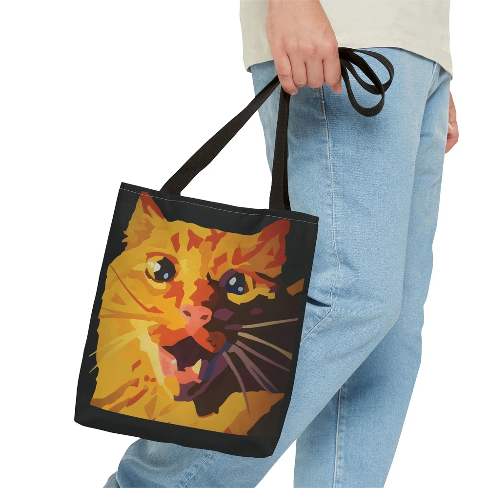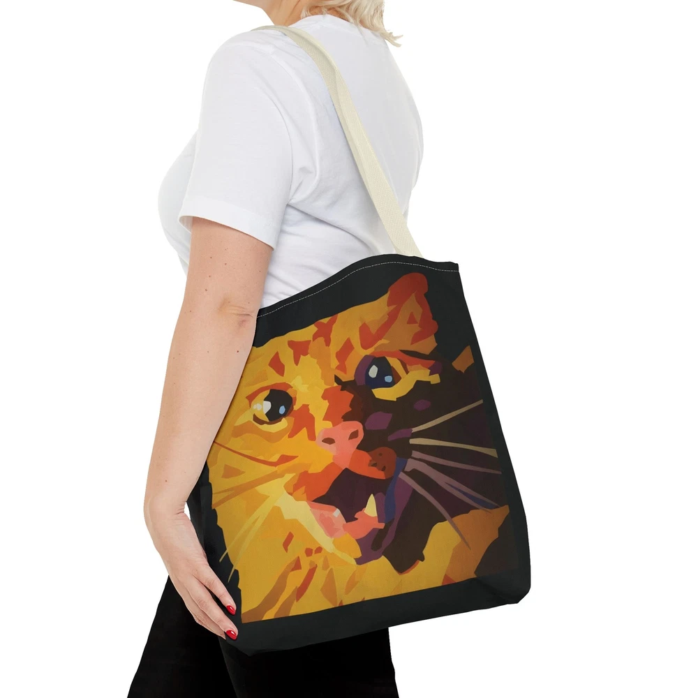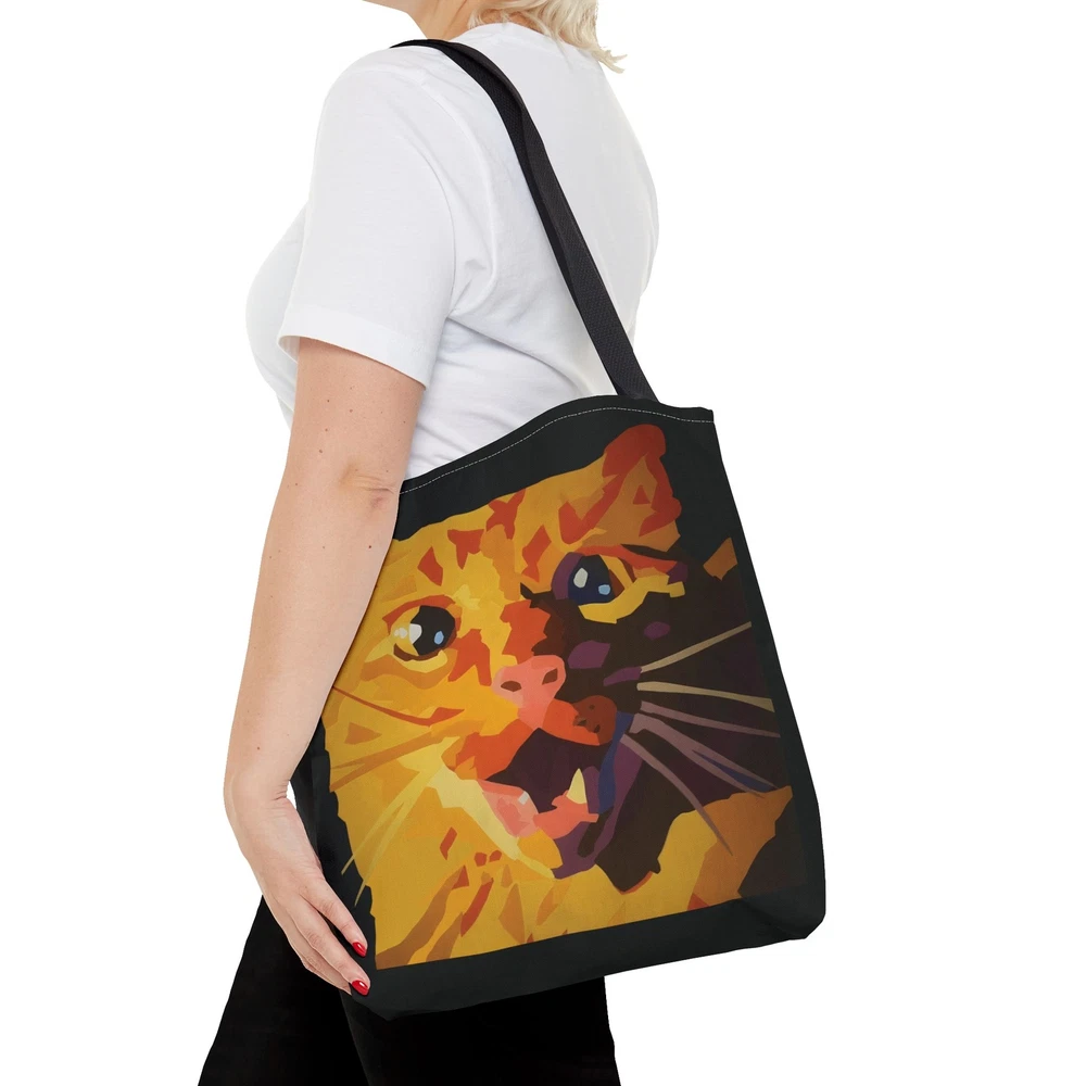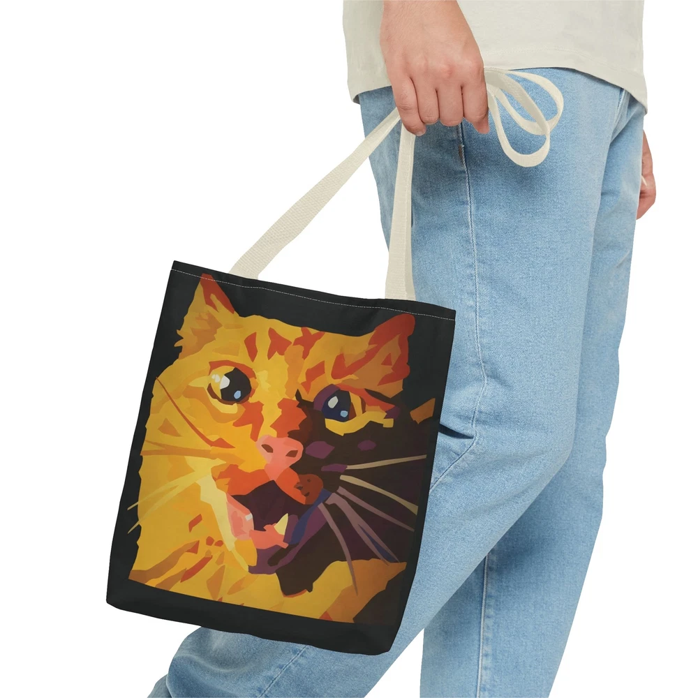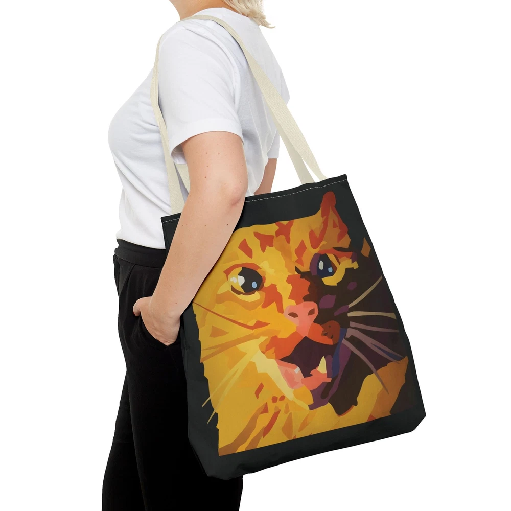 Carry a touch of sass and feline charm wherever you go with this tote bag, featuring a bold and cheeky bitey cat face design. Whether you're a cat lover or just appreciate a quirky accessory, this bag adds personality to your daily essentials. Eye-Catching Design : Show off your love for cats with this expressive bitey cat face, printed using fade-resistant dye sublimation technology for vibrant, all-over visuals. Durable Construction : Made from 100% spun polyester (6.49 oz/yd² or 200 g/m²), this medium-weight fabric is built to last, making it ideal for everyday use. Sturdy & Stylish : Double-stitched seams and a non-woven laminate lining ensure durability, while soft cotton webbing straps add comfort for carrying. Customizable Options : Choose from two handle colors to complement the design. Size Variety : Available in three sizes, each featuring a spacious single compartment to suit your storage needs. Size Tolerance : Minimal variance of ±0.75" (1.9 cm) for consistent quality. Whether you're shopping, commuting, or making a statement, this tote bag combines practicality with a touch of feline mischief. Perfect for cat enthusiasts or anyone who loves a unique and functional accessory! Care instructions: Remove all items from the bag before cleaning. Suggested to pretreat visible stains with stain remover. Mix warm water with laundry detergent and clean the bag with terry washcloth or a soft bristle brush. Let the bag air dry.