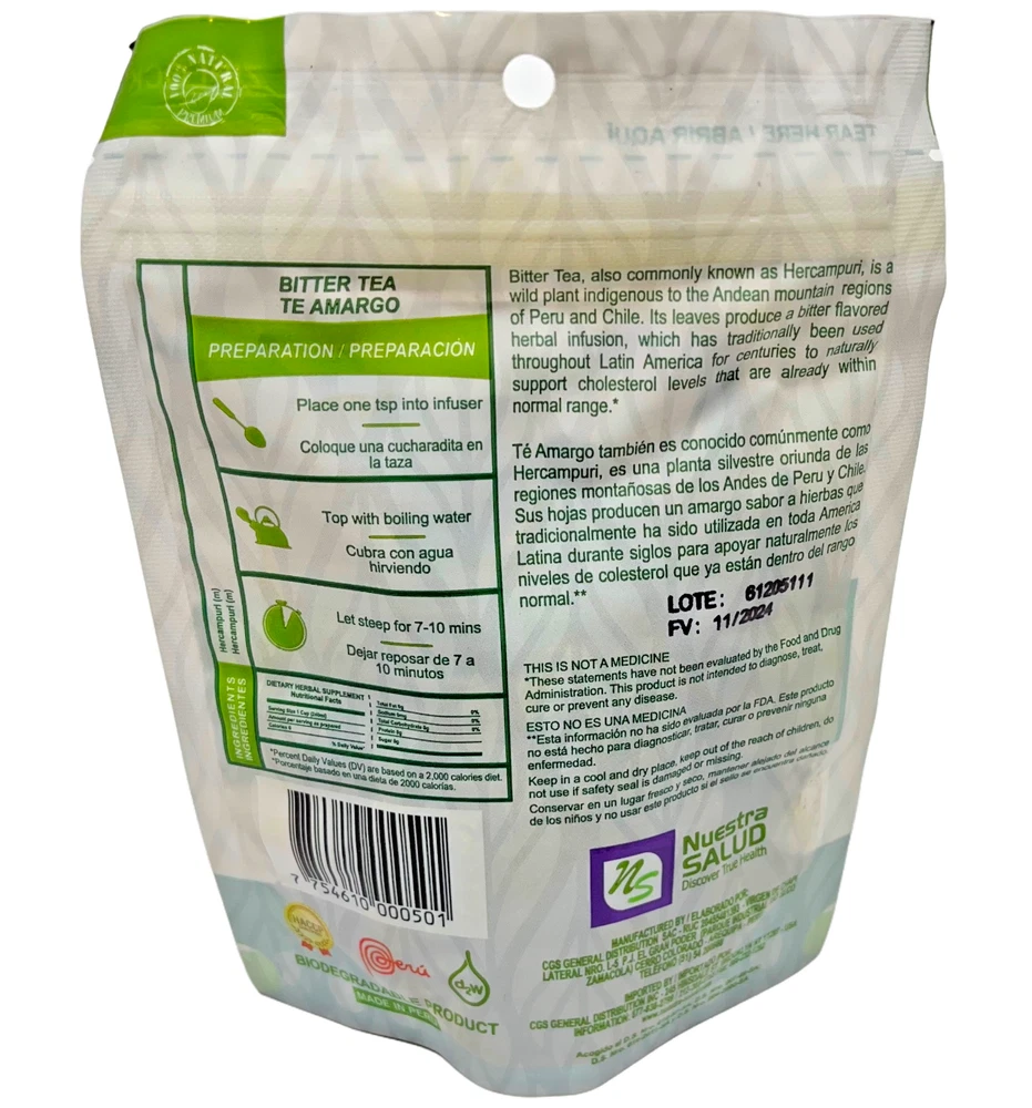 Macho Te Amargo Bitter Tea Herbal Infusion Tea Zip-Lock Bag (40g) Te Amargo Bitter Herbal Tea from Peru Discover the robust flavor and powerful benefits of Te Amargo, also known as Bitter Herbal Tea from Peru. This unique blend features the potent herb Hercampuri Macho, revered for its bitter taste and therapeutic properties. Uses: Digestive Aid: Te Amargo's bitter notes stimulate digestion, helping to relieve bloating and discomfort after meals. Liver Support: Hercampuri Macho is known to promote liver health, aiding in detoxification and maintaining liver function. Metabolism Boost: Enjoy Te Amargo as part of a balanced diet to support a healthy metabolism and weight management. Overall Wellness: With its rich herbal profile, Te Amargo can be a soothing addition to your daily routine, promoting overall wellness and vitality. Experience the natural goodness of Te Amargo Bitter Herbal Tea and immerse yourself in the healthful traditions of Peru. Strong Bitter Taste. Hercampuri is a blood Detoxifier Helps to eliminate low-density lipids in the blood. It facilitates the circulation and because of its diuretic action it is used to normalize blood pressure. Hercampuri helps energize the body because it helps balance the metabolism and improves circulation Te Amargo – Bitter Tea Hercampuri ( Gentianelle alborosea) Zip-Lock Bag 40g 1.41oz Superior Blends There’s an art to collecting and drying herbs; a technique passed down through Peruvian culture for centuries. We lean on this ancient knowledge to keep the potency of the herbs we collect at its peak. Our herbs are picked and packaged in their whole and unfiltered form to deliver the transformative nutrients just as Mother Nature intended: pure and simple. Next Level Freshness Taste the enchanting character of the Peruvian coast, angelic Andes, and majestic jungle. Our Peruvian herbal teas are diligently packed in zip-lock bags to tightly seal in the freshness and deliver enticing flavor with every sip. Whether you’re starting your day, re-charging your afternoon, or relaxing away in the evening, freshness will always be part of the equation. Discover the Variety Taste the enchanting character of the Peruvian coast, angelic Andes, and majestic jungle. Our Peruvian herbal teas are diligently packed in zip-lock bags to tightly seal in the freshness and deliver enticing flavor with every sip. Whether you’re starting your day, re-charging your afternoon, or relaxing away in the evening, freshness will always be part of the equation.