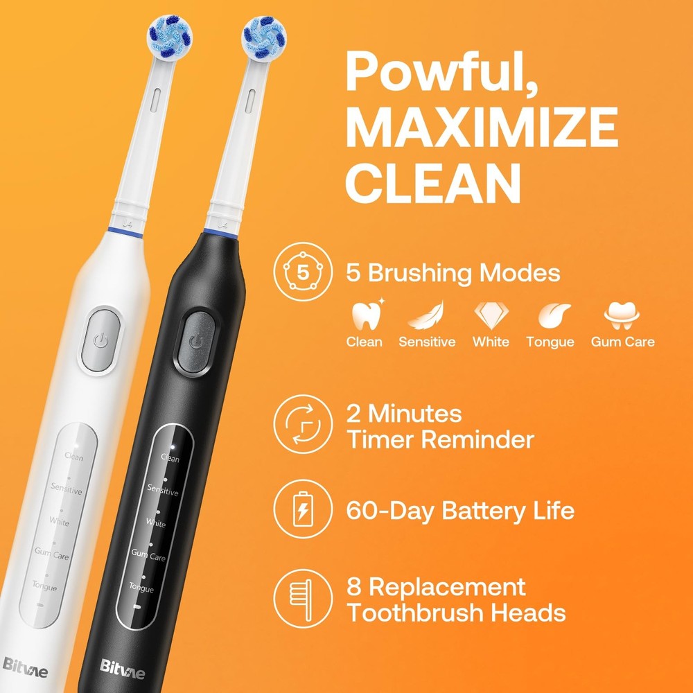 Tap here to read more about Bitvae Rotating Electric Toothbrush 2 Packs for Adults and Kids, 8 Brush Head... BUY WITH CONFIDENCE 100K+ Satisfied Buyers as your satisfaction is our top priority with easy returns, and dedicated support. FAST & RELIABLE SHIPPING All orders are processed quickly with reliable shipping partners. Most items ship within 24 hours. 20+ YEARS OF EXPERIENCE We pride ourselves on serving customers worldwide for over 20 years at lowest Possible Prices. Bitvae Rotating Electric Toothbrush 2 Packs for Adults and Kids, 8 Brush Head... Tap here to read more about Bitvae Rotating Electric Toothbrush 2 Packs for Adults and Kids, 8 Brush Head... Bitvae Rotating Electric Toothbrush 2 Packs for Adults and Kids, 8 Brush Heads 60-Day Battery Life, 5 Modes Power Toothbrush with 2-Minute Smart Timer, Black & White, R1 Superior Clean at a Dentist Level: Bitvae rechargeable electric toothbrush has a powerful motor, its rotating movements of the round brush head focus on cleaning each tooth and reaching areas that manual brushing might miss 8 Replacement Heads for 2 Years of Use: Say goodbye to pricey refills; This toothbrush is with 8 round-end bristle Heads; Bitvae rotary electric toothbrush are compatible with all Oral-B electric toothbrush handles and heads, except for iO and Sonic Gentle yet Effective Cleaning with 5 Modes: Clean, Sensitive, White, Gum Care, Tongue; From gentle cleaning to more intensive variable speed plaque removal to meet every family member's oral care needs Single Charge Lasts Up to 60 Days: This powerful electric toothbrush features a 3-hour quick-charge battery that lasts up to 60 days; It's perfect for travel, daily use, or for those who don't want the hassle of frequent recharging 2-Minute Smart Timer & IPX7 Waterproof: With a built-in timer that pulses every 30s, this electric toothbrush ensures thorough cleaning by guiding your brushing routine across all mouth quadrants; It's waterproof design allows for easy use in the bathroom Package Includes: 2 Bitvae R1 Toothbrush Handle, 8 Toothbrush Heads, 2 USB Cable (Adapter not included—please charge the toothbrush using a 5V-1A adapter), 1 Instruction Manual For your safety, keep the product away from water while charging. Always inspect the power cord for damage before use and ensure the charging port is completely dry. In the event the product falls into water, do not reach for it; simply unplug the charger immediately Item Specifics Included Components: Battery, Timer Package Type Name: Box Toothbrush Head Shape: Round Number Of Settings: 5 Number Of Pieces: 1 Model Name: R1 Age Range Description: Adult Item Package Quantity: 1 Bristle Material: Nylon Brand: Bitvae Target Audience: Unisex-Adults, Boys, Girls, Unisex-Kids Handle Material: Plastic About Us Payment Shipping Returns Welcome to Bixlife ! We are committed to providing high-quality products at competitive prices with exceptional customer service. Our mission is to make your shopping experience smooth, reliable, and worry-free. Every item we offer is carefully selected and shipped with care. Shop with confidence knowing your satisfaction is our top priority. Shop Smart. Shop Secure. Shop Bixlife! We only accept eBay Managed Payments . This allows you to securely pay with your preferred method, including major credit and debit cards, PayPal, Apple Pay, and Google Pay (where available). Payment is required at checkout to ensure fast and smooth order processing. Domestic Shipping Only We ship exclusively within the United States . No International Shipping We do not ship outside the USA at this time. Orders are processed and shipped promptly after payment is received. Tracking information will be provided once your order has been dispatched. We offer a 30-day return policy from the date of delivery. Items must be returned in their original condition and packaging . Buyers Remorse Returns : A 15% restocking fee will be applied. Return shipping costs are the responsibility of the buyer unless the item is defective or not as described. Refunds will be issued back to your original payment method once the return is processed. We hope you will love your purchase, however if you need to return it, we have a 60 day return policy. We hope you will love your purchase, however if you need to return it, we have a 60 day return policy. We hope you will love your purchase, however if you need to return it, we have a 60 day return policy. We hope you will love your purchase, however if you need to return it, we have a 60 day return policy. Other Deals Bitvae R2 Rotating Electric Toothbrush for Adults with 8 Brush Heads, 5 Modes... $54.78 Laifen Wave Electric Toothbrush, Oscillation Vibration Sonic Electric Toothb... $118.74 Laifen Wave Special Electric Toothbrush, New 2025 Version Oscillation Vibrat... $124.24 Tao Clean UV Sanitizing Sonic Toothbrush and Cleaning Station, Electric Tooth... $158.58 V-WHITE Ultrasonic U-Shaped Toothbrush for Teeth Whitening, Electric Toothbru... $56.14 Rtauys 2 Pack Electric Toothbrush for Adults - 2 Rechargeable Electric Toothb... $53.42 Add suggested items to your listings - Check it out on 3Dsellers.com eBay listing template by 3D sellers.com - Try for Free!