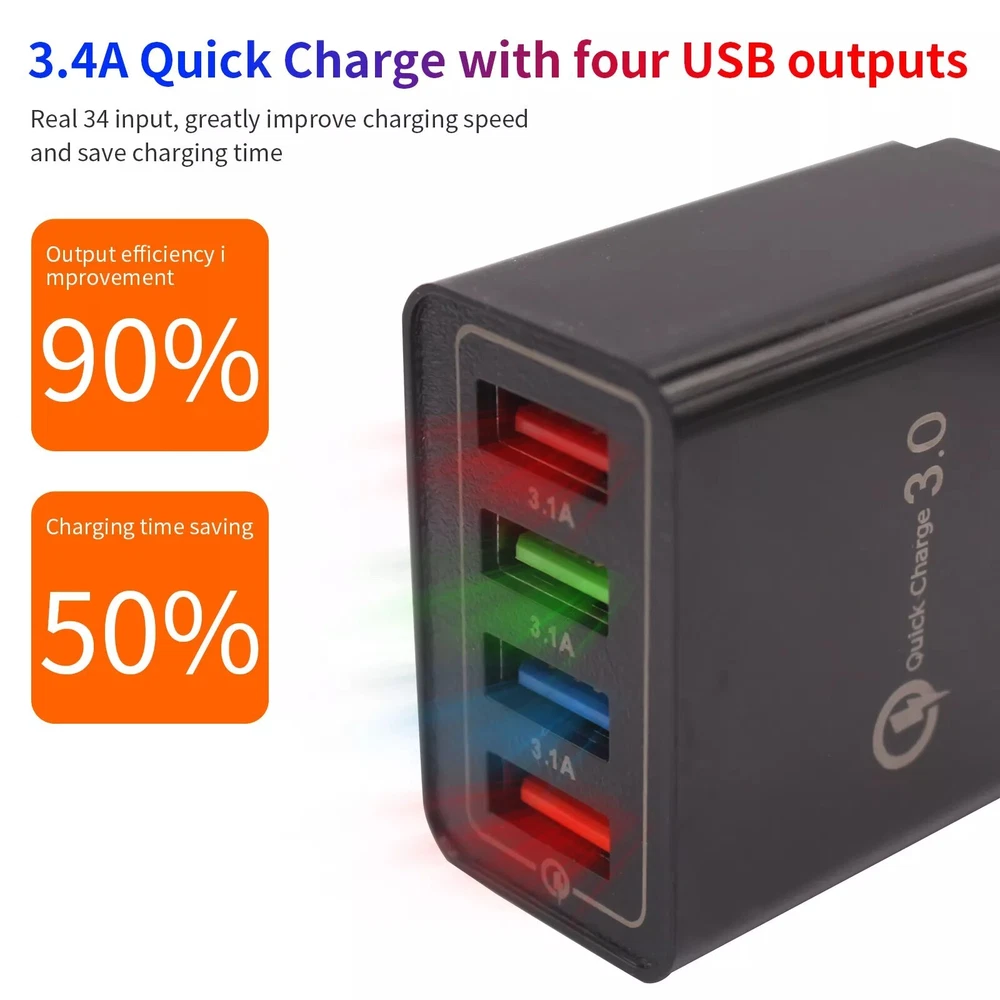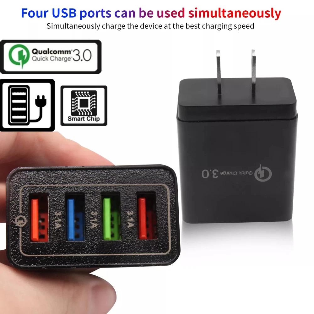 Black US 4 Port Fast Quick Charge QC 3.0 USB Hub Wall Charger Power Adapter Plug Description 1. Portable charger for home, office, travel and other indoor uses. 2. 4 USB ports (fast charge 3.0 and 4 USB ports 5 V/ 3A max.), Load 4 devices at the same time. 3. The protections keep you and your devices more secure. 4. Compatible with all smartphones for iPhone iPad Samsung Xiaomi, Huawei, OPPO, OnePlus, Sony, Google and PC Camera Tablet MP3, MP4 player, PSP with USB port. 5. Intelligent matching stream. Integrated smart chip, according to different devices, compatible with the required output, fast charging and does not damage the battery. Specifications: 1.Input voltage: 100-240 V 50-60Hz 2.Output: 5 V / 3 A (max.) 3.Standard plug: American plug 4.Color: Black Package Included: 1 x QC 3.0 Quick Charger