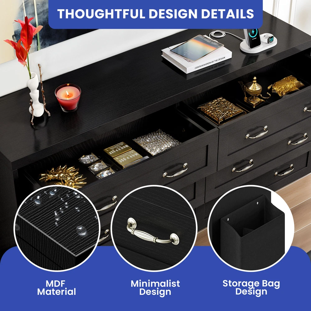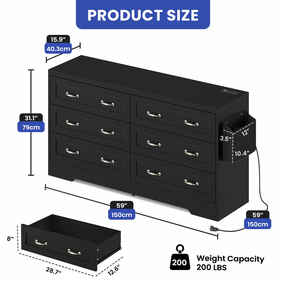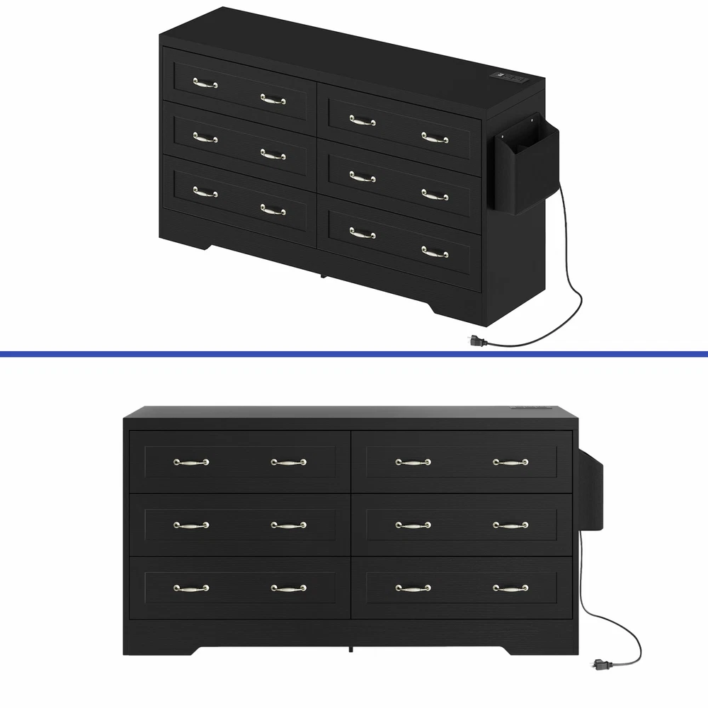 Black 6 Drawer Chest of Drawers Dresser with USB Charging Station for Bedroom Product Description NOTE: Professional Installation would be Highly Recommended. Description: 1. Color: Black 2. Material: Particle Board & MDF Wood 3. Charging Station: 2 AC Ports & 2 USB Ports 4. Ideal For: Wardrobe Drawer, Bookcase Drawer, Chest of Drawer, Storage Cabinet, Sideboard Storage, Drawer Dresser 5. Room Type: Entryway, Bedroom, Living Room, Home Office/Study, Dining Room, Kitchen, TV Room 6. Special Features: With Drawers, With Side Bag/Pocket Storage, With USB Charging Station, and Easy to Clean Features: 1. Elegant Storage Solution: Elevate your space with our buffet cabinet featuring 6 sleek drawers for organizing kitchenware or living essentials. The spacious top is perfect for a coffee station or displaying vases , while the convenient side pocket keeps everyday items within reach. 2. Practical Charging Features: Say goodbye to tangled cords with this cabinet's 2 built-in AC outlets and 2 USB ports . Whether you're charging your phone, running a blender, or keeping devices powered up, this buffet cabinet offers effortless and stylish convenience for your modern lifestyle. 3. Versatile Cabinet: Add functionality to any room with this versatile cabinet. Use it as a storage solution in the kitchen , a chic vanity in the bathroom , a TV stand in the living room , or an elegant sideboard in the hallway . Its adaptable design seamlessly fits into various spaces in your home. 4. Sturdy Build, 300lbs Capacity: Constructed from solid P2 MDF with a reinforced bottom base , this drawer buffet can support up to 300 lbs . Its water-resistant surface ensures easy maintenance and durability, making it a reliable and long-lasting addition to any space. 5. Timeless Retro Charm: Refresh your space with the delightful retro charm of this drawer dresser . The clean black finish, concave doors, and vintage hardware effortlessly blend rustic and refined styles, offering a perfect balance of timeless elegance and functionality for your home decor. Dimensions: 1. Product Dimensions: 59 '' L x 15.9'' W x 31.1" H 2. Side Bag Dimensions: 12" L x 3.5" W x 10.4" H 3. Drawer Dimensions: 28.7" L x 12.6" W x 8" H 4. Overall Product Weight: 122.13 lbs. 5. Height Bottom to Floor: 4.7 Inch 6. Weight Capacity: 200 lbs. Package Included: 1 x Cabinet 1 x Instructions 1 x Accessory Kit Shipping 1. Normally the item will be dispatched within 1 business day if payment is cleared before 12pm PST. 2. Please verify the correct shipping address in your PayPal account before making the payment. 3. We only dispatch the item to the address that is sent to us at the time of checkout. 4. We don't ship to Hawaii, Alaska, Puerto Rico, APO/FPO/PO Boxes. 5. We don't provide local pick-up service. 6. Normally we will use USPS, UPS, FedEx & LTL to dispatch items. Payment 1. We accept PayPal and credit card. 2. We will ship to the confirmed Paypal shipping address that is provided with the payment only. Return 1. 30 days Money Back Guarantee. 2. Please contact our customer service to receive a RMA form first if want to return the item. 3. All returned items MUST in new condition with the original package. Contact If has any problem, please contact us by sending an ebay message. Our customer service will resolve the problem as soon as possible.