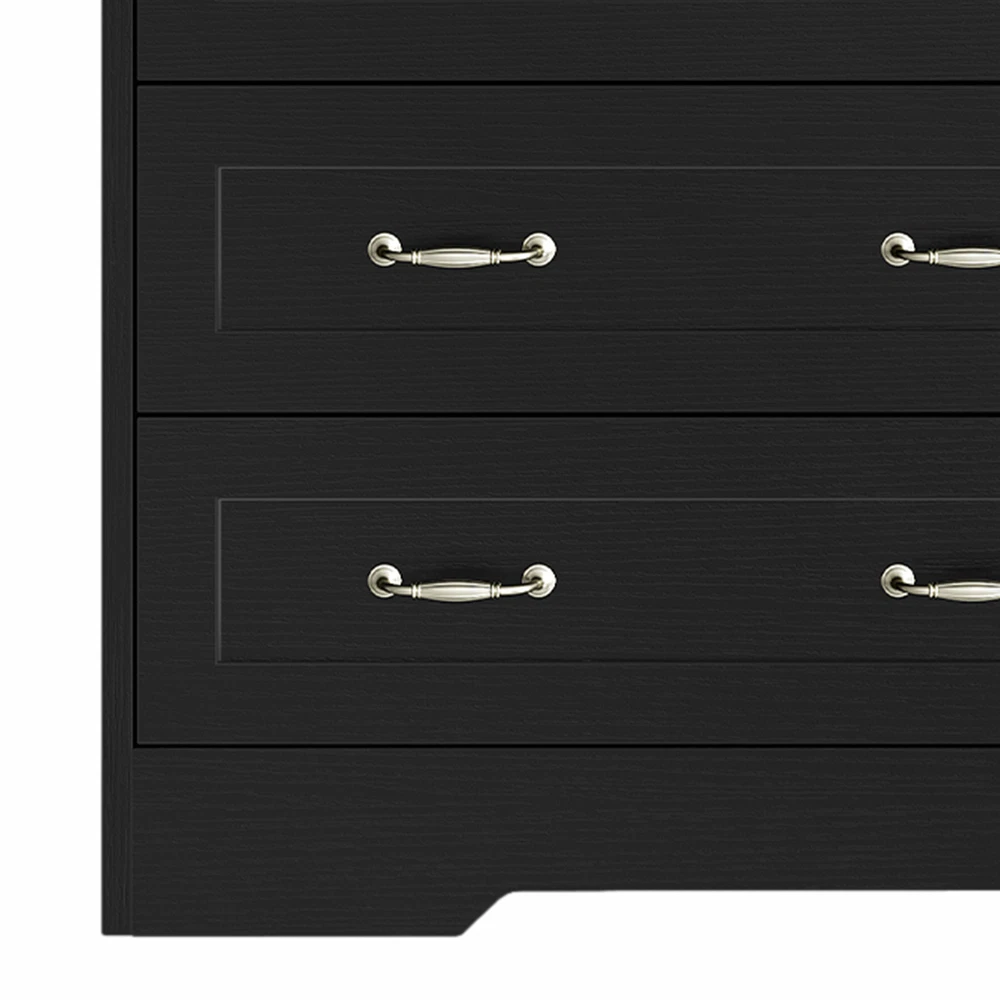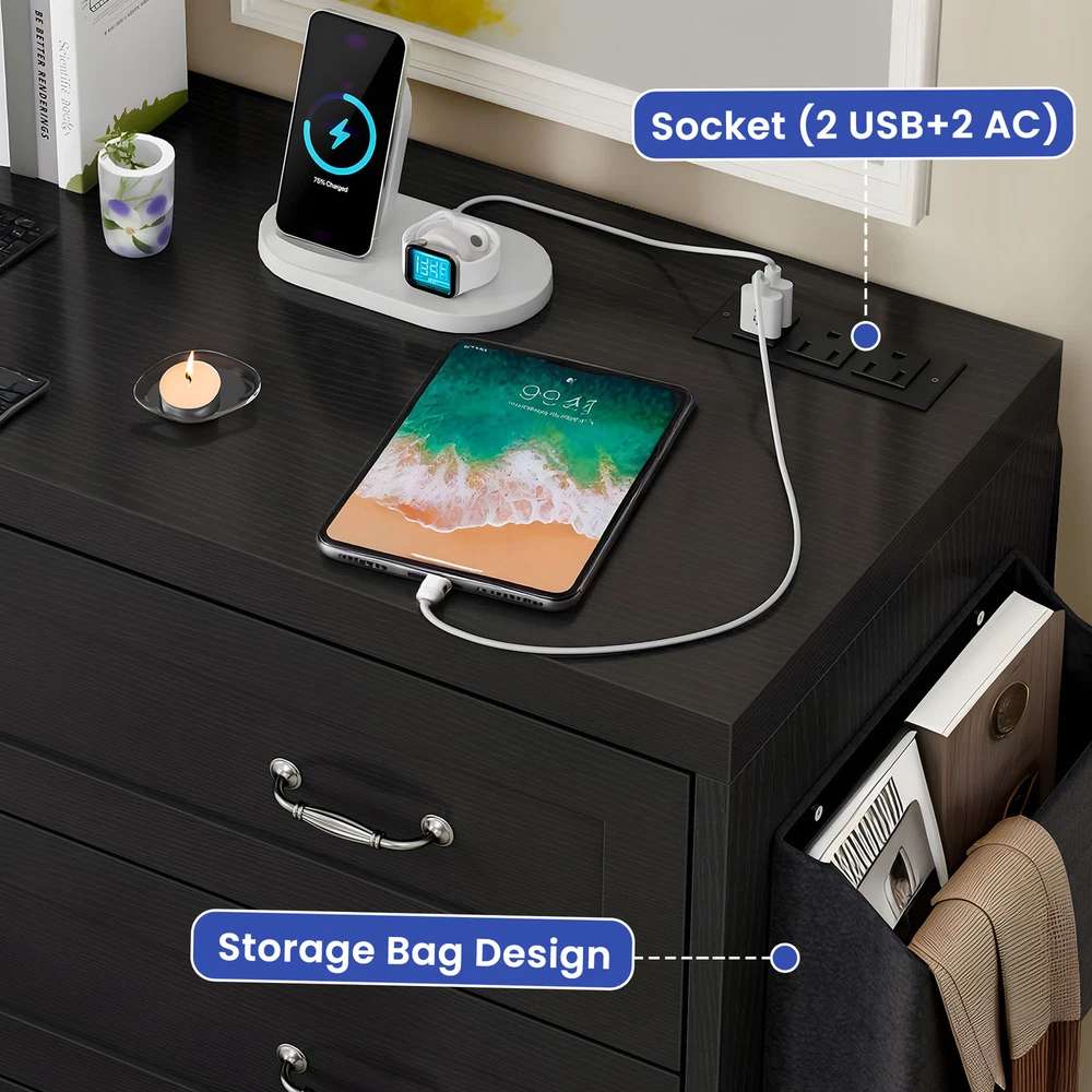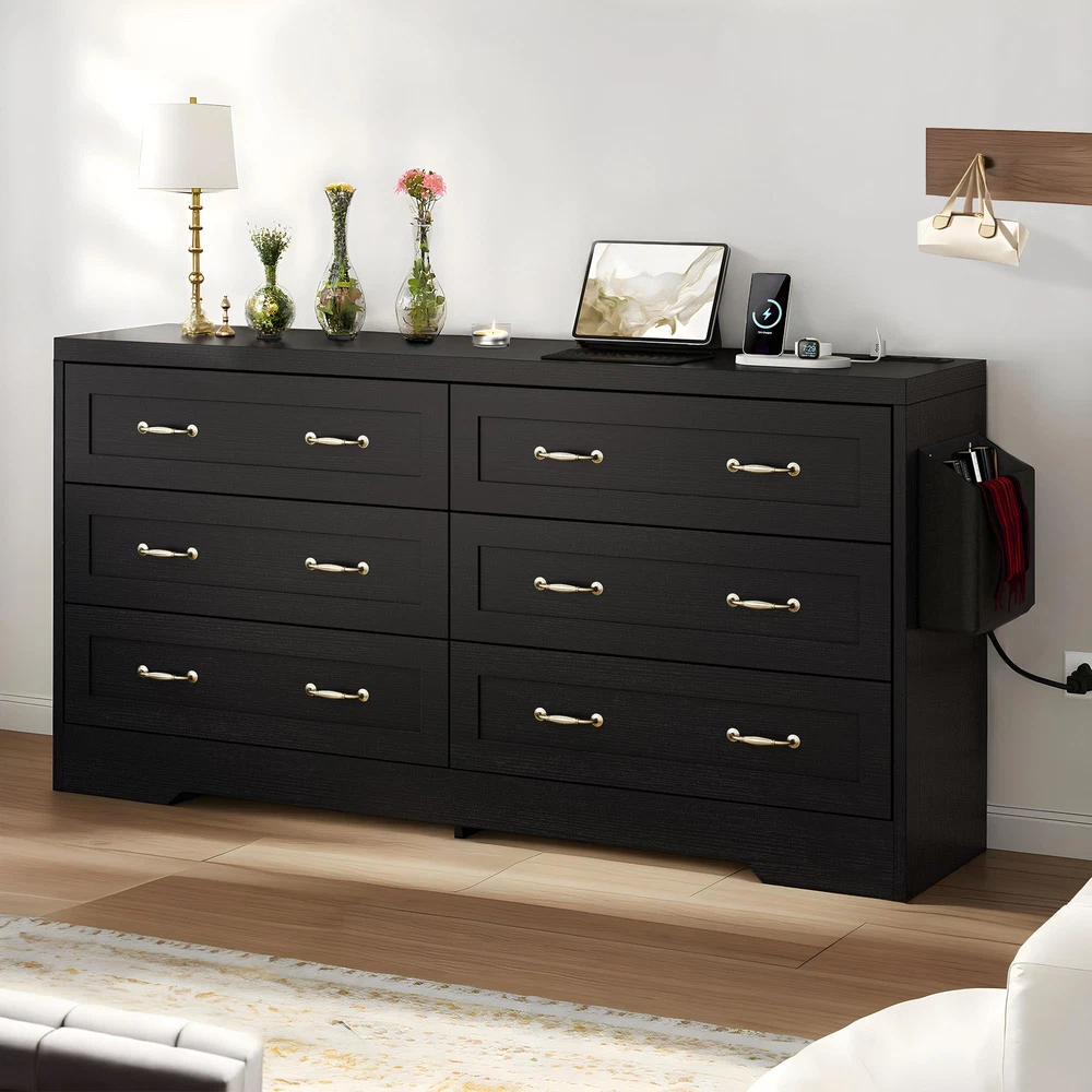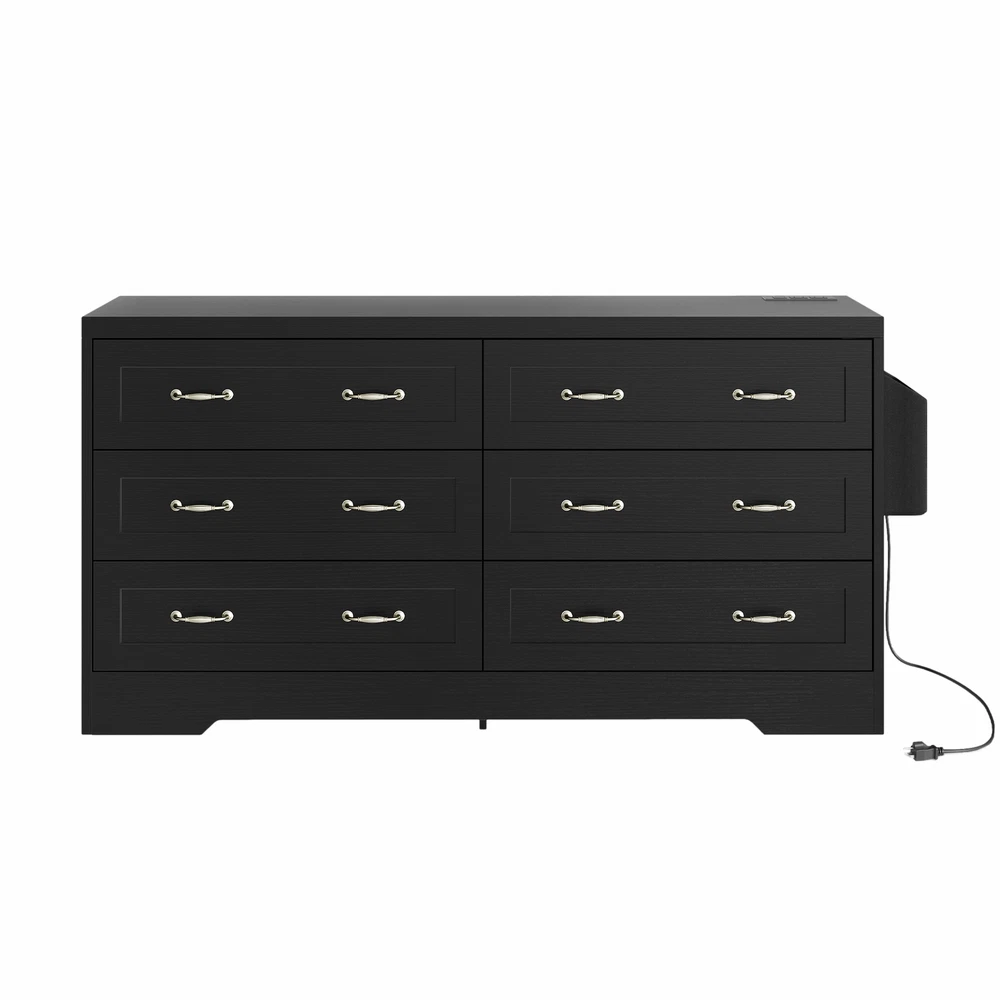 Black 6 Drawer Chest of Drawers Dresser with USB Charging Station for Bedroom Product Description NOTE: Professional Installation would be Highly Recommended. Description: 1. Color: Black 2. Material: Particle Board & MDF Wood 3. Charging Station: 2 AC Ports & 2 USB Ports 4. Ideal For: Wardrobe Drawer, Bookcase Drawer, Chest of Drawer, Storage Cabinet, Sideboard Storage, Drawer Dresser 5. Room Type: Entryway, Bedroom, Living Room, Home Office/Study, Dining Room, Kitchen, TV Room 6. Special Features: With Drawers, With Side Bag/Pocket Storage, With USB Charging Station, and Easy to Clean Features: 1. Elegant Storage Solution: Elevate your space with our buffet cabinet featuring 6 sleek drawers for organizing kitchenware or living essentials. The spacious top is perfect for a coffee station or displaying vases , while the convenient side pocket keeps everyday items within reach. 2. Practical Charging Features: Say goodbye to tangled cords with this cabinet's 2 built-in AC outlets and 2 USB ports . Whether you're charging your phone, running a blender, or keeping devices powered up, this buffet cabinet offers effortless and stylish convenience for your modern lifestyle. 3. Versatile Cabinet: Add functionality to any room with this versatile cabinet. Use it as a storage solution in the kitchen , a chic vanity in the bathroom , a TV stand in the living room , or an elegant sideboard in the hallway . Its adaptable design seamlessly fits into various spaces in your home. 4. Sturdy Build, 300lbs Capacity: Constructed from solid P2 MDF with a reinforced bottom base , this drawer buffet can support up to 300 lbs . Its water-resistant surface ensures easy maintenance and durability, making it a reliable and long-lasting addition to any space. 5. Timeless Retro Charm: Refresh your space with the delightful retro charm of this drawer dresser . The clean black finish, concave doors, and vintage hardware effortlessly blend rustic and refined styles, offering a perfect balance of timeless elegance and functionality for your home decor. Dimensions: 1. Product Dimensions: 59 '' L x 15.9'' W x 31.1" H 2. Side Bag Dimensions: 12" L x 3.5" W x 10.4" H 3. Drawer Dimensions: 28.7" L x 12.6" W x 8" H 4. Overall Product Weight: 122.13 lbs. 5. Height Bottom to Floor: 4.7 Inch 6. Weight Capacity: 200 lbs. Package Included: 1 x Cabinet 1 x Instructions 1 x Accessory Kit Shipping 1. Normally the item will be dispatched within 1 business day if payment is cleared before 12pm PST. 2. Please verify the correct shipping address in your PayPal account before making the payment. 3. We only dispatch the item to the address that is sent to us at the time of checkout. 4. We don't ship to Hawaii, Alaska, Puerto Rico, APO/FPO/PO Boxes. 5. We don't provide local pick-up service. 6. Normally we will use USPS, UPS, FedEx & LTL to dispatch items. Payment 1. We accept PayPal and credit card. 2. We will ship to the confirmed Paypal shipping address that is provided with the payment only. Return 1. 30 days Money Back Guarantee. 2. Please contact our customer service to receive a RMA form first if want to return the item. 3. All returned items MUST in new condition with the original package. Contact If has any problem, please contact us by sending an ebay message. Our customer service will resolve the problem as soon as possible.