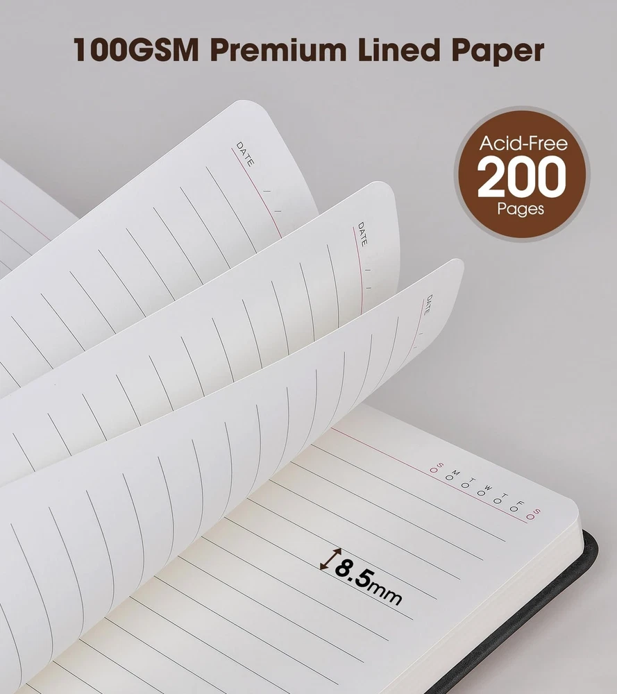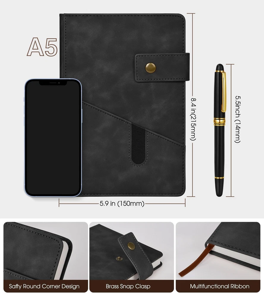 Black A5 Lined Leather Journal Notebook,Personalized Hardcover Journal Set with Pen & Gift Box,100Pages 100gsm Thick Ruled Paper Daily Diary for Men Women School,Travel,Business,Work,Home Writing Product Details Color: Black with Gift Box Size: A5 Brand: vfaejll MPN: vfaejll155881 UPC: Does not apply EAN: Does not apply Brand: vfaejll Color: Black with Gift Box Theme: Book Sheet Size: A5 Pages: 200 Pages Cover Material: Leather Style: Lined Journal Notebook Ruling Type: Ruled Special Feature: Hard Cover Product Dimensions: 8.2"L x 5.7"W x 0.78"Th Manufacturer: ‎vfaejll Brand: ‎vfaejll Item Weight: ‎3.53 ounces Product Dimensions: ‎8.4 x 5.9 x 0.78 inches Item model number: ‎vfaejll155881 Color: ‎Black with Gift Box Cover Material: ‎Leather Number of Items: ‎1 Size: ‎A5 Ruling: ‎Ruled Sheet Size: ‎A5 Manufacturer Part Number: ‎vfaejll155881 Date First Available: September 1, 2021 Value of Money Hardcover Journal Set- Classic black ruled notebook, journals are elegant, quality crafted books available at a surprisingly competive price and quality. A huge choice for everyday use, provides plenty of space for notes, lists, musings, and more. And each notebook will give away a luxury metal penexquisite gift box packaging and bags,This is one of our best journal gifts. Premium Thick Paper- 5.9 X 8.4 inch journal notebook with 200 pages 100 gsm lined paper, thicker 30% than normal, this black notebook is designed to avoid feathering and the paper is ink-proof, suit for most pens, but the wettest pen inks. Archival-quality pages made from acid-free paper-resists damage from light and air, the cream paper is easy on eyes.Let your creation more freedom on the wide ruled journal to write in. Soft Faux Leather Journal Notebook- This elegant journal notebook has suede hardcover but feel soft in hand, just like a baby's skin. Fashion but reliable cover adapts to the movements of body without damage. The notebook's hard cover protects the pages inside and doubles as a convenient writing surface. Great gift for any. Gusseted Design- Gusseted pocket design and cardboard bound cover,metal buckle helps keep notebook securely closed, making it easy to write in the notebook from just about anywhere. This notebook provide you a high quality writing experience.Expandable gusseted pocket for stashing loose notes,business cards, receipts, mobile phone, or other small items. Great Use & Perfect Journal GiftsIdeal for all office,school and home use,including for taking notes and keeping work in order,as a diary or journal for brainstorming ideas,creative writing or just doodling and drawing to your hearts content.This personalized journal notebook is a great birthday,mothers day,fathers day,children's day,graduation,Christmas journal gifts.It is an ideal gift for mom,dad, teachers,classmates,colleagues,wife,husband,friends,daughters,sons and granddaughter.