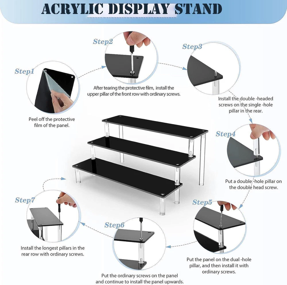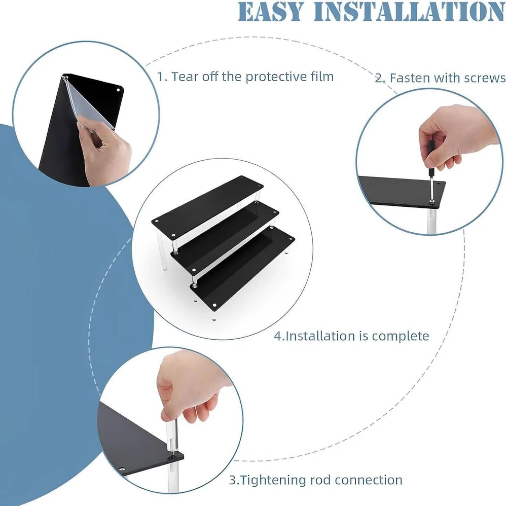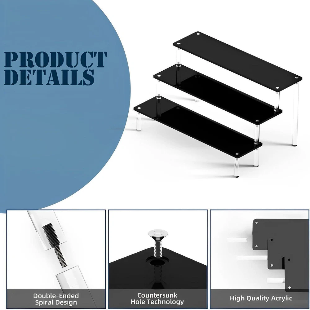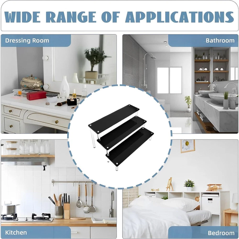 NEW! Black Acrylic Shelf Riser - 3 Tier Perfume Organizer Cologne Display Stand - Large Cupcake Stand Shelf for Desserts Holder Collection Cosmetic Products Tabletop Use Keep things Orangeized: Acrylic Display Shelf can help organize and display your items on the table, You can find them quickly and easily. This Black Display Stand can be used to place figurines, cupcakes, perfume, small plants and more of your items Material: Display Shelf made of 4mm sturdy acrylic material, Display Stand is strong and perfect, Cupcake Stand that provides enough space to cologne perfume, cosmetic, collectibles and etc Size: Every acrylic panel is 11.8IN long and 3.15IN wide, The total dimensions after assembly about is 11.8L×7.87W×5.9H inch Easy to Assemble and Clean: Acrylic Display Shelf can be assembled in three minutes and it is easy to clean and store when you don't use it. In order to prevent scratches during transportation, side of the board are attached with protective films,please tear off the protective film from the plate