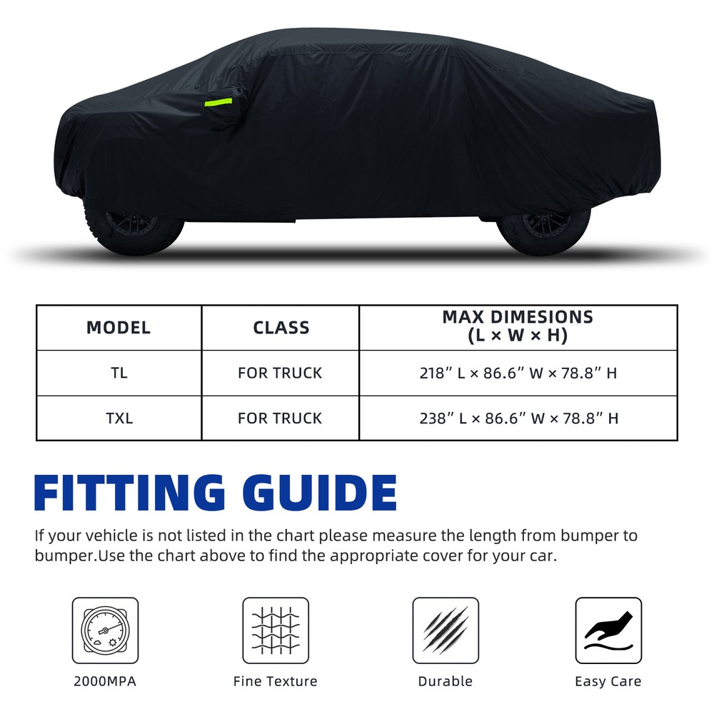 This full cover is a game-changer for my Tundra! The all-weather protection holds up perfectly against sun, rain, and dust while staying lightweight. Fits snug without scratching, and the waterproof feature actually works—no more wet seats after storms. Blocks UV rays like a champ and resists wind surprisingly well. Installation takes seconds, and the material feels durable yet breathable. Keeps my truck spotless between uses—worth every penny for outdoor parking!