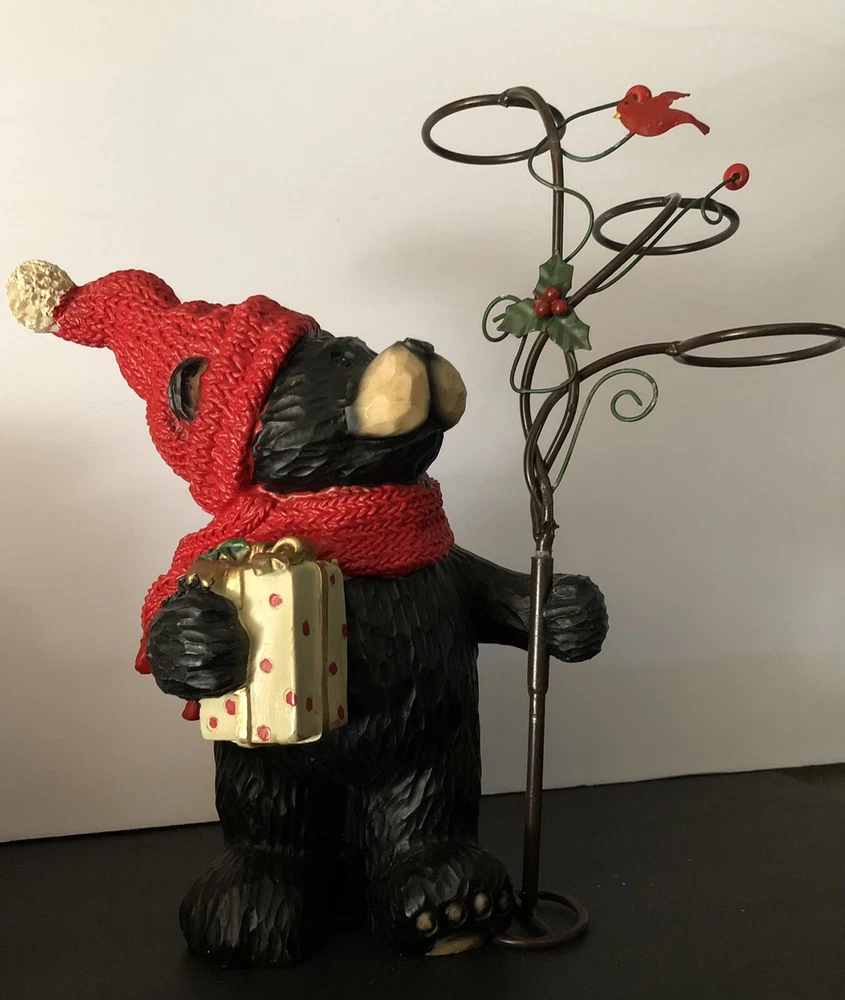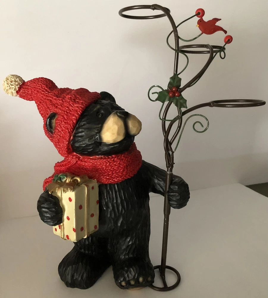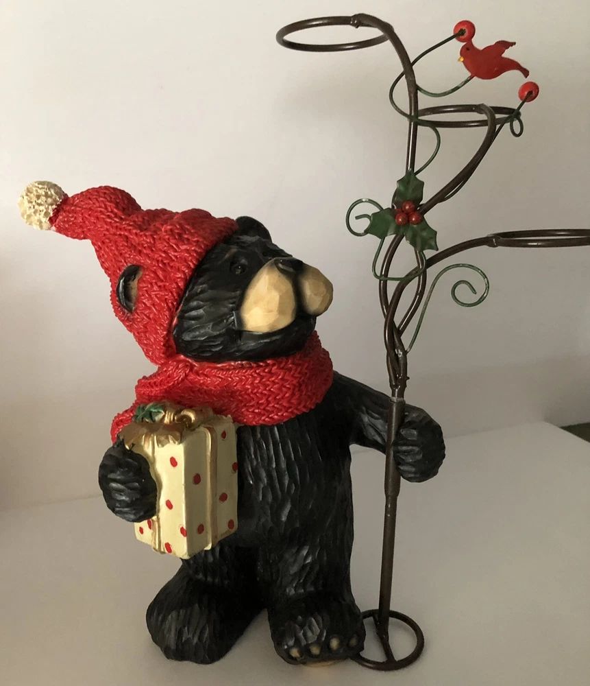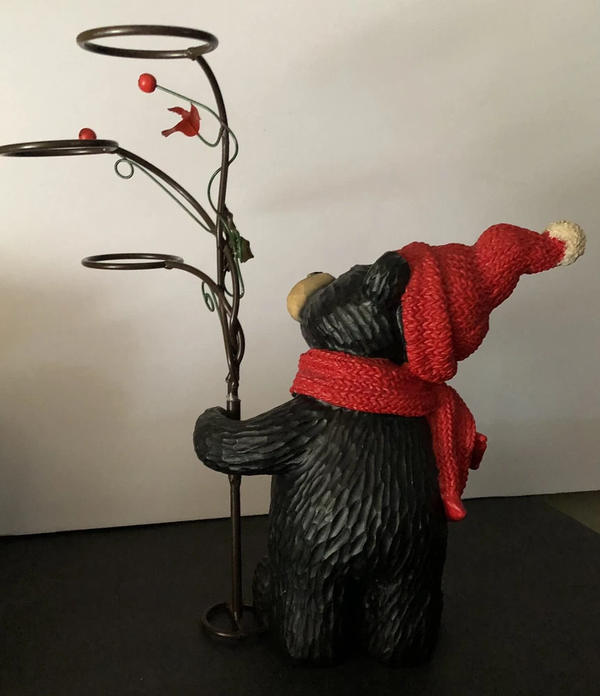 Black Bear Looking At red Cardinal Christmas candle Holder 2 pc Holiday figure. This is a 2 pc set. Tree can be removed. Bear holding tree is 12" tall. Bear without tree is 9" tall. Opening of candle holder is 2". Simply adorable holiday piece. Very nice condition. Little details like red cardinal on tree and present bear is holding make this even cuter. votives holders not included.