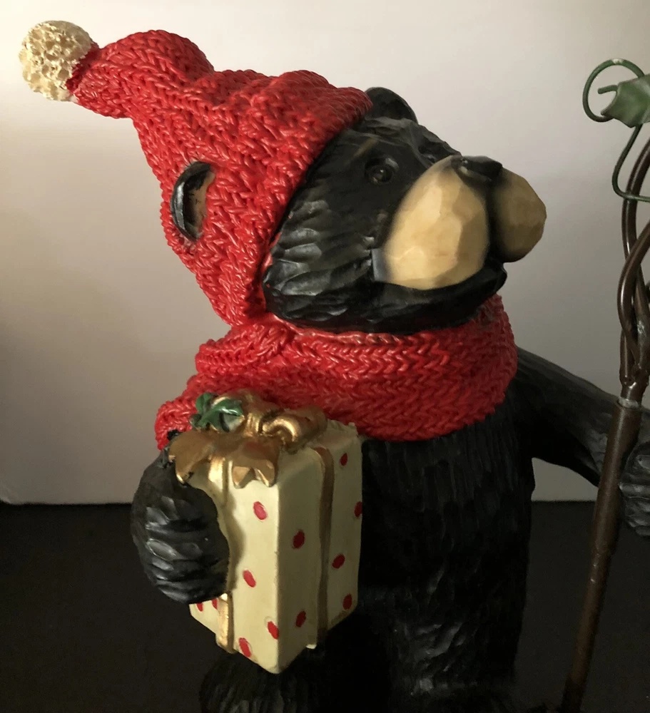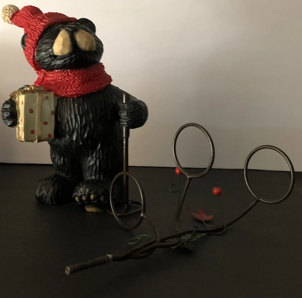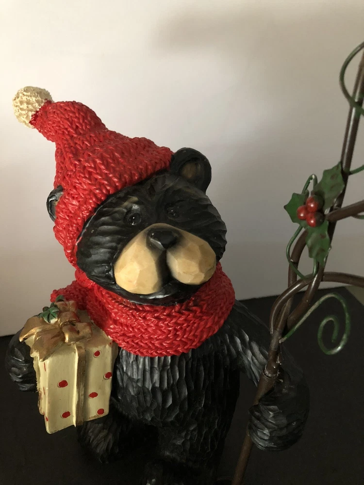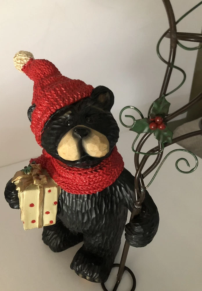 Black Bear Looking At red Cardinal Christmas candle Holder 2 pc Holiday figure. This is a 2 pc set. Tree can be removed. Bear holding tree is 12" tall. Bear without tree is 9" tall. Opening of candle holder is 2". Simply adorable holiday piece. Very nice condition. Little details like red cardinal on tree and present bear is holding make this even cuter. votives holders not included.