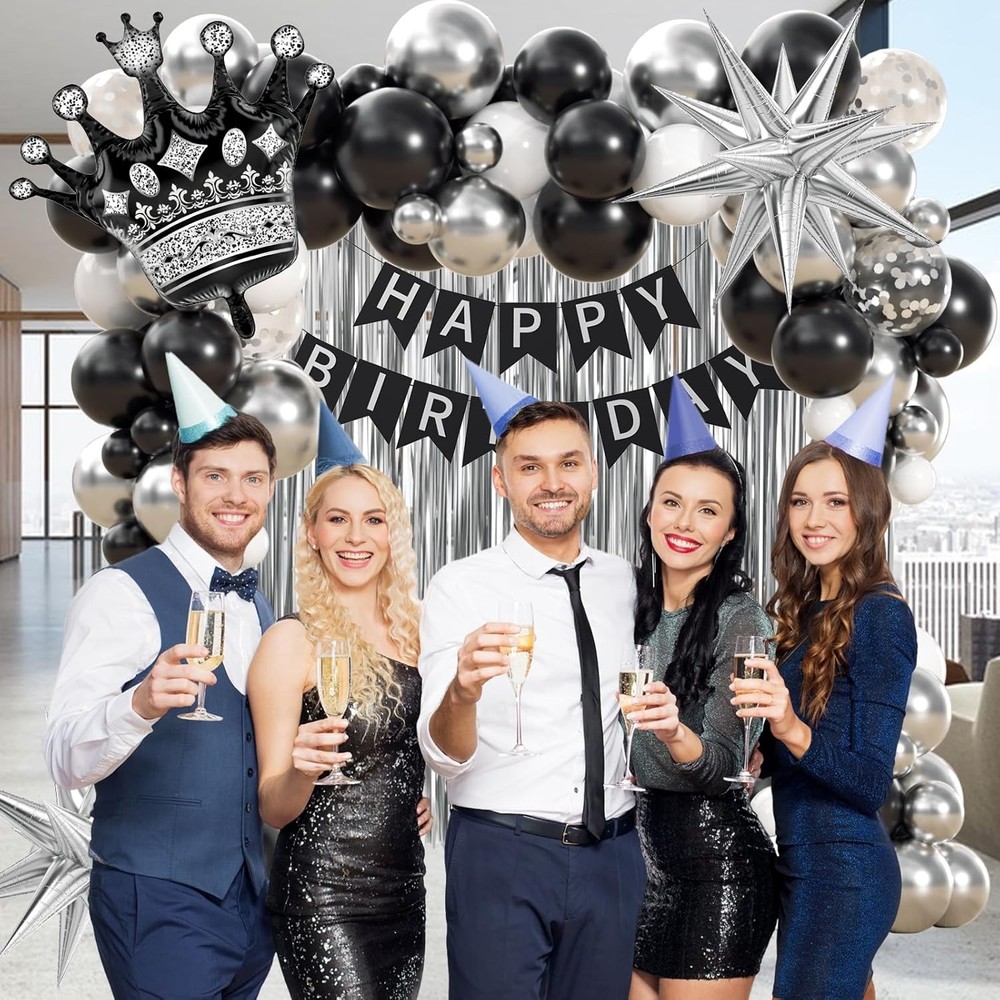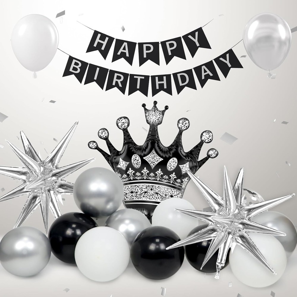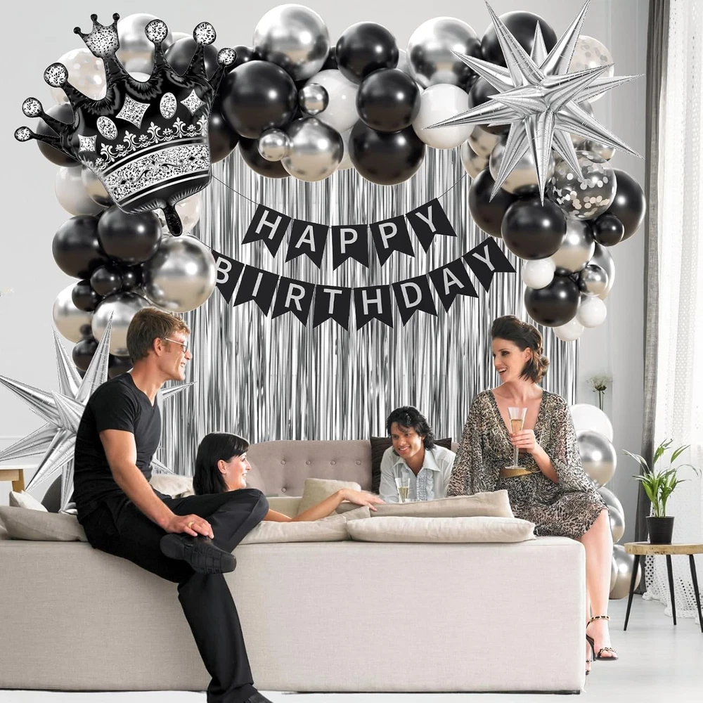 Black Birthday Decorations for Men with White Black and silver Balloons Banner Metallic Silver Fringe Curtain for 21st 25th 27th 30th 35th 40th 50th 60th Men Birthday Decorations Black Birthday Decorations for Men with White Black and silver Balloons Banner Metallic Silver Fringe Curtain for 21st 25th 27th 30th 35th 40th 50th 60th Men Birthday Decorations FREE AND FAST SHIPPING! About this item Package Included: The black and silver birthday decorations kit includes 10inch white balloonsx10, 10inch black balloonsx15, 10inch metallic silver balloonsx10, 12inch silver confetti balloonsx3, happy birthday bannerx1, black foil balloonx1,silver foil balloonsx2, metallic silver fringe curtainx1, glue dotsx60, ribbonx1, decorative stripx1 Full Birthday Decoration Set: The comprehensive black and silver party decorations kit includes a Happy Birthday banner, fringe curtain, and balloons. Great for creating a backdrop or photo booth for celebrations Easy to Use: The black and white birthday decorations bring charm to your party, creating unforgettable memories. The birthday decorations for men includes glue dots and ribbons for easy balloon arch setup. Hang banners and balloons on walls, windows, or any indoor or outdoor space you like Suitable Occasion: The black happy birthday decorations kit is great for many party decorations for men, such as black birthday party decorations for men, adults, can be used as 16th, 18th, 21st, 25th, 30th, 40th, 50th, 60th, 70th birthday party decorations Warm Tips: If there are any issue with the men birthday deorations set, we will work hard to solve them until you are satisfied Product We offer a 30-Day Return Policy on items which you are not completely satisfied with. You have the option for a full-refund or an exchange of the item. No returns are available on items shipped outside of the US . Shipping We offer Free Shipping to the US and ship within 2 business days of payment, usually sooner. We use UPS express shipping. That's why your products are usually delivered within 3 days . Contact We try our very best to make sure every customer is completely satisfied. If there's a problem , message us! We're happy to help. 24/7 live chat available.