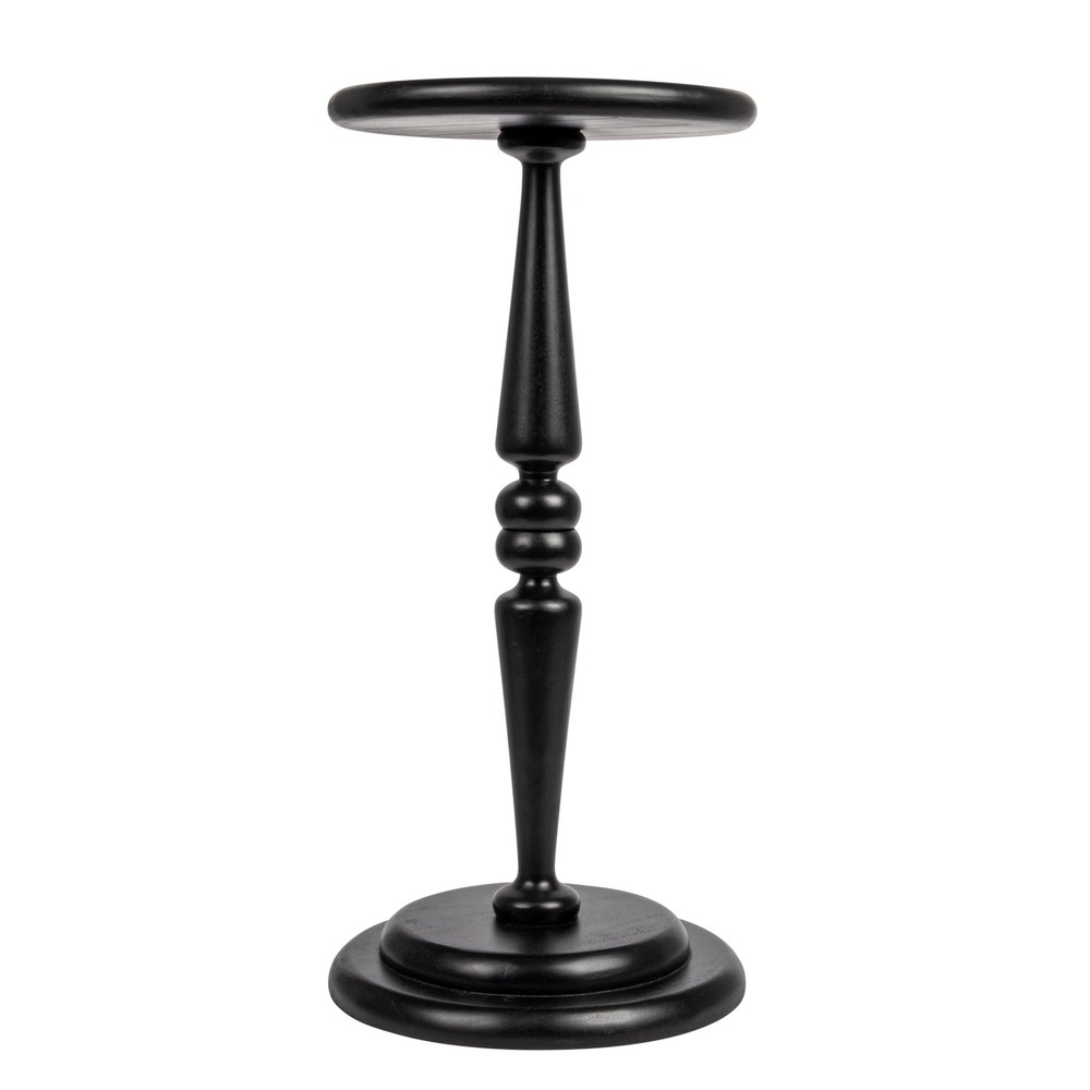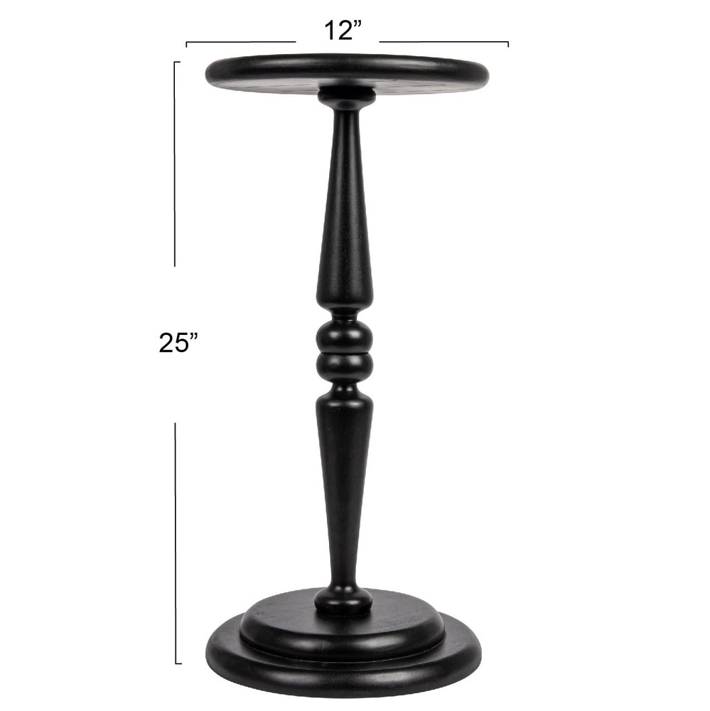 This round solid wood pedestal coffee table features a thick rounded edge top and a heavy solid wood base; It is ideal for use next to an accent chair in a living room, bedroom, or anywhere you may need to rest a martini Lathe turned solid hardwood Assembles in minutes with no tools required; Felt pads are included on base Base is double the thickness of the top to add weight and promote stability End table measures 12 inches diameter x 25 inches H
