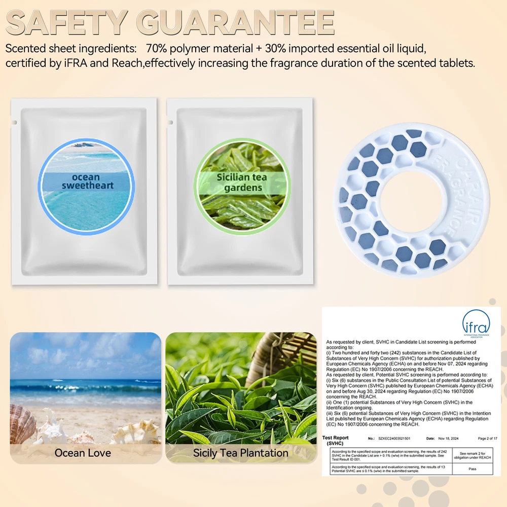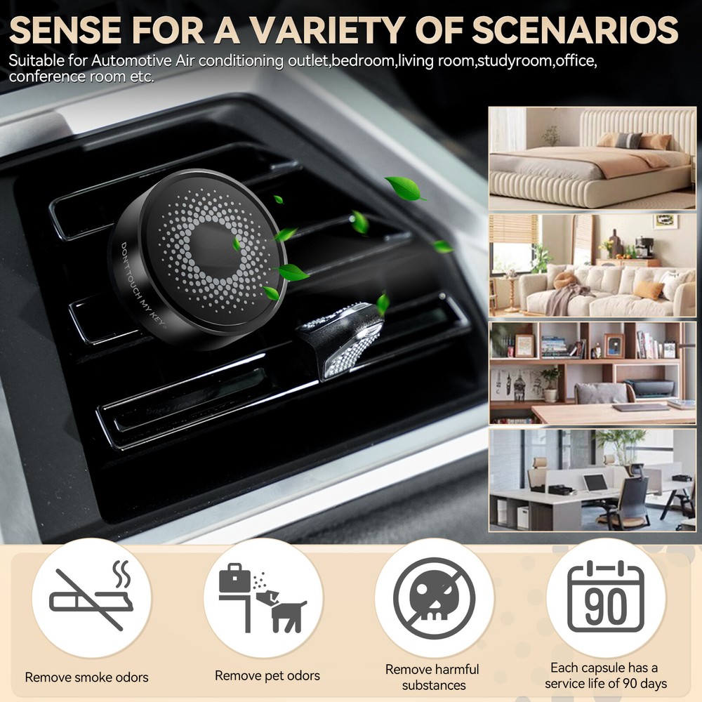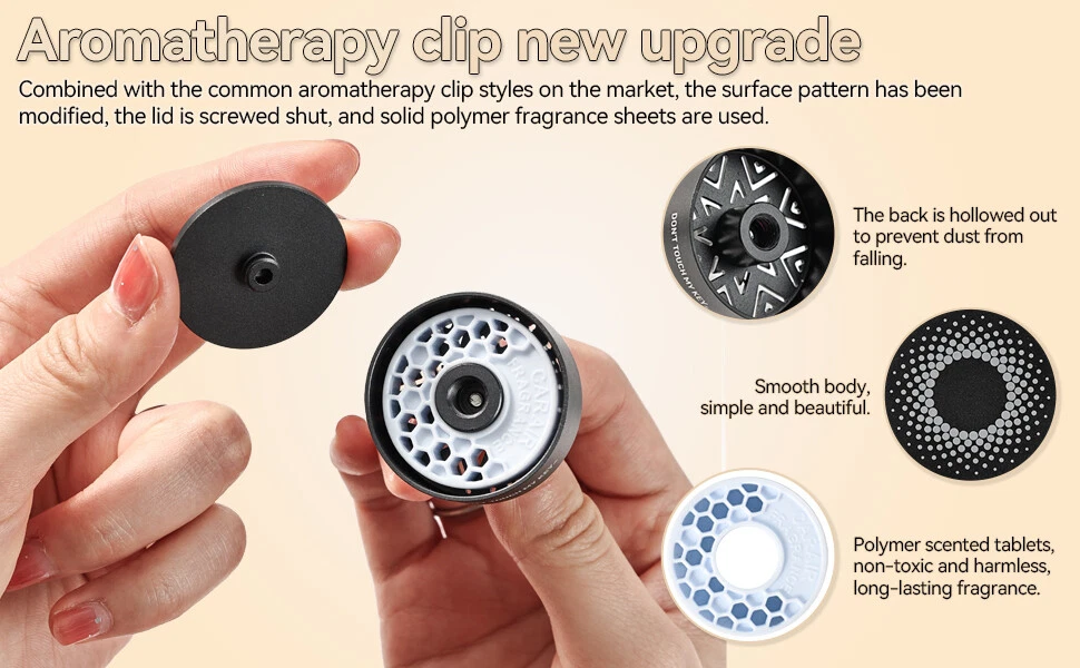 Aromatherapy Car Air Vent Diffuser Description: Natural Design: Car diffuser vent clip, with exquisite and simple appearance, is a good choice for aromatherapy lovers. High-quality material: Car diffuser vent clip is made of high-quality aluminum alloy, which is lighter than other vent clips. 70% polymer material + 30% imported essential oil stock liquid, can effectively reduce odors in the car, such as pet, smoke, etc. The aroma around you keeps you alert while driving, allowing you to enjoy a relaxing journey and bring you a good mood. Multi-purpose: Mini aromatherapy car oil diffuser vent clip, you can place it anywhere you like, such as your car, office, bathroom, and even in the closet, etc. Keep away from unpleasant odors and create a charming atmosphere. Easy to use: Simple operation, easy to carry, just assemble it and clamp it on the car air conditioning vent or any other appropriate place you like. Note: If you feel that the fragrance is a little light, you can drop your favorite essential oils, etc. Features: Easy to install. Easy to use. 100% brand new and high quality. Surface polishing. Safe to touch. Made of high-quality all-aluminum, durable. Car vent bracket, compact size. Takes up less space in the car. Purifies the air in the car, making your car more stylish and beautiful. Specifications: Material: Aluminum Alloy Felt Fragrance Sheet Color(You can choose one): Jazz Gray Jungle Green Mysterious Black Champagne Gold Package size: 150mm x 90mm x 24mm(5.91inc h x 3.54inch x 0.9 5inch) Product Size: 38 x 38mm(1.50inch x 1.50inch) Shape: Round Design: Circular spiral star surface pattern,Exquisite hollow back PE Fragrance Sheet packaging size: 79mm*57mm(3.11inch*2.24inch) PE Polymer Fragrance Sheet size: Outer diameter: 32mm(1.26inch),Inner diameter: 12mm(0.47inch), thickness: 9mm(0.35inch) Fragrance Scents:1 x Ocean Sweetheart,1 x Sicilian Tea Gardens Weight: 5g Package Included: 1 x Car Vent Diffuser Shell (Including 1 x Small Screw) 2 x Fragrance Sheets 1 x Screwdriver 1 x Long Clip 1 x Short Clip