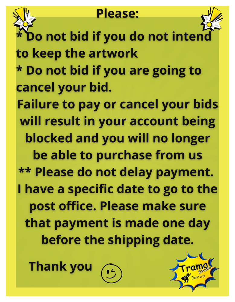 This is not a print or reproduction, this is an original art. You are buying art directly from the artists. All packages are shipped with two Styrofoam boards to protect the art and avoid damages. Each additional art will charge just $1 dollar combined with the cost of the shipping! Your feedback is very important for us. Don't forget to write us your feedback! In case you have any concerns about your order, please send us a message. *All payments must be due within 3 days after the auction ends! Please don't delay the payment of your orders, is very bad for our business. You are buying art directly from the artists. Thank you so much for your support!