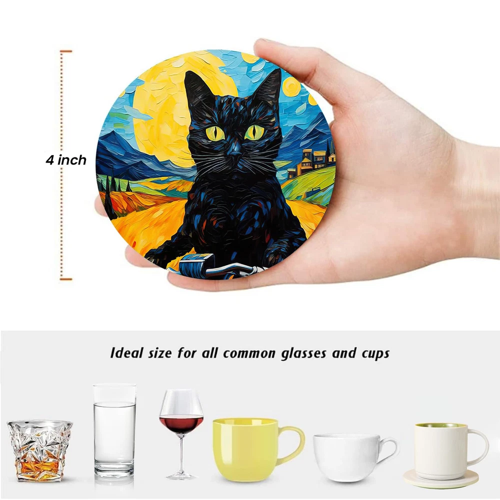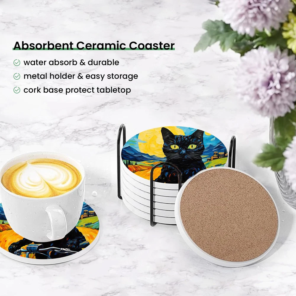 【Suitable Size】6pcs round 4 inch diameter ceramic coasters match all cups, making them fit with coffee cups,mugs,tumblers,wine glasses,kids' drinks and sports bottles. 【Absorbent Ceramic Drink Coasters】Drink coaster is made of high-quality liquid-absorbing porcelain stone, which will absorb water or drink stains a few seconds and keep table dry and clean. 【Non-slip Cork Bottom】A soft cork backing attached to each coaster can effectively prevent the surfaces of your furniture from being scratched,and protect your deskstop(countertops)from heat. 【4.5 inch Metal Holder & Easy Storage】Black metal holder will storage these ingenious coasters and save the space; also save time to constantly tidy up coasters; neatly stack your coasters in this sleek coaster holder when not in use. 【Modern Exquisite Decoration】Our coasters set with Classical round shaped, perfect for all kinds occasions like coffee bar, living room,office, farmhouse,kitchen, restaurant,bars,apartment decor. Great as housewarming gifts, table decor,various holiday parties,birthday, wedding and lake house decor.