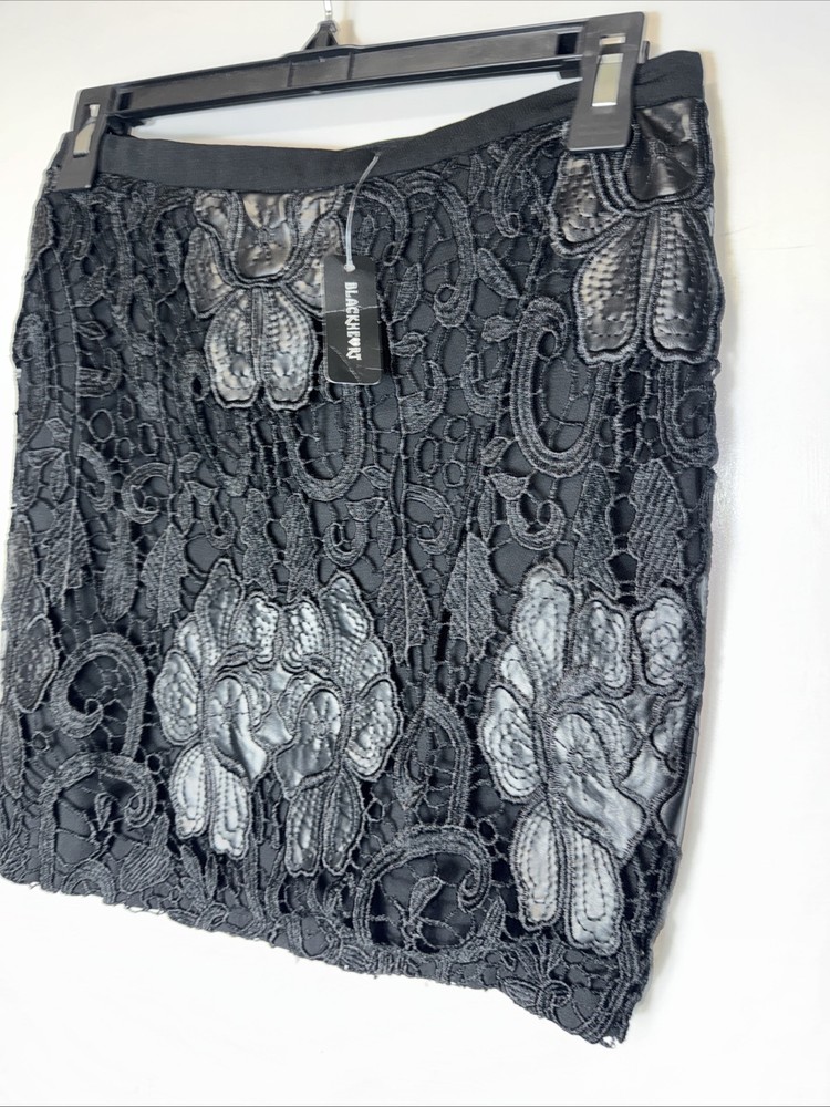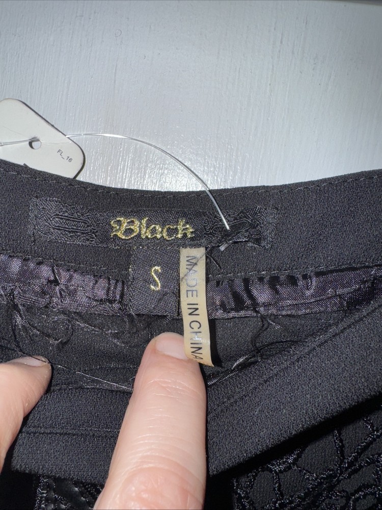 This is a Black Crochet Mini Skirt in size Small, featuring a classic, glam, formal, goth, punk, and fairy style. The skirt has a pull-on closure, is made of lace fabric with crochet and layered accents, and is lined and lightweight. It is designed with a floral pattern and is suitable for occasions like travel, parties, casual wear, workwear, or business attire during the summer or spring seasons.