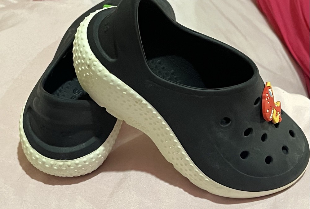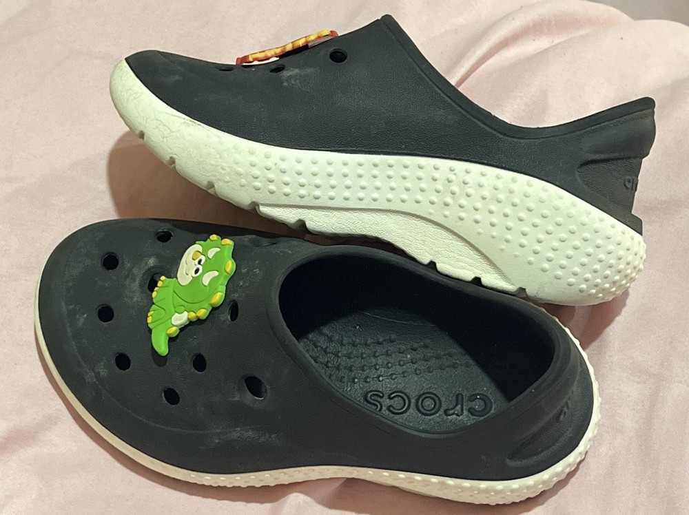 The Black Crocs Sneakers for toddler Size 9C are comfortable and stylish with Dinosaur Croc Charms. These low-top sneakers feature a slip-on closure, solid black color, round toe, and flat heel, making them perfect for casual occasions. The moderate cushioning level and rubber outsole provide comfort and support for walking activities in the summer, fall, and spring seasons. The synthetic lining and rubber upper material ensure durability and easy maintenance, while the rubber insole offers additional comfort. The iconic Crocs brand and unique charms add a fun and playful touch to these trendy toddler sneakers.