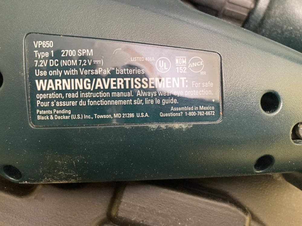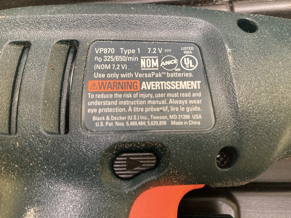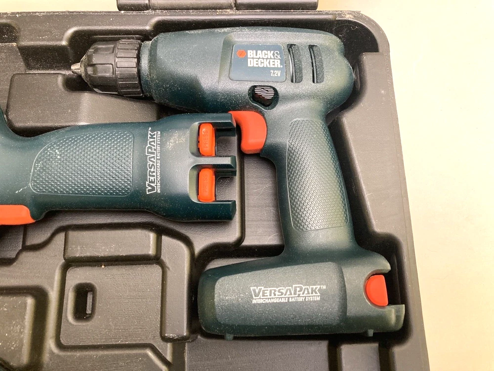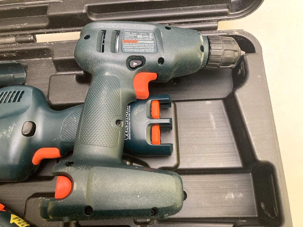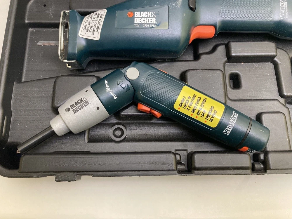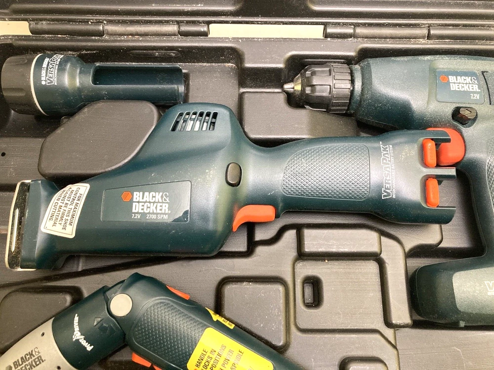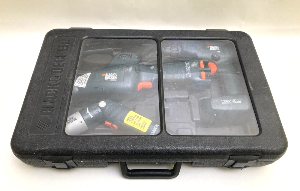 Black & Decker VersaPak 4 Piece Combo Tool Set With Case ( No Batteries/Charger) Excellent used condition! Near mint. Tools are very gently used. Includes: VP650 Jigsaw, VP 870 Power Drill, Pivot Driver, Flashlight and carrying case. Ships within 1 business day!