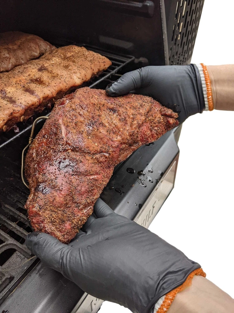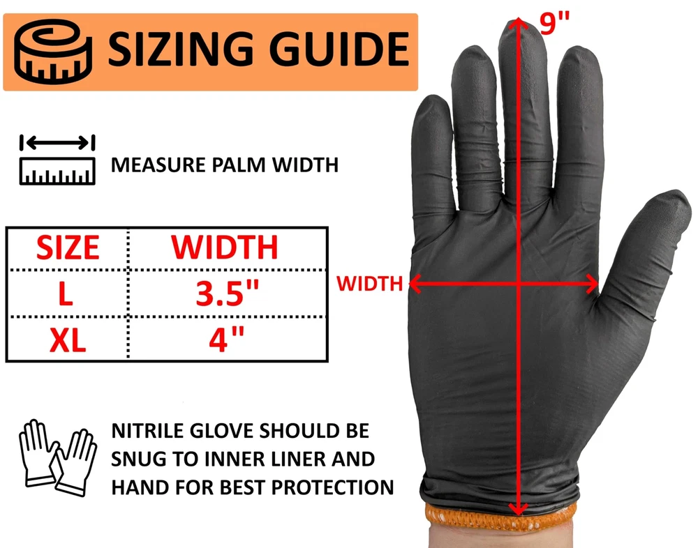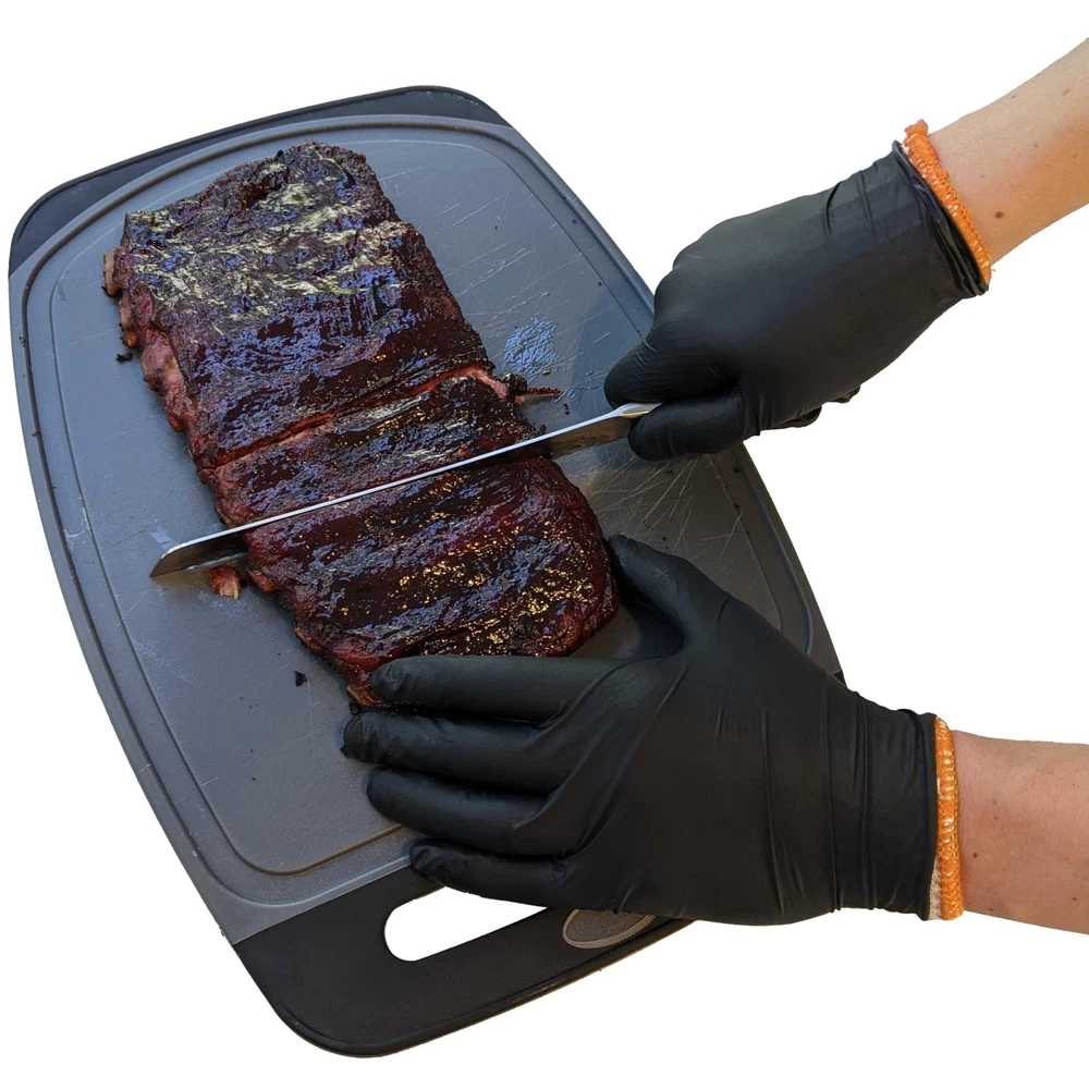 Kit includes 50 outer nitrile black disposable gloves with textured grip plus 2 machine washable and reusable inner cotton glove liners. Great smoker, grill, bbq accessories. Texture provides additional grip on grill tools, cutlery and meats with more surface area than standard black BBQ gloves by channeling away liquid from sauces, oils, rendered fat and more. Heavy duty, industrial 6 mil thickness nitrile black cooking gloves grill accessories provide better puncture and tear resistance and are an excellent barrier against meat, sauces, oils and grease Cotton glove liners under the BBQ disposable gloves are the perfect for BBQ by providing heat resistance handling food over the grates and the convenience of a disposable outer grilling meat gloves Large size grill gloves are free, latex free and food safe black nitrile heavy duty disposable bbq gloves provide extra comfort during heavy duty and extended use