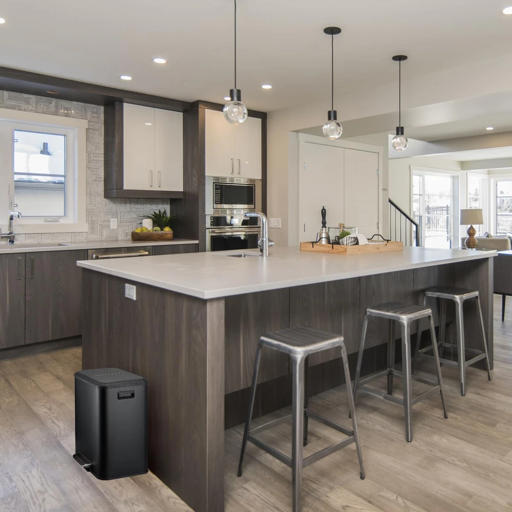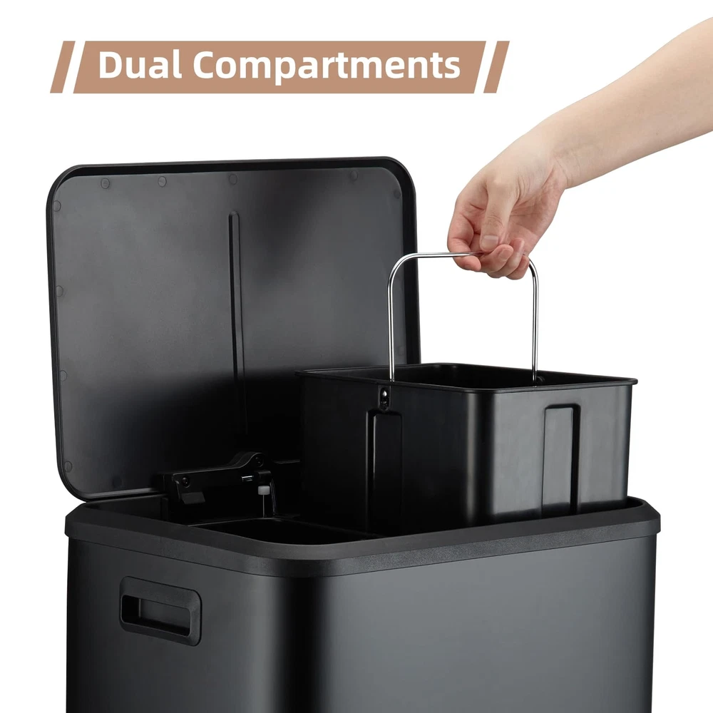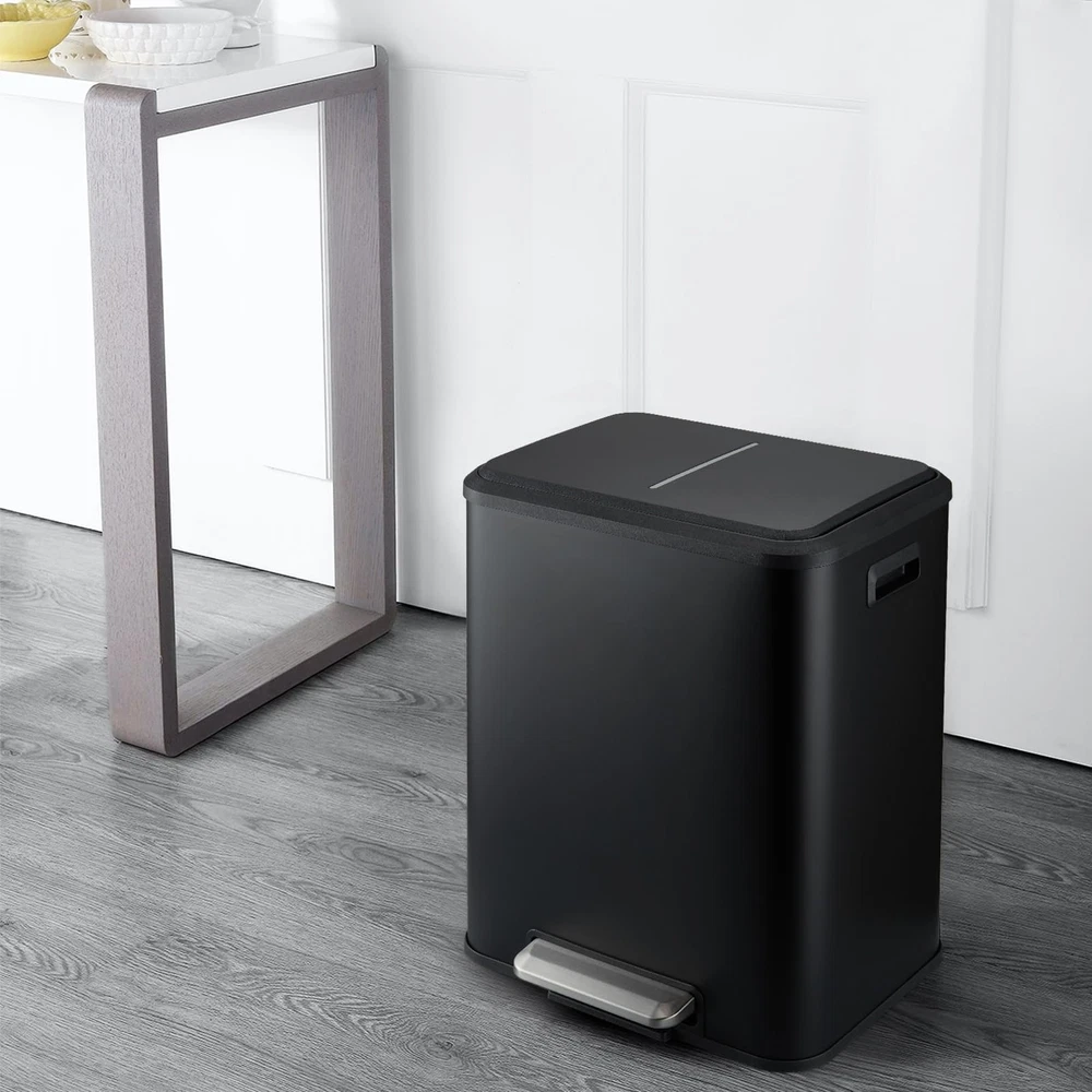 Black Dual Trash Can, Dual Compartment Step Trash Can, Double Bin Trash Can Combo for Kitchen, Kitchen Waste and Recycling with Removable Iner Buckets, 8 Gallons/30L This trashrecycle bin combo made of strong metal, which is durable and strong in structure. Our recycling bin with 2 movable inner bucket. Sealed lids fit tightly to block unpleasant odors, keeps your home smelling fresh and clean. This trash bin's step design provides hands-free operation. Simply step on the pedal to open the lid to dispose of trash or store recyclables. The 8 Gallon capacity of dual garbage can is perfect for any household which is enough to meet your needs of daily kitchen waste processing. Elegant and modern looking for any kitchen decor. This step trash can will be an eye-catcher in your kitchen.
