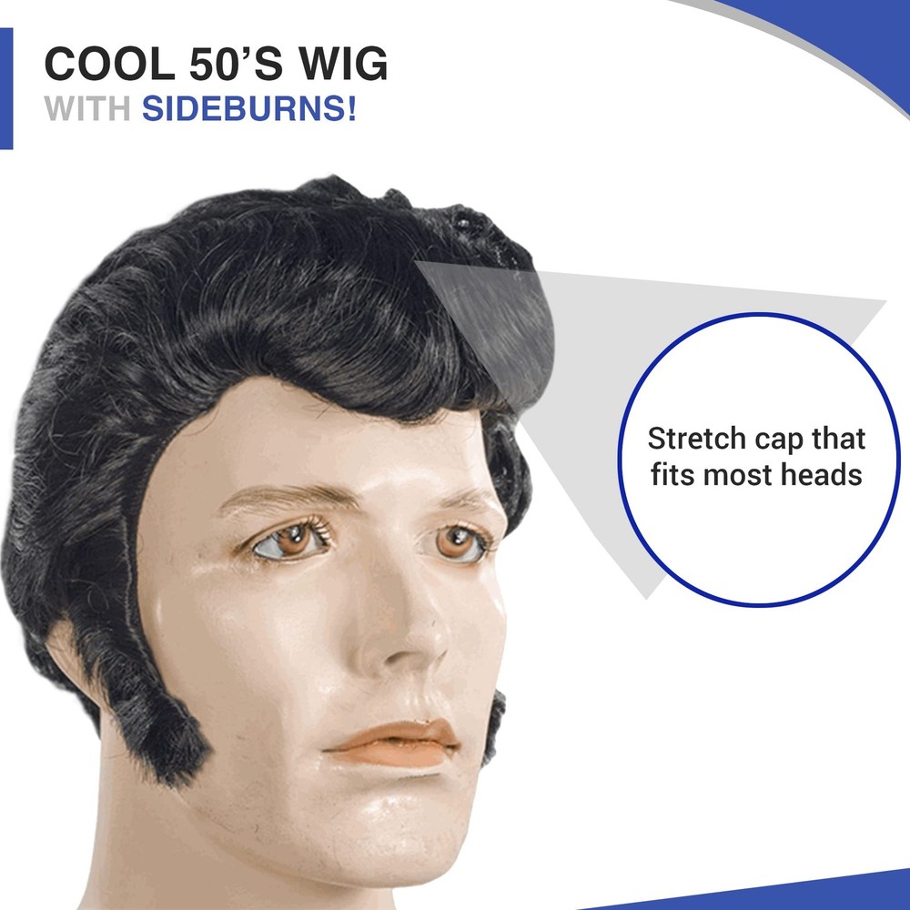 Great Elvis style costume wig for Halloween or having an Elvis celebration Stylish black Elvis wig with Sideburns Attached Long Sideburns Great for Adults Stretch cap that fits most heads For men or boys 12+