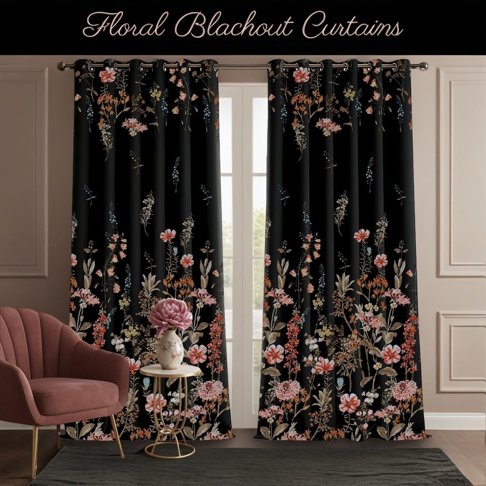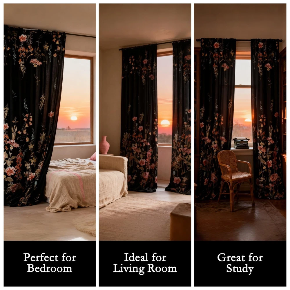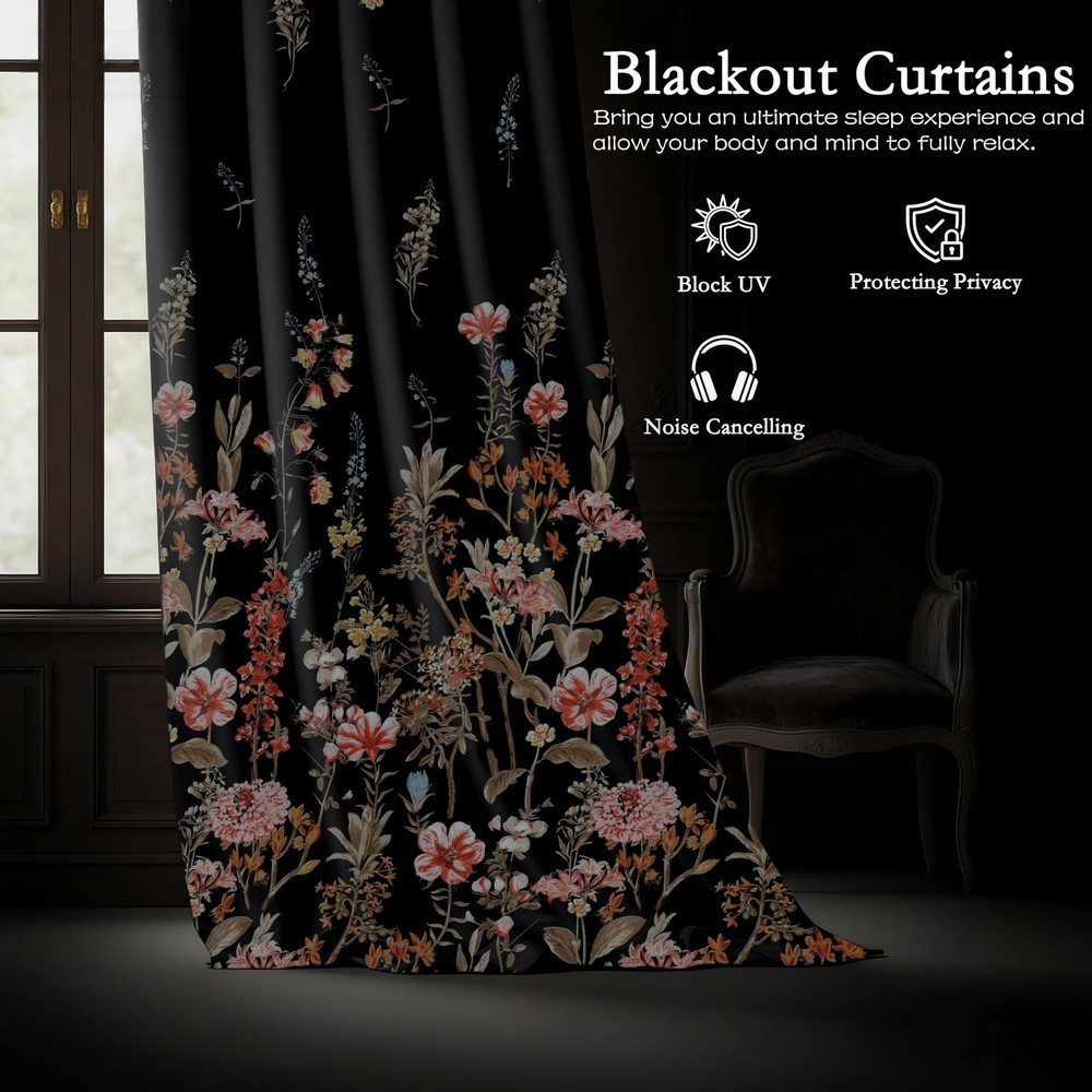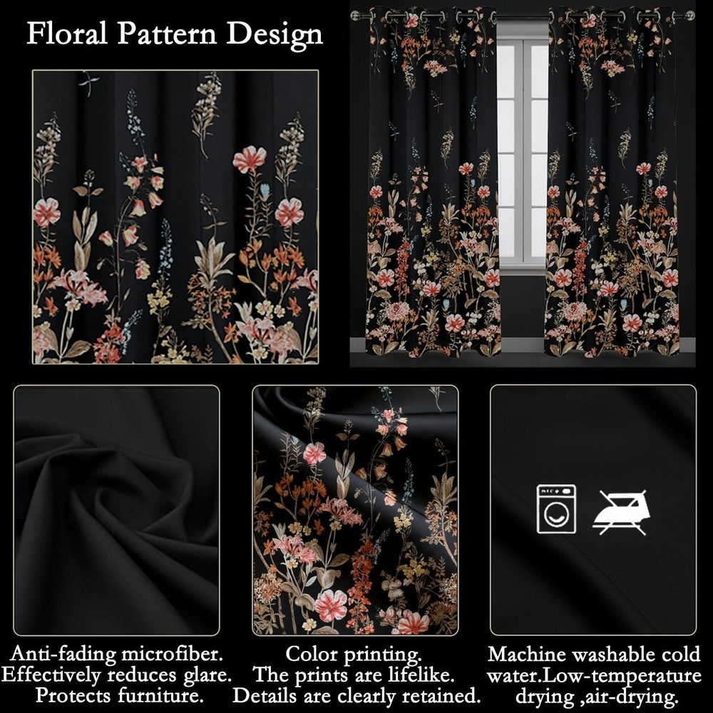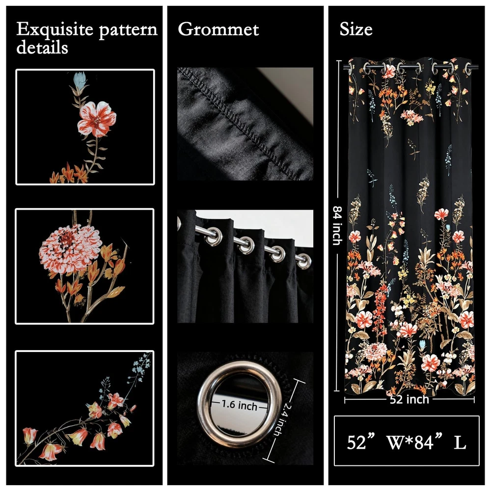 Black Floral Blackout Window Curtains 84 inch Length 2 Panels Set,Full Light Blocking Drapes,Room Darkening Curtains with Grommet Top,Thermal Insulated,Curtains for Living room,Bedroom. 1.【PACKAGE INCLUDES】Our black floral window curtains drapes 52*84 inch length 2 panels set.Used home decor living room. 2.【BLACKOUT & UV PROTECTION】Our thermal curtains by adopting the dual anti-glare technology,it can block 70%-90% of sunlight and ultraviolet rays,creating a perfect dark room environment. 3.【DESIGN & INSTALLATION】Our light blocking curtains easy-glide grommet top,includes 6-8 rustproof metal grommets(1.6” inner diameter)for smooth sliding on standard rods. 4.【MACHINE WASHABLE】Our thermal blackout curtains machine wash in cold water,tumble dry low,and iron on gentle settings.-resistant for lasting elegance. 5.【MULTI-ROOM COMPATIBILITY】Our thermal curtains for summer heat.Perfect for bedrooms,nurseries,living rooms,or patio doors.Pair with sheer curtains for layered decor.