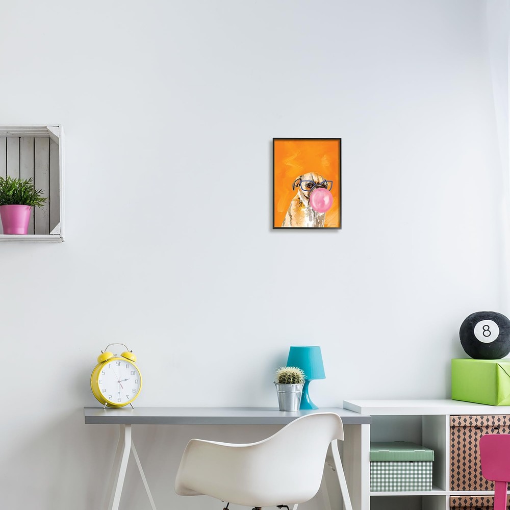 Framed Giclee Sizes Include Standard: 11 x 1.5 x 14 Large: 16 x 1.5 x 20 Oversized: 24 x 1.5 x 30 Wall Art is Ready to Hang with Hardware Free Hanging. No installation required. For Easy Set Up Lean or Layer Artwork on Shelf or Against Wall. Our giclée prints are carefully mounted on a durable MDF backing, and then perfectly finished in a 1.5 inch thick woodgrain frame. Mounted frame colors include black, gray farmhouse and white. Made In USA. Artwork Relates To: Animal, Canine, Mammal, Pet, Painting, Dog, Glasses, Bubblegum Design by Rachel Nieman