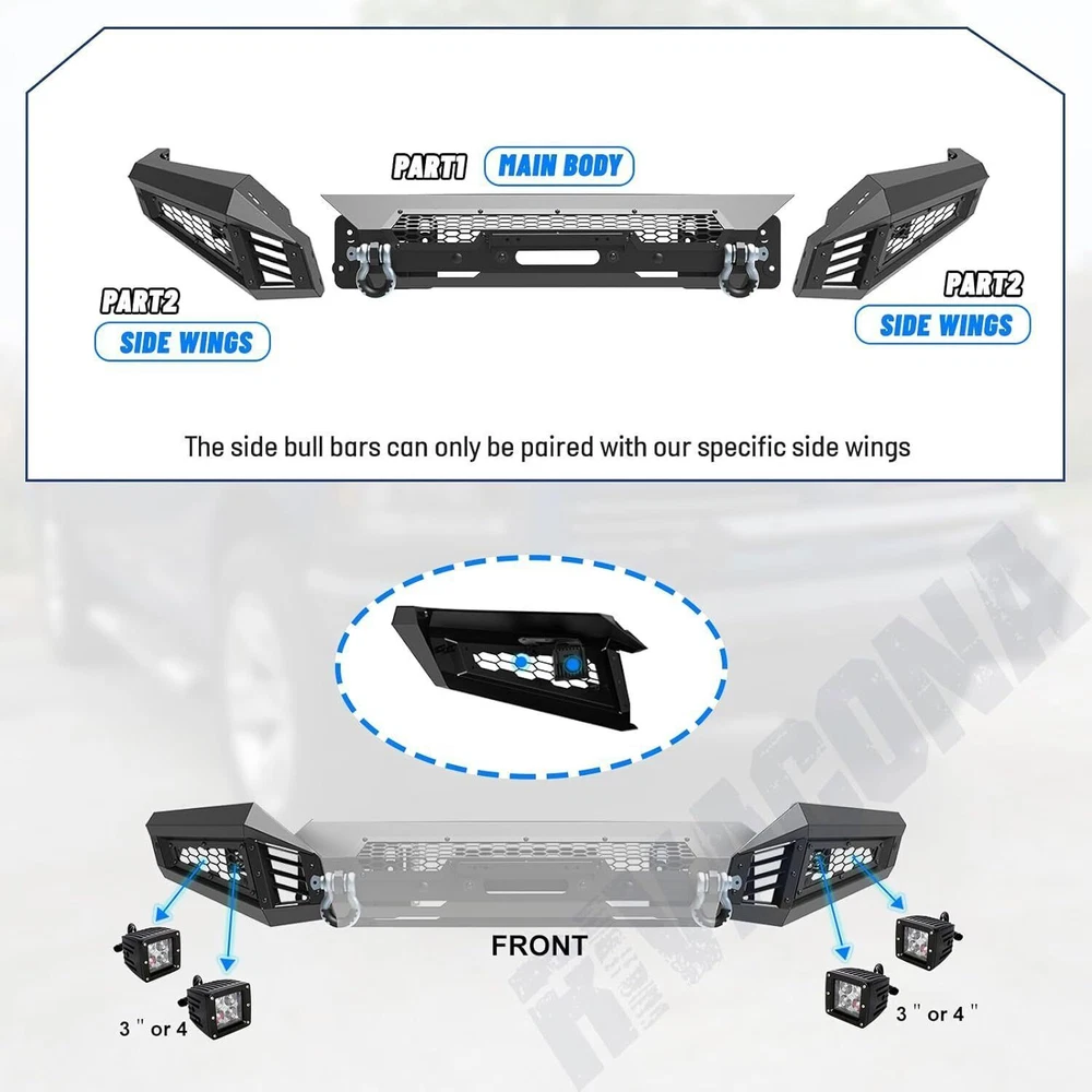 Head Lights Tail Lights Fog Lights Turn Signal Bumper Fender Flare Inner Fender Hubcaps Refrigerator Other Items for sale Head Lights Tail Lights Fog Lights Turn Signal Bumper Fender Flare Inner Fender Liners Portable Refrigerator May you Like LED Tail Lights Brake Rear Lamps Pair for 2016-2021 Toyota Tacoma - Clear Lens 159.99 USD LED Tail Lights Rear Lamps For 2016-2021 Toyota Tacoma Black Smoke Lens Pair L+R 196.02 USD LED DRL Tail Lights for 2016-2023 Toyota Tacoma Turn Signal Black Clear Pair 196.02 USD LED Tail Lights Rear Lamps for 2016-2021 Toyota Tacoma Chrome Red Lens Pair 196.02 USD Black Front Bumper For 2018-2020 Ford F150 Heavy Steel w/LED Pod Lights Winch Plate : https://www.ebay.com/itm/405192049582 Specifications: Material :Q235A Type: Heavy Duty Bumper Placement on Vehicle: Front Attachment Type: Bolt-on Direct replacement Surface Finish: Black Anti Rust Powder Coated Steel Premium quality aftermarket product Free 60 days return 1 years warranty Size: Mid-Width Front Bumper: Product Dimensions: 44.5 x 10.5 x 9.1 inch Package Dimensions: 48 x 13.2 x 9.4 inch Product Weight: 57 lbs Side Wing: Product Dimensions: 22.1 x 24 x 11.3 inch Package Dimensions: 34.2 x 21.1 x 10.2 inch Product Weight: 39.5 lbs Features: Mid-Width Front Bumper: Decorative Bezel--- Allows DIY colour spraying Flip-up Licence Plate Mounting Bracket--- Flip-up Licence Plate Mounting Bracket is include Shackle Mounting Brackets & Shackles--- Shackles are included Winch Cable Guide Mouting Hole--- Winch Rope Cable Lead Guide is not include Light Bar Mounting Bracket--- Can be installed light bar up to 30 inches, Light is not included Side Wings: Wing Guard Trim Blocks Shark Gill-like Decorative Panels:Allows DIY colour spraying Honeycomb decorative mesh panels:Allows DIY colour spraying Pod Light Mounting Bracket:Accept 2 3" or 4" Pods Light on Each Side(include 2 x 4" Pods Lights) Fitment: For 2018-2020 Ford F-150(Exclude Raptor) Package Includes: 1 × Mid-Width Front Bumper (w/2 x D Shackles) 2 × Full-Width Side Wings (w/2 x 4" Pods Lights) Mounting Hardware Kit Note:Two packages are shipped, and installation instructions are attached. If you have any questions, please contact us. We provide high-quality and fast pre-sales and after-sales services. Payment Shipping Return About us Contact us Payment Appreciated for the prompt payment, Contact us if bid by mistake, system open unpaid item automatically. Payment must be complete within 3 days from the date you purchase or after the end of auction. Items unpaid within 3 days of the auction end will be forfeited. We reserve the right of cancel the order and re-selling the items. Shipping All shipment will ship by UPS or USPS . All items will be ship within 1 working days , and we will ship out all orders as soon as possible after payment verified, please allow up to 1-4 business days for delivery. CANADA & International customers please note: your government might charge a duty tax (brokerage fees). We do not responsible for any custom duty or import tax. Why Choose the US Stock? 1. Us Local Shipping, No Extra Customs Cost to the US. 2. Fast Delivery: 1-4 Working days Delivery. 3. Best After-Sales Service!!! Return The buyer is responsible for all return shipping including a result of customer error or defective item. 1) If you received an incorrect, damaged, defective, or item not as described, contact us for full refund or replacement on our cost. 2) If you want to return the item, please contact us within 60 days after package received. Return products must also be in its original condition: including box, packaging and all other accessories. About us We are the best auto parts, we have been pursuing excellence, continuous exploration as the slogan, let customer satisfaction is our purpose! We adhere to the United States local delivery, one year warranty! Welcome! Contact us How Should You Contact us? Please Read The Item Description And See if The item Fits Your Vehicle Exactly. If You Found Any questions, Feel Free to email us by "Ask a question" Our Office Hours Are Monday - Friday 8:00am - 5:00pm PST / 11:00am - 8:000pm ET, We Do Not Answer Any E-Mails On Weekend, And We Will Reply All E-Mails In The Order It Was Receive. All E-Mail Take Us Around 24 Hours To Respond To Any E-Mail. We Are Close During The Weekends And We Do Not Answer Any E-Mails During That Time.