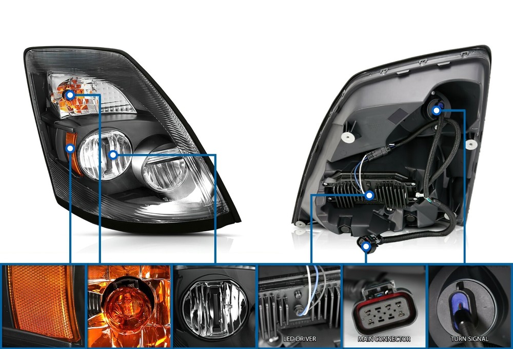 KOZAK Full LED Headlight Assembly BLACK Compatible With Volvo VNL Truck 630 670 730 780 2004-2017 (Replacement Truck Parts) PLUS Chrome Fender Guard Trim SET, Logo, Wipers, Frame License Plate, Vest This item is in BRAND NEW condition. ✅ Full LED Headlight Assembly with Black Housing ✅ Compatible with Volvo VNL VNX 2004-2017 ✅ Meet DOT Standarts ✅ INCLUDES: 1x Headlight Pair (Left Driver Side and Right Passenger Side) 1x Logo Emblem 1x Chrome Fender Guard Trim Set (Left Driver Side and Right Passenger Side) 2x 22" Windshield Wipers Frame License Plate Kozak Vest Contact us if you want to buy in bulk Contact us if you want to pick up the item or if you want to know more about delivery options in Washington