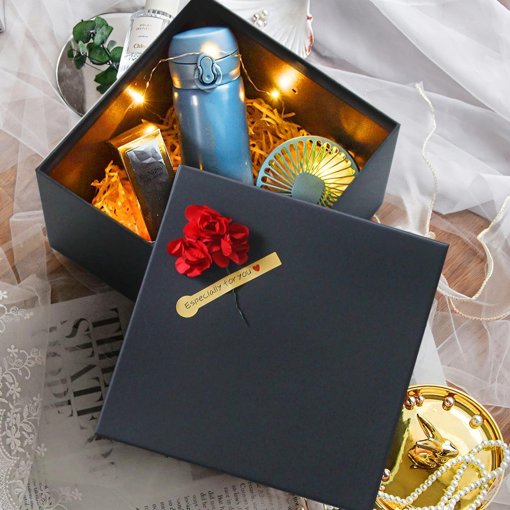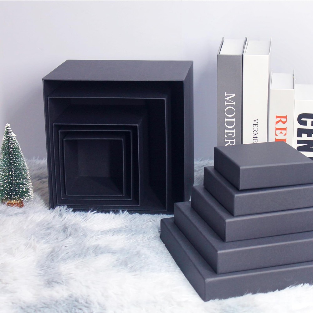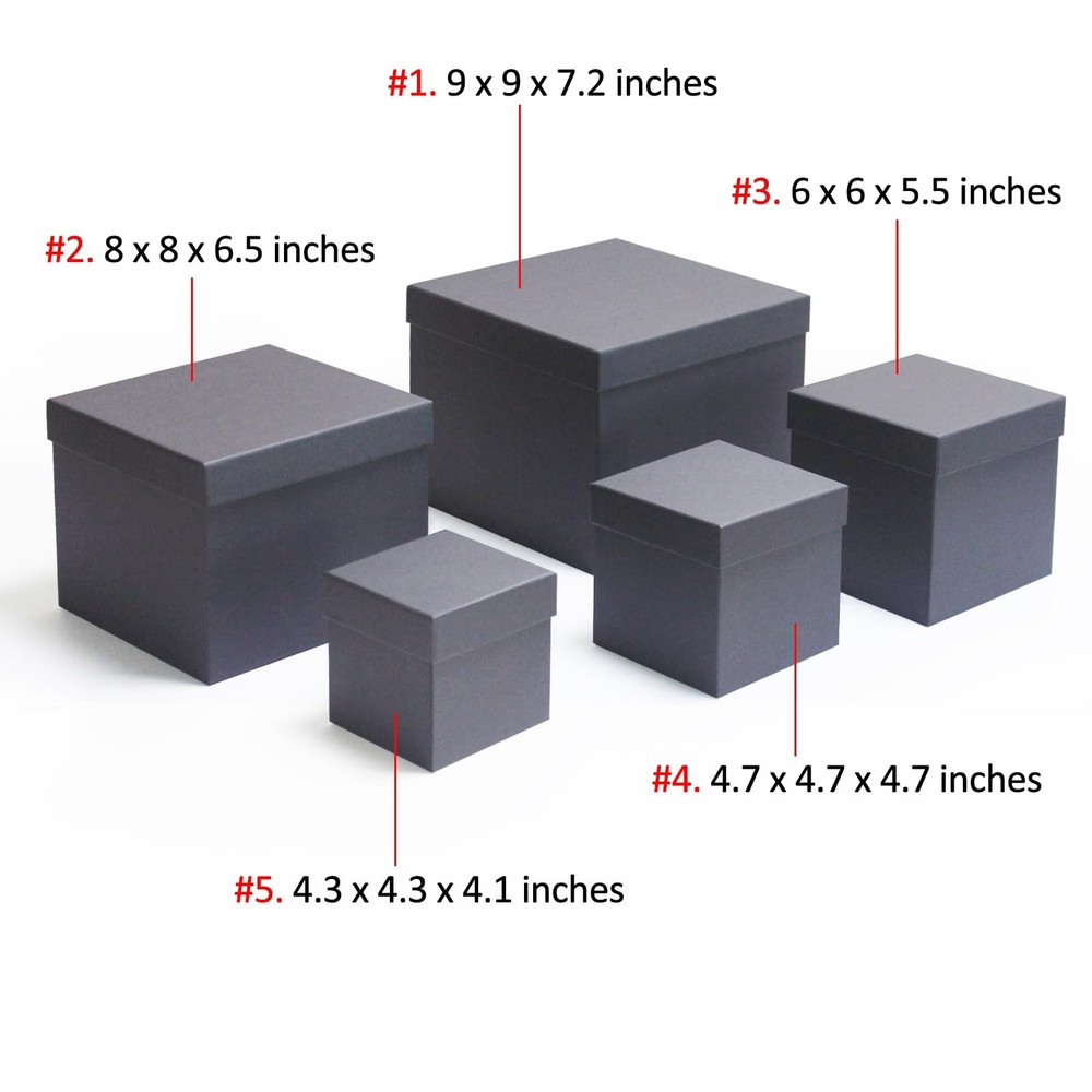 Enhance your gift-giving experience with our Premium Nested Black Gift Boxes with Lids. This set of 5 square gift wrap boxes offers a range of sizes to accommodate various presents, from small trinkets to larger items. The sizes included are: 9 x 9 x 7.2 inches, 8 x 8 x 6.5 inches, 6 x 6 x 5.5 inches, 4.7 x 4.7 x 4.7 inches, and 4.3 x 4.3 x 4.1 inches. Crafted from high-quality, sturdy cardboard, these black gift boxes ensure your gifts are securely and elegantly wrapped. Each set includes decorative paper flowers and stickers, allowing you to add a personal touch to your presents. Durable and reusable, these gift boxes are an eco-friendly choice for any occasion, whether it’s a birthday, wedding, anniversary, or holiday. Make your gifts stand out with our stylish and versatile gift boxes. Assorted Sizes Boxes for gifts: This set includes 5 nested gift boxes in sizes: 9x9x7.2, 8x8x6.5, 6x6x5.5, 4.7x4.7x4.7, and 4.3x4.3x4.1 inches; whether large or small present, these gift boxes with lids have you covered Elegant Presentation: These black gift boxes for presents are well made and beautiful; our square gift boxes come with decorative paper flowers and stickers, adding a personal touch to your gift presentation Sturdiness and Protection: Our square gift boxes for presents are made of durable cardboard; these gift wrap boxes are designed to be durable and reusable, making them a practical choice for gift wrapping Pre-Wrapped Gift Boxes with Lids for Presents: These pre-wrapped boxes are ready to use right out of the package, eliminating the need for assembly; each set includes decorative paper flowers and stickers, allowing you to customize your gift boxes for presents Perfect for All Occasions: These square gift boxes can be used for gift giving, giveaways, and packaging boxes for gifts, they are ideal for Birthday, Party, Wedding and holidays such as Halloween, Christmas, New Year, Valentine's Day, etc