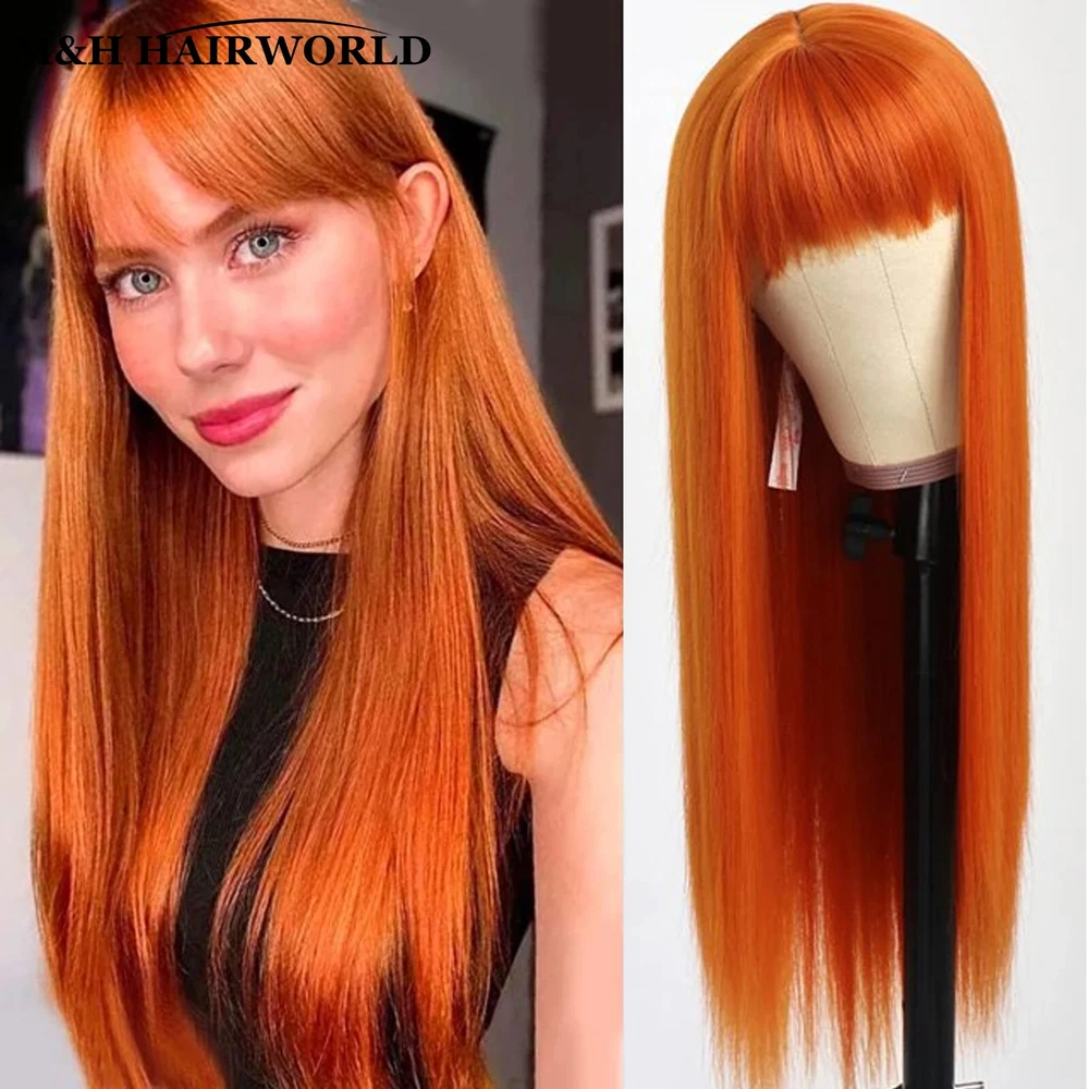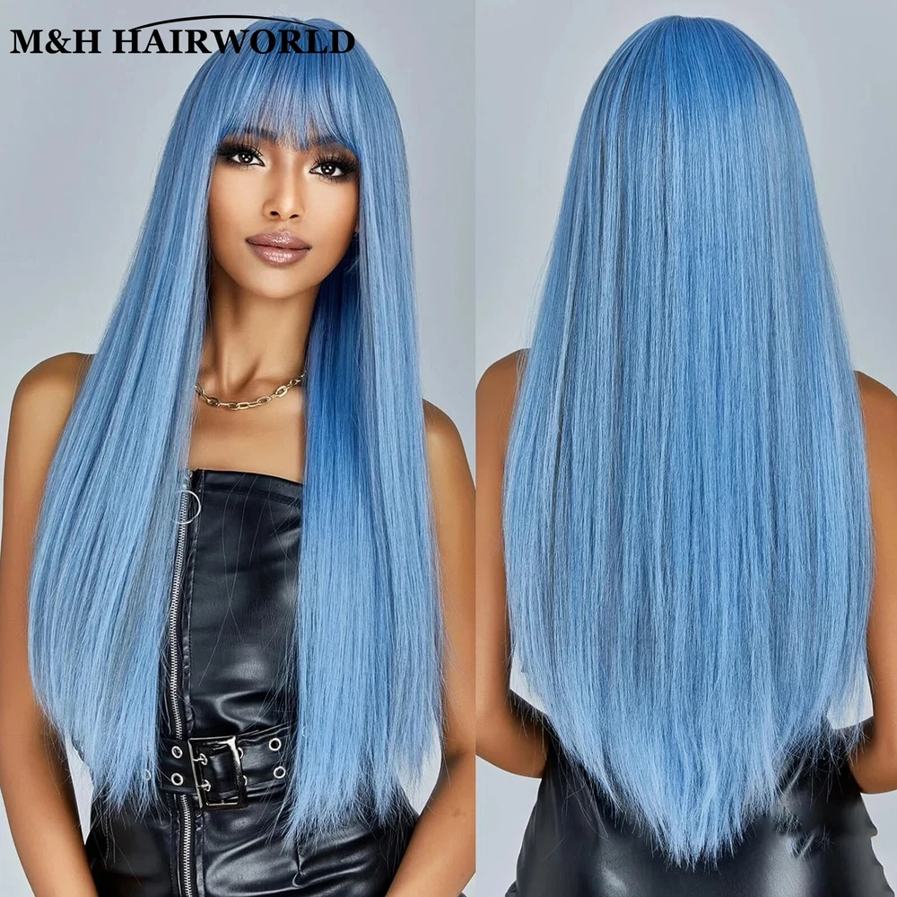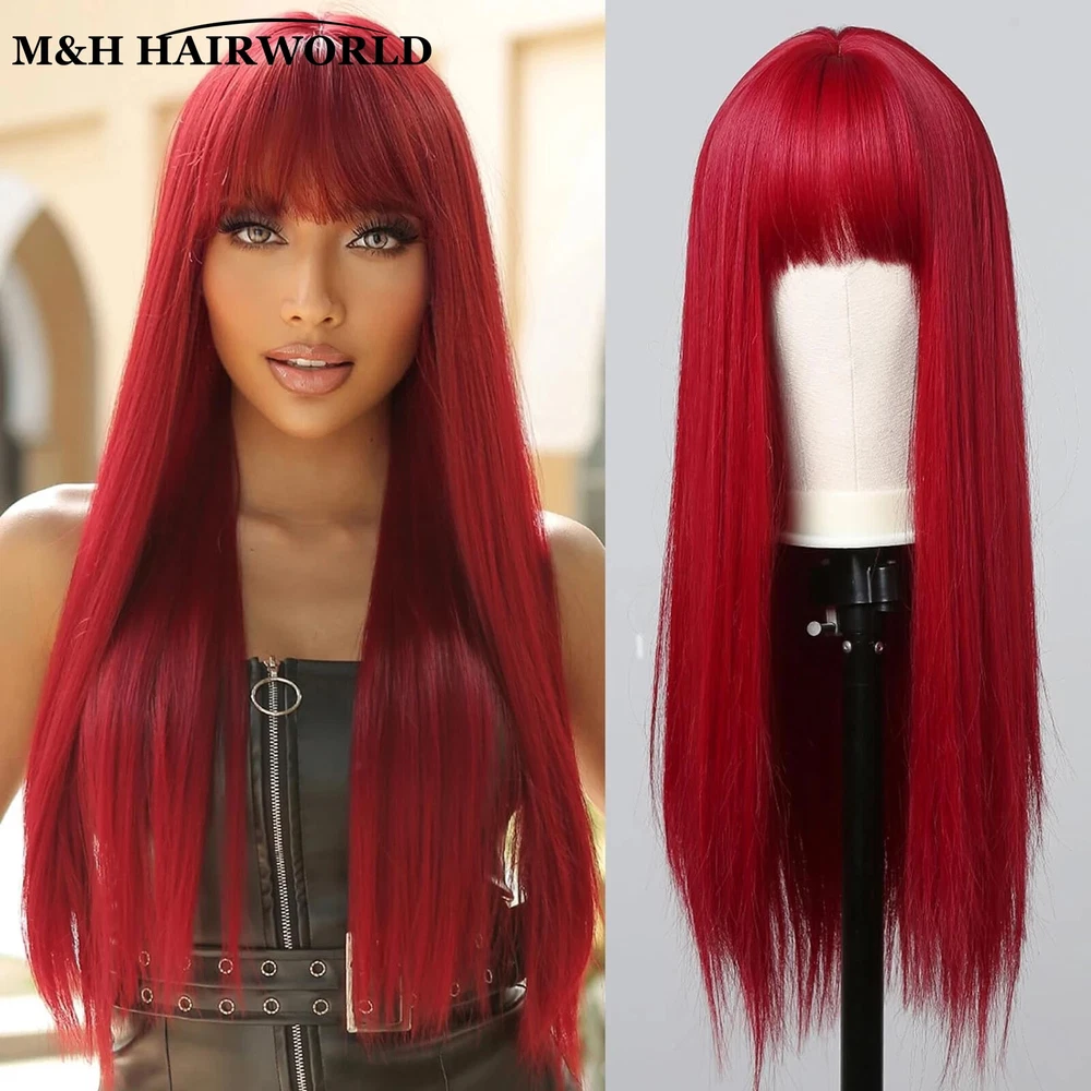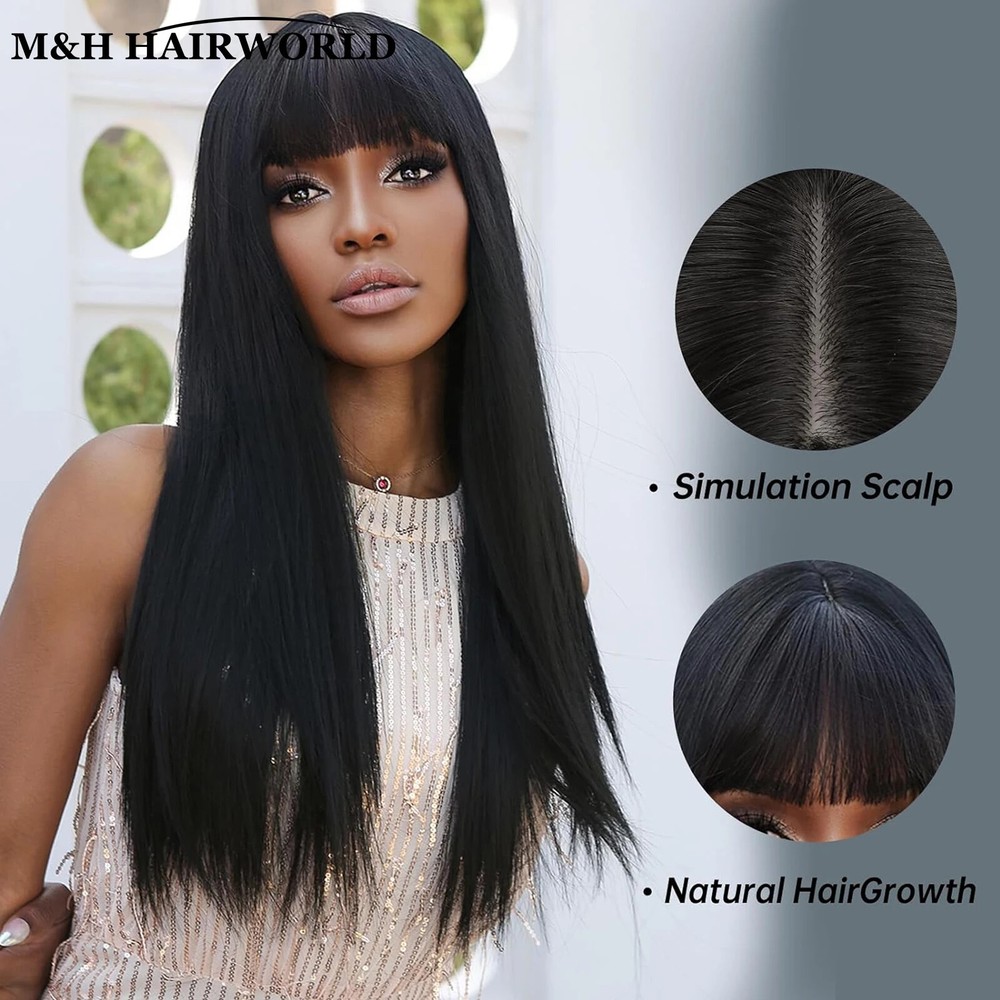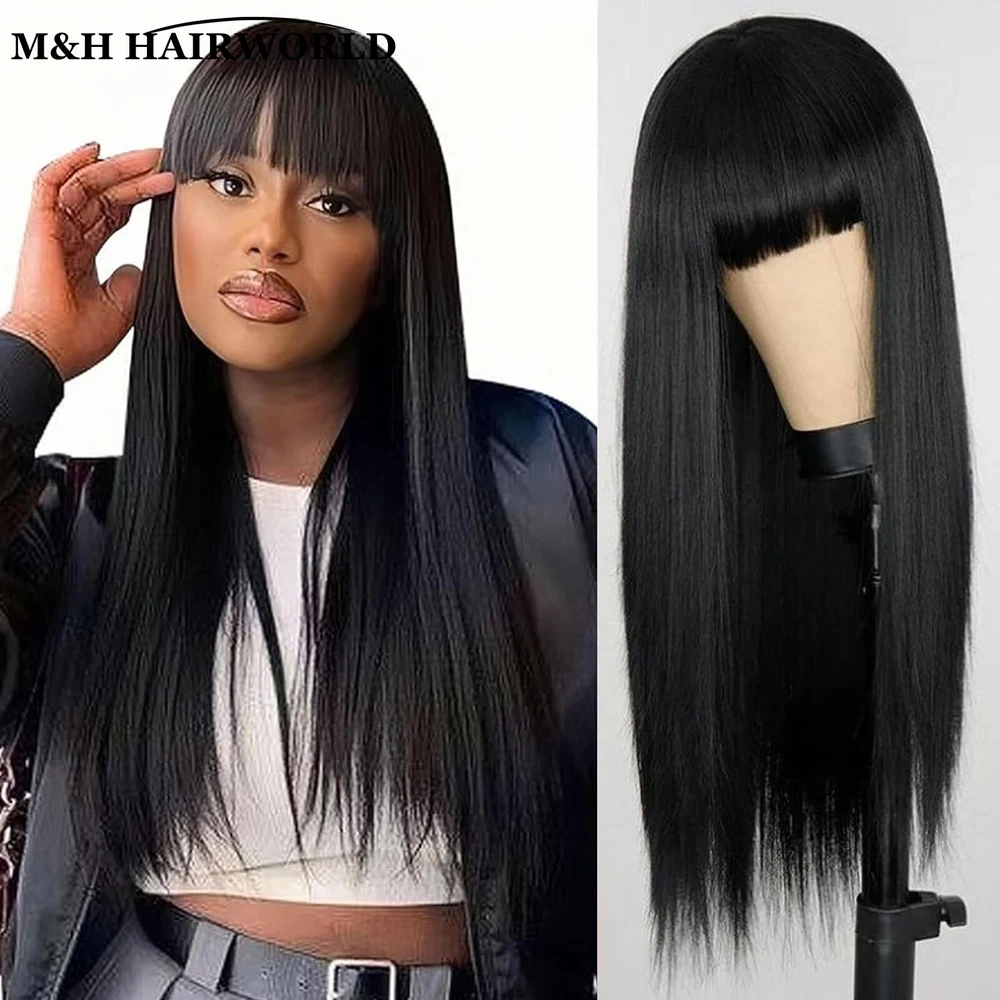 Black Colored Synthetic Hair Wigs For Women Long Silky Straight Hair Wig With Bangs Glueless Wigs For Daily Party Cosplay Wear