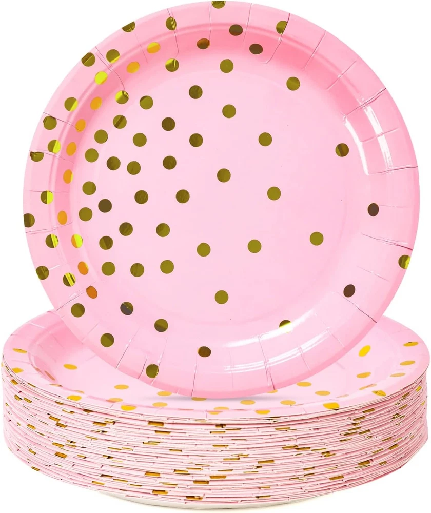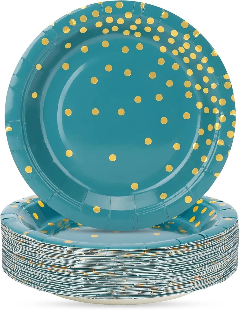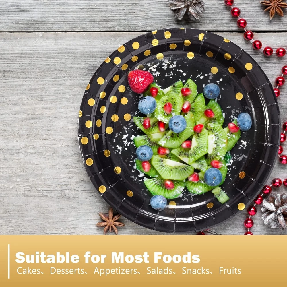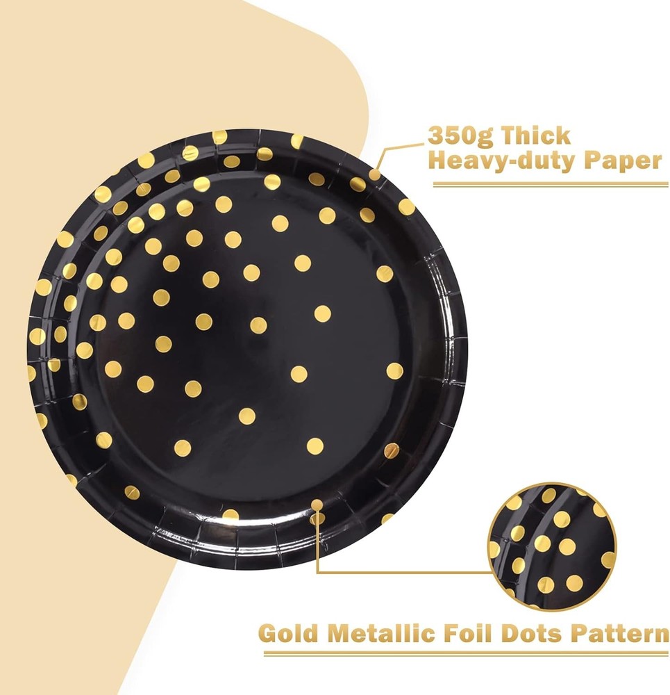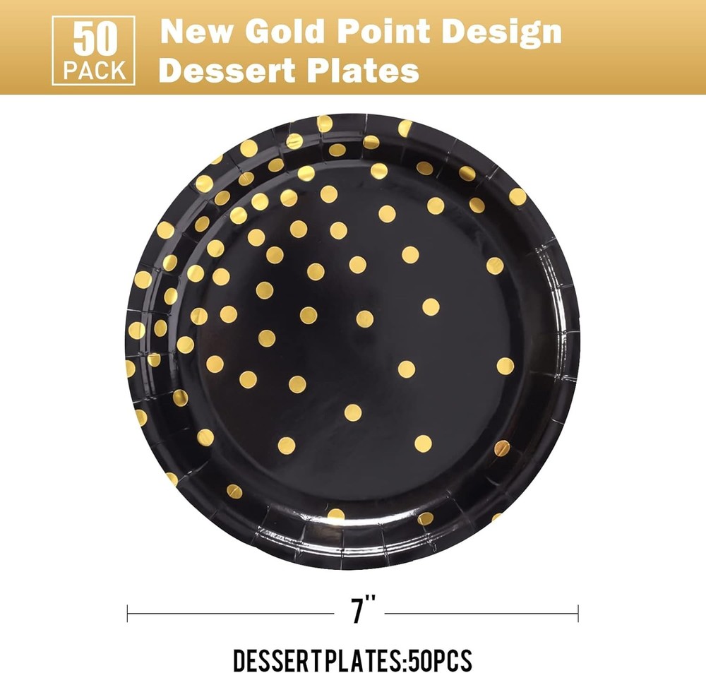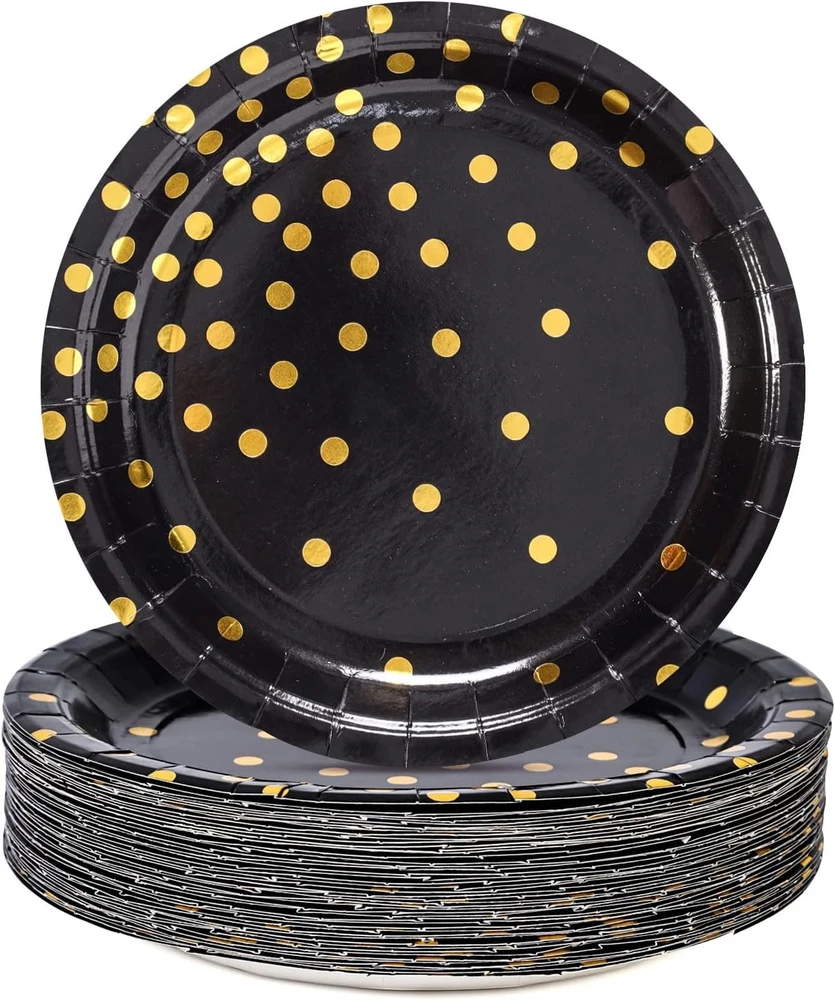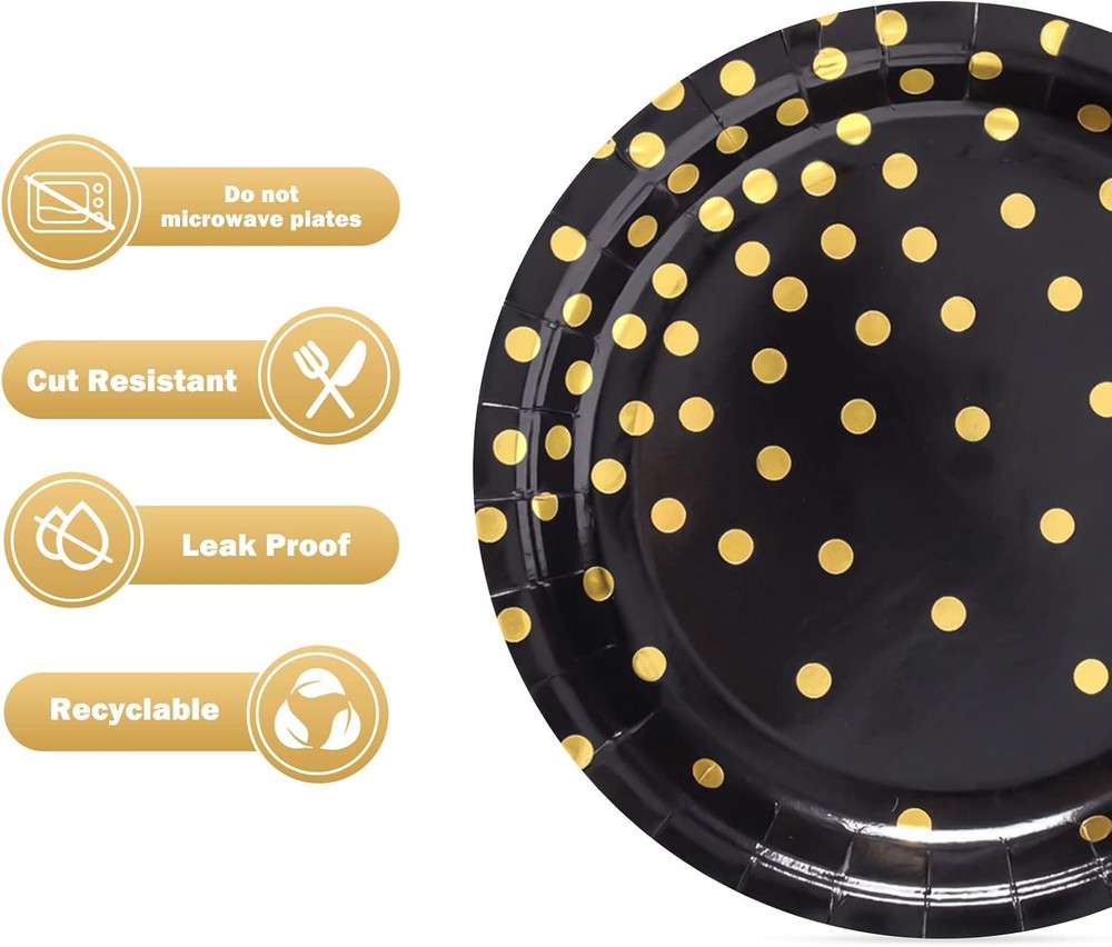 About this item 1.Package Includes: You will receive 50 disposable paper plates, this quantity is enough for a party or daily needs, great party supplies 2.Size Information: The dessert plate size is about 7 inches, this size is more suitable to accommodate salads, desserts, cakes, appetizers, etc 3.Gold Dot Design: Paper party plate white background with gold dot design, shining and charming, add elegance and fast atmosphere to your party 4.Material: The 7 inch paper dessert plate is made of 350gsm thickened paper, not easy to tear and permeate, biodegradable and safe to use on any occasion (Note: Not Microwaveable ) 5.Multiple Occasions: Black and gold party paper plates are great for birthdays, anniversaries, graduations, bachelorette parties, etc. and can be thrown away directly after use, so it's convenient and easy to use without worrying about environmental issues › Material: Paper Brand: Color: Black/Gold Special Feature: BPA Free Style: Modern