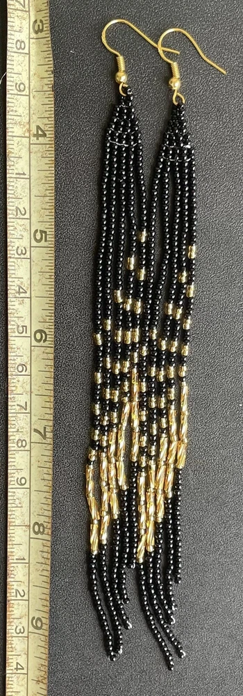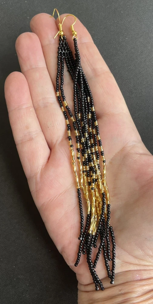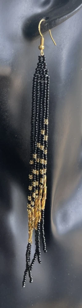 1 pair of black and gold long seed bead beaded earrings. You will receive earrings pictured. The earrings are handmade with seed beads. The earrings are approximately 6 1/2" long with the ear hooks included. The ear hooks are sterling silver, gold plated.They are for pierced ears. 0-ea-seed-103-1