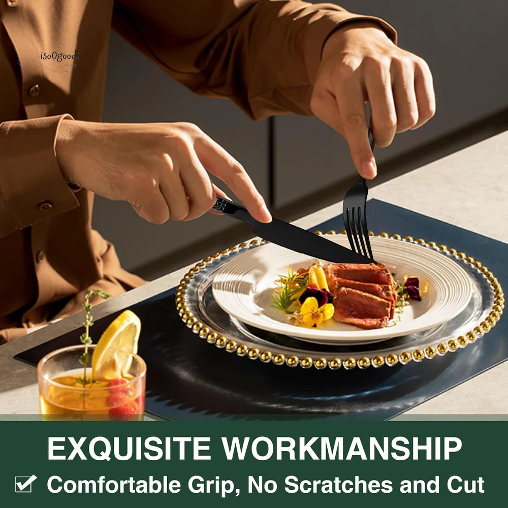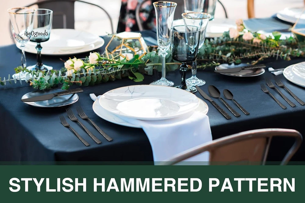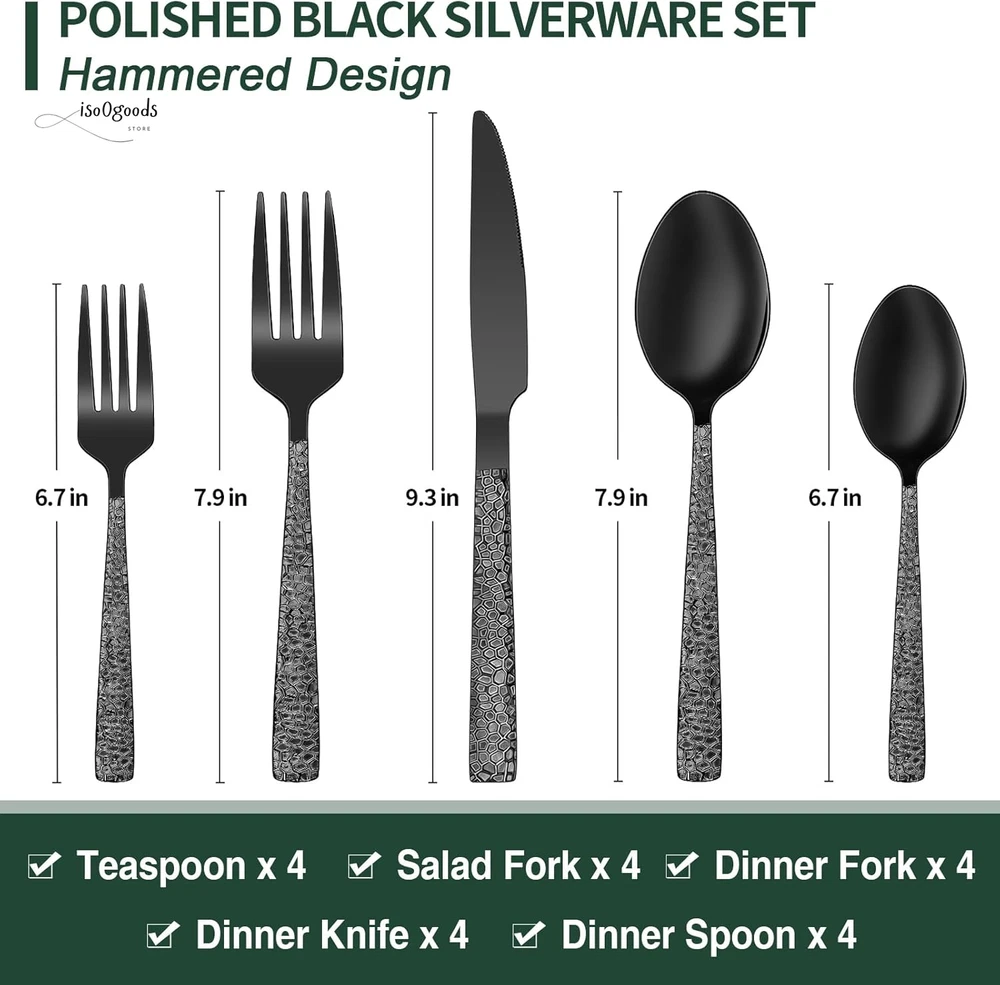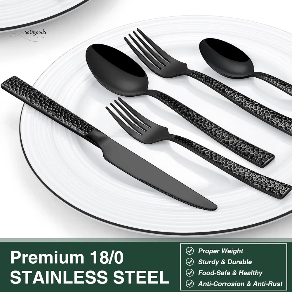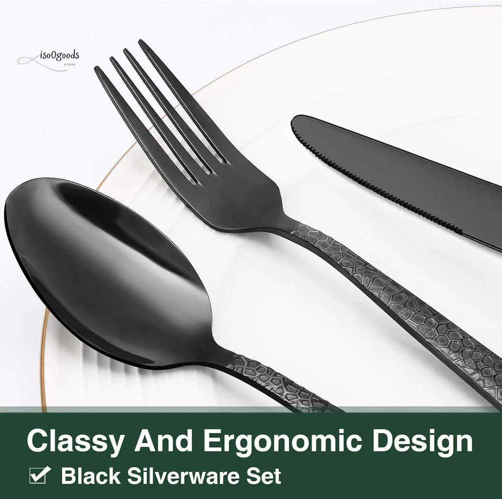 Premium 20-Piece Black Silverware Set for 4 - Elegant & Durable Complete Set for Home or Hospitality: This set includes 4 dinner forks, 4 salad forks, 4 dinner spoons, 4 dessert spoons, and 4 dinner knives, making it perfect for daily use at home and ideal for restaurants, pubs, cafes, and hotels. Enhance your dinner parties with this stylish cutlery set. Comfortable Design: Featuring a classic silhouette with clean lines and a polished black finish, this flatware set is designed to complement your existing tableware. The smooth edges and balanced weight ensure maximum comfort during use. Fashionable Appearance: The elegant style with a hammered design on the front of each handle makes every meal feel like a high-end banquet. Suitable for various tablecloths and settings, the design of the handle highlights different styles. Use & Maintenance: Hand washing is recommended to maintain the quality of the silverware. Avoid using wire brushes, hard sponges, or cleaning cloths that could damage the silver. High-Quality Stainless Steel: Made from premium food-grade stainless steel, this set offers long-term value and excellent properties. It is resistant to rust and corrosion, ensuring a sturdy and healthy dining experience without bending in daily use. Product Description EWFEN Unique Flatware Set with Stylish Hammered Design Luxury Black Silverware: The EWFEN 20-Piece Black Hammered Flatware Set is crafted from premium 18/0 stainless steel. It is durable, heat-resistant, and complements other tableware perfectly. Ideal for daily use or special occasions. Usage Instructions: Wash the silverware set with warm soapy water before the first use to remove any manufacturing residue. Clean and dry the silverware set after each use to ensure durability. 20-Piece Cutlery Set - Service for 4: 4 Black Dinner Knives 4 Black Dinner Forks 4 Black Dinner Spoons 4 Black Salad Forks 4 Black Tea Spoons Features: Proper gauge thickness and weight for comfort. Ergonomic handles for a natural, balanced feel. Sharp serrated knife blades for efficient cutting. Hammered handles for an elegant appearance. Modern design complements any decor. We are committed to providing unique, high-quality tableware sets to our customers. Enjoy an elegant dining experience with our luxurious flatware. Upgrade Your Dining Experience: Order the Premium 20-Piece Black Silverware Set today and enjoy a stylish, durable, and comfortable addition to your table. Click “Add to Cart” NOW to get your Premium 20-Piece Black Silverware Set!