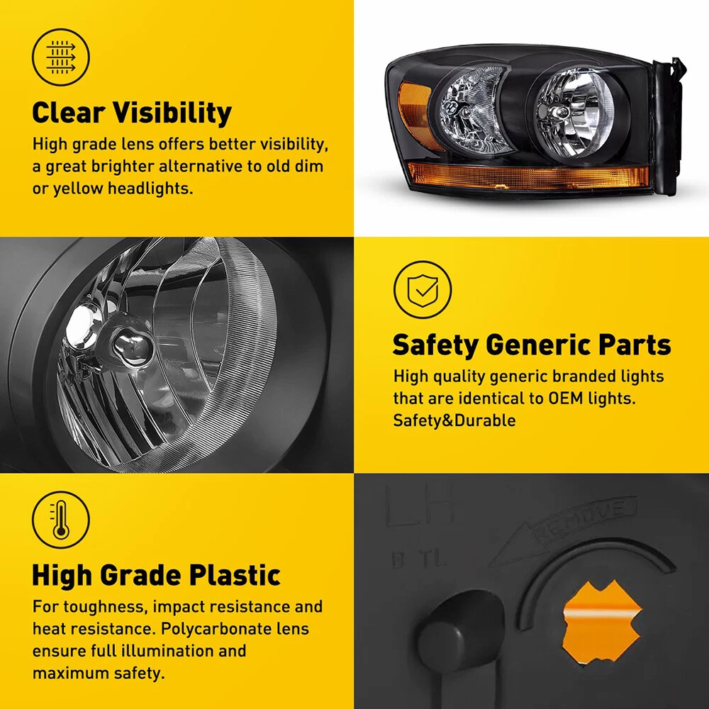 Black Housing Headlight Fit For 2006-2008 Dodge Ram 1500/2006-2009 Ram 2500 3500