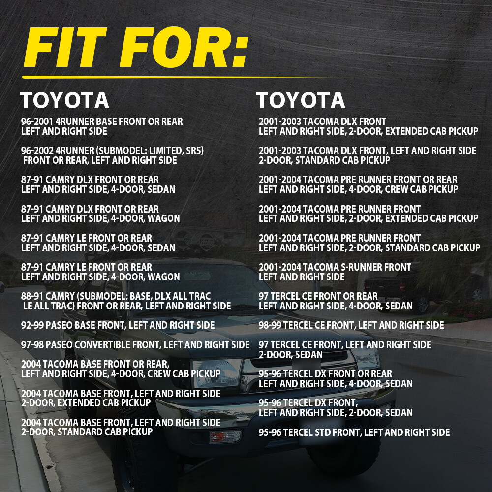 Fit for: Toyota 96-2001 4Runner Base Front or Rear, Left and Right Side 96-2002 4Runner (submodel: Limited, SR5) Front or Rear, Left and Right Side 87-91 Camry DLX Front or Rear, Left and Right Side, 4-Door, Sedan 87-91 Camry DLX Front or Rear, Left and Right Side, 4-Door, Wagon 87-91 Camry LE Front or Rear, Left and Right Side, 4-Door, Sedan 87-91 Camry LE Front or Rear, Left and Right Side, 4-Door, Wagon 88-91 Camry (submodel: Base, DLX All Trac, LE All Trac) Front or Rear, Left and Right Side 92-99 Paseo Base Front, Left and Right Side 97-98 Paseo Convertible Front, Left and Right Side Interior Right & Left Door Handles Black For 2001-2004 Toyota Tacoma 87-91 Camry Fit for: Toyota 96-2001 4Runner Base Front or Rear, Left and Right Side 96-2002 4Runner (submodel: Limited, SR5) Front or Rear, Left and Right Side 87-91 Camry DLX Front or Rear, Left and Right Side, 4-Door, Sedan 87-91 Camry DLX Front or Rear, Left and Right Side, 4-Door, Wagon 87-91 Camry LE Front or Rear, Left and Right Side, 4-Door, Sedan 87-91 Camry LE Front or Rear, Left and Right Side, 4-Door, Wagon 88-91 Camry (submodel: Base, DLX All Trac, LE All Trac) Front or Rear, Left and Right Side 92-99 Paseo Base Front, Left and Right Side 97-98 Paseo Convertible Front, Left and Right Side 2004 Tacoma Base Front or Rear, Left and Right Side, 4-Door, Crew Cab Pickup 2004 Tacoma Base Front, Left and Right Side, 2-Door, Extended Cab Pickup 2004 Tacoma Base Front, Left and Right Side, 2-Door, Standard Cab Pickup 2001-2003 Tacoma DLX Front, Left and Right Side, 2-Door, Extended Cab Pickup 2001-2003 Tacoma DLX Front, Left and Right Side, 2-Door, Standard Cab Pickup 2001-2004 Tacoma Pre Runner Front or Rear, Left and Right Side, 4-Door, Crew Cab Pickup 2001-2004 Tacoma Pre Runner Front, Left and Right Side, 2-Door, Extended Cab Pickup 2001-2004 Tacoma Pre Runner Front, Left and Right Side, 2-Door, Standard Cab Pickup 2001-2004 Tacoma S-Runner Front, Left and Right Side 97 Tercel CE Front or Rear, Left and Right Side, 4-Door, Sedan 98-99 Tercel CE Front, Left and Right Side 97 Tercel CE Front, Left and Right Side, 2-Door, Sedan 95-96 Tercel DX Front or Rear, Left and Right Side, 4-Door, Sedan 95-96 Tercel DX Front, Left and Right Side, 2-Door, Sedan 95-96 Tercel STD Front, Left and Right Side Specifications OE Number: 692060B010A 6920610070A 6920632020A 692050B010A 6920510070A 6920532020A Product Material: ABS Color: Black (as pictures show) Placement on Vehicle: Left and right side of inner door(Front/Rear) Features: *Perfect Fitment Comply with the industrial standards, use it with confidence. *Strict Quality Control All of our handles undergo strict quality control not just before shipping but throughout the production process. *Durable Material Mainly made of high-quality material to ensure the long service life and durability. *Simple Installation Easy installation with direct replacement, other modifications are not required. *Warm Notice Please double-check the part number and models in the description to guarantee it fits your vehicle before ordering. Packaging Include: Door handle*2 Item Specifics Brand AUXITO Bundle Listing Yes Color Black Features Without Door Lock Hole Fitment Type Direct Replacement Interchange Part Number 6920510070E, IDH010058, 6920610070E, IDH010057 Manufacturer Part Number MBS-NM-TACOMA-01-04M Manufacturer Warranty 1 Year Number of Pieces (2) Interior Door Handle OE Number 6920510070E, 6920610070E OE/OEM Part Number 6920510070E, 6920610070E Other Part Number 6920510070E, 6920610070E Part Link Number IDH010058, IDH010057 Part Name Interior Door Handle Partslink Number IDH010058, IDH010057 Placement on Vehicle Front,Rear,Left,Right Quantity Set of 2 Superseded Part Number 6920510070E IDH010058 6920610070E IDH010057 2004 2003 2002 2001 2000 1999 1998 1997 1996 1995 1994 1993 1992 1991 1990 1989 1988 1987 Toyota Tacoma 4Runner Camry Tercel Paseo 2-Door, Standard Cab Pickup, 4-Door, Crew Extended Sedan, Wagon Front, Driver Left and Passenger Right Side Front or Rear, Standard Cab Pickup Crew Cab Pickup Extended Cab Pickup Sport Utility Sedan Coupe Convertible 6Cyl 4Cyl 3.4L 2.4L 2.7L 1.5L 2.0L 2.5L Base Pre Runner S-Runner DLX SR5 Limited CE Convertible DX STD LE DLX All Trac LE All Trac Interior Door Handles Pair Set Type Interior Door Handle UPC Does Not Apply Material ABS Universal Fitment No FAQ ♥ If you have a decoding problem or any other problems, please contact us first, we will help you with it. We will reply you within 24 hours in working days. I'm a new seller, thanks a lot for your trust and convince! I will serve you with all my heart. ♥ Q1: Will this bulb fit my vehicle? A: We can match almost any vehicle to one of our bulb sizes. eBay only lets us include some vehicle fitments per listing, but if your vehicle does not show up on the compatibility table at the top of our listings, welcome you to contact us for free consulation before purchasing a product. Q2: My item has not arrived, what's taking so long? A: Sometimes items take longer than expected, especially if it’s going far or to rural area. Check with your post office to see if your item has been held up. Sometimes Royal Mail will not update a tracking number until it has arrived at its destination. If your item still don't arrive after a few days, let us know so we can double check for you and help solve it asap. Q3: My bulbs won't fit, help! A: Special bulb holder may be required. See if you can take the holder from the stock bulb. If not, let us know. The bulb size may be wrong, double check the item you received with the item you ordered. Do you have an aftermarket lighting housing? These may not be perfectly fitted for aftermarket bulbs and will require some manual modifications. Q4: Neither side lighting up? Both sides flicker, hyper flash, or work inconsistantly. A:Check the light fuses, and then check the ballast plugs to insure correct installation. If this doesn't work, there may be a voltage problem with the vehicle.