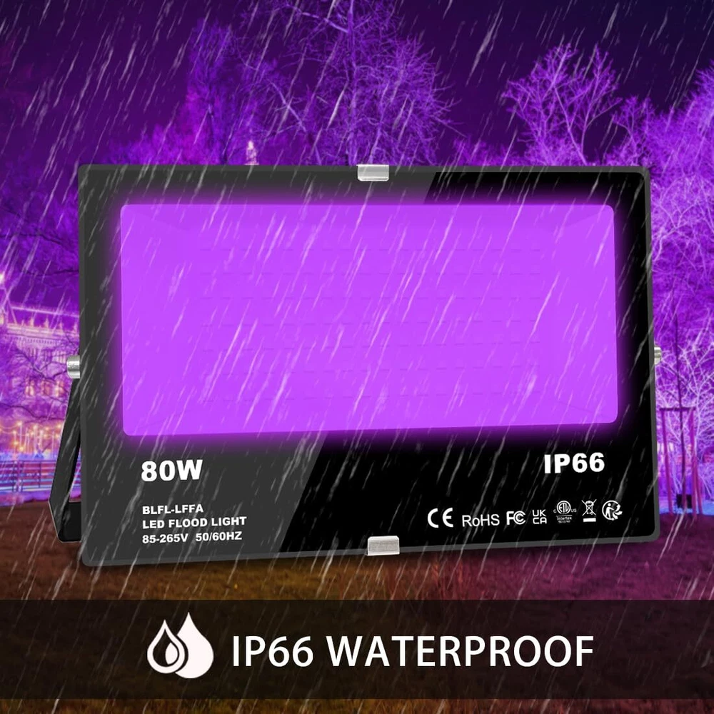 Note: LED Black Light The temperature of the case will rise accordingly after prolonged use (this is normal), please do not touch it directly with your hands. Specifications: Input: 85-265V Universal Power: 80W Wavelength: 390 -- 395 nm Beam Angle: 120° Wire Length: 1.8 Meters/5.9 ft Switch: Included Waterproof Rating: Yes, IP66 Waterproof (do not immerse it in water) Material: Aluminum + Tempered Glass Package Contents: LED Black Light x 2 User Manual x 2 【Powerful 80W Black Lights Outdoor】80W ,IP66, wavelength:390-395NM, US standard plug - 5.9Ft/1.8m cable (switch included). Combined with high power LED and special lens, the fluorescence effect is better. 【Black Lights for Glow Party Large Space】 Ideal for illuminating most reactive pigments, paints and dyes with black light. Especially with neon-colored objects, the blacklights work super cool for visible fluorescent materials. Perfect for Glow Party, Birthday Parties, Neon Party, Bars, Clubs, Painting, Stage Lighting, Aquarium, Gallery and Halloween Lighting. 【Mood Lighting and IP66 Waterproof 】The wavelength of 390-395nm does no harm to the human body, and the deep purple light it emits can be used for Atmosphere lighting, which is very suitable for haunted houses, Halloween decorations, etc. 【Curing effect 】Experiments have found that the blacklights has a surface curing effect on both curing glue and nail polish. When the light is 1-3cm away from the nail polish, it will cure within 2 seconds. When the light is 5-10cm away from the nail polish, it will cure within 5 seconds. 【 Metal Design and Efficient Cooling 】Special heat dissipation design on the back of the 80W black lights, With the qualified aluminum housing, it has a better heat dissipation performance which makes the light much more secure and durable. 【Aftersales Service】2-years-warranty. 90 days money back guarantee. High quality standard and friendly customer service. For any issues relating to the product, please do not hesitate to contact us.